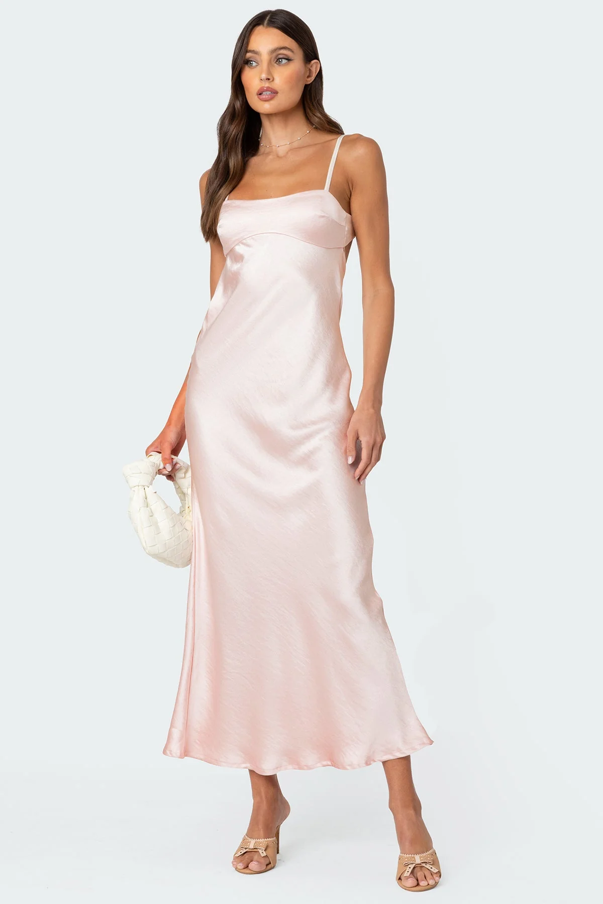 Indulge in luxury with our light pink satin maxi dress featuring an open back design, adjustable straps, and under bust stitching for a perfect fit. Made from high-quality polyester, this dress exudes elegance and charm. Feel like a star in this exquisite piece. Ideal for evening wear, formal events, and special occasions. Care for this stunning dress by washing it with similar colors to maintain its beauty and sheen.
