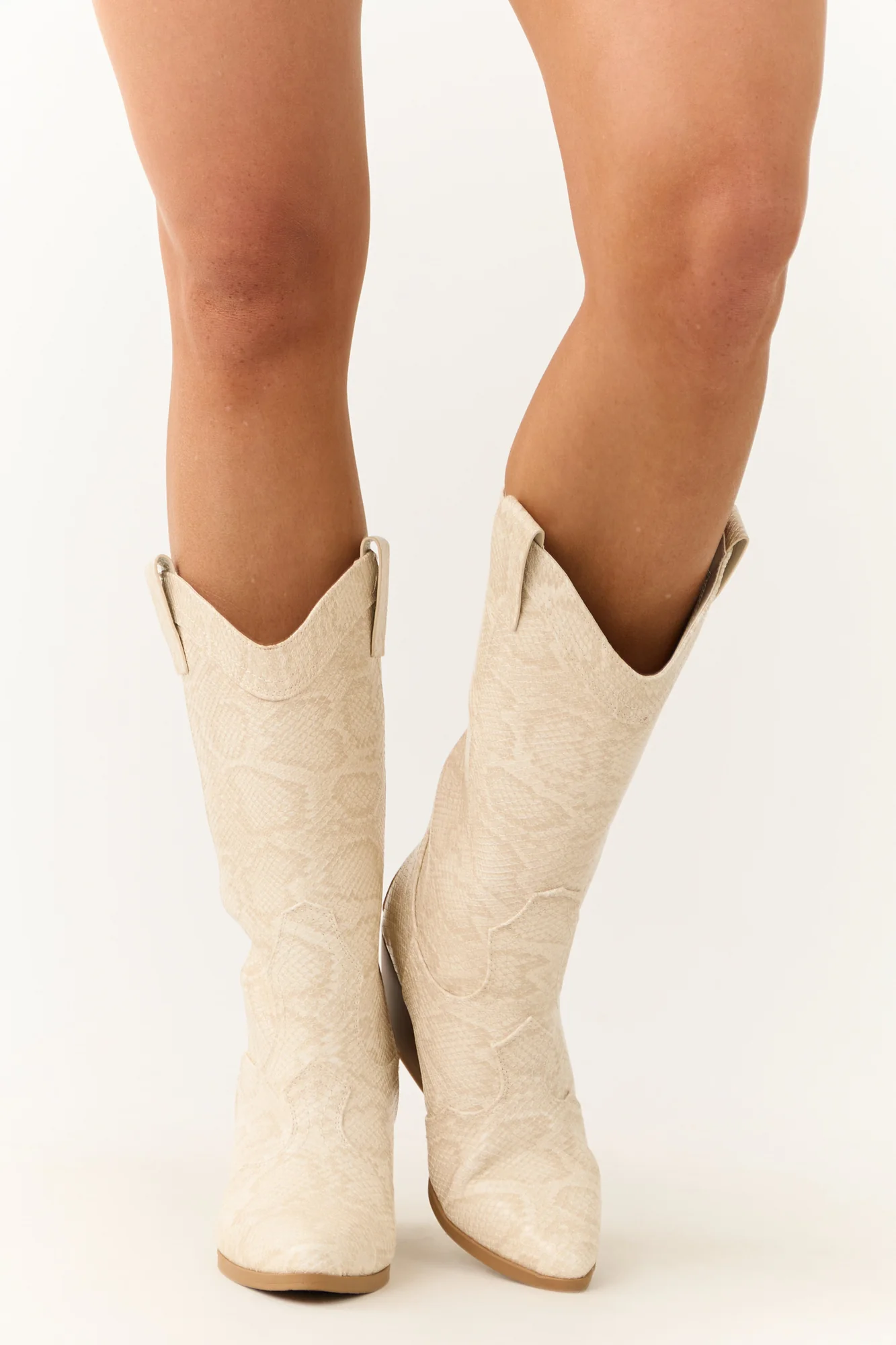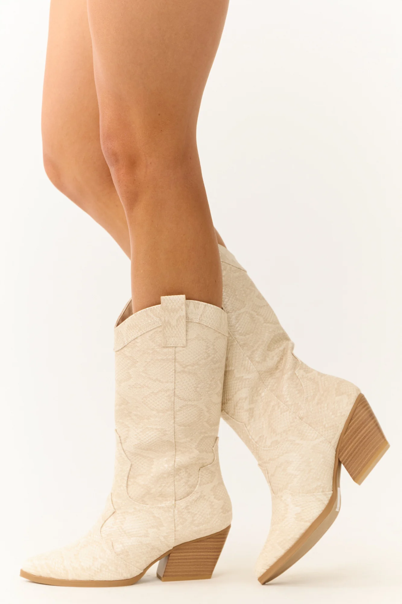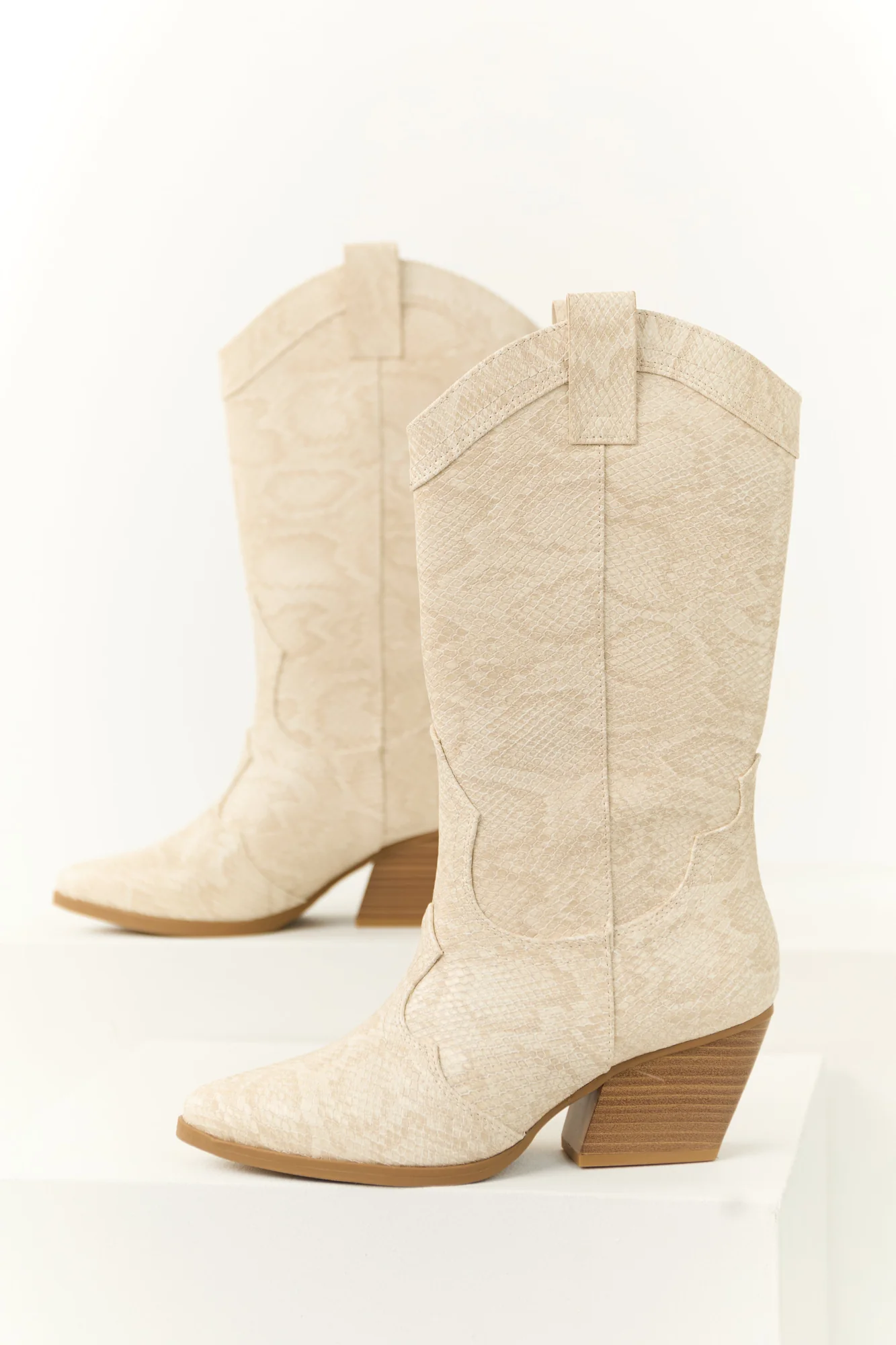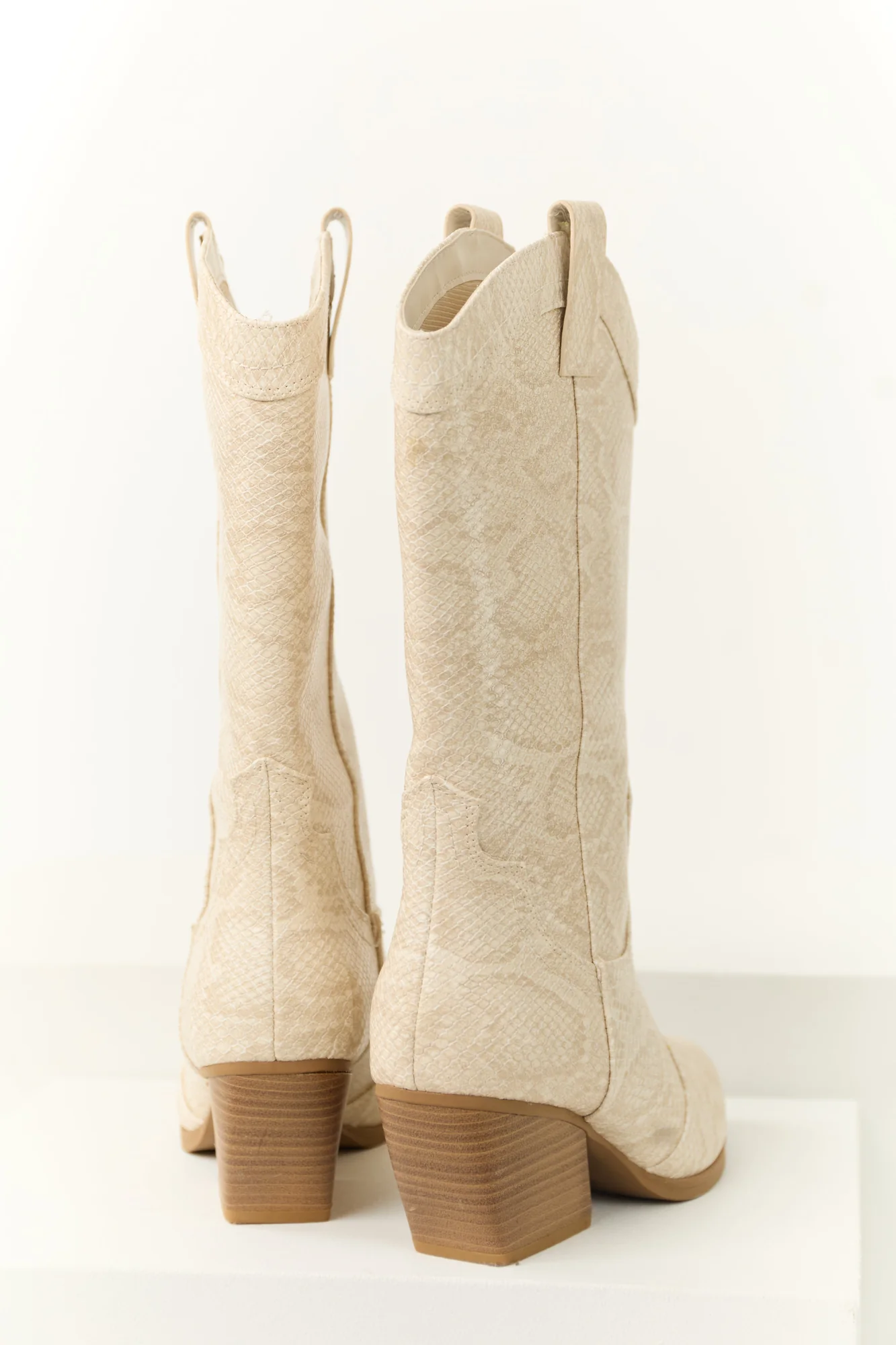 Discover style and comfort with our Light Taupe Snakeskin Pattern Western Boots for women. These faux leather boots feature a rubber sole, lightly cushioned insole, and a stacked block heel. With a pointed toe and unique curved opening, these boots boast both fashion and function. Complete with side pull tabs for easy wear, the pull-on style showcases a 13.5″ shaft, 15″ circumference, and 3″ heel. Imported and measured on size 8, these boots are a must-have in your wardrobe.