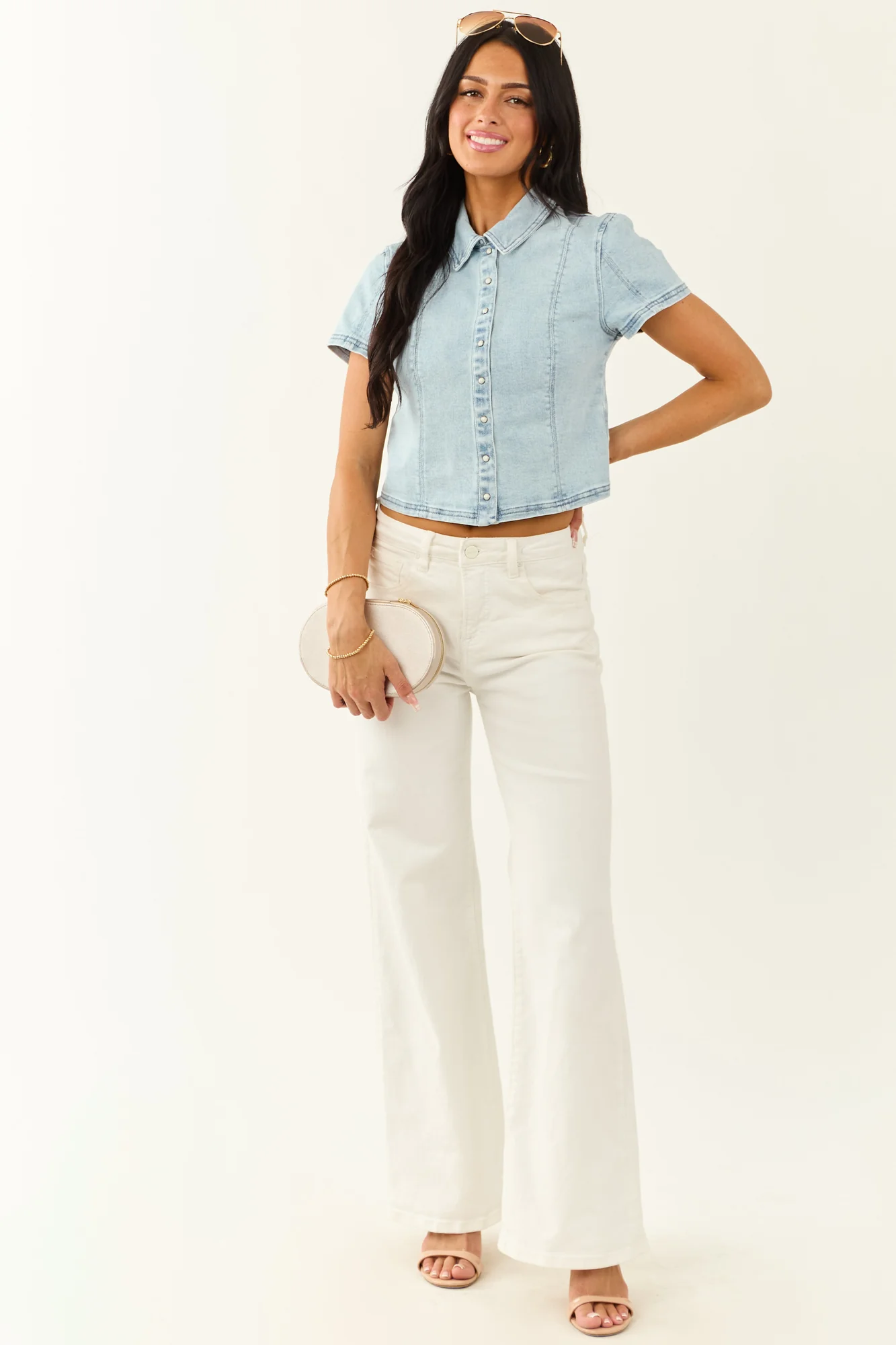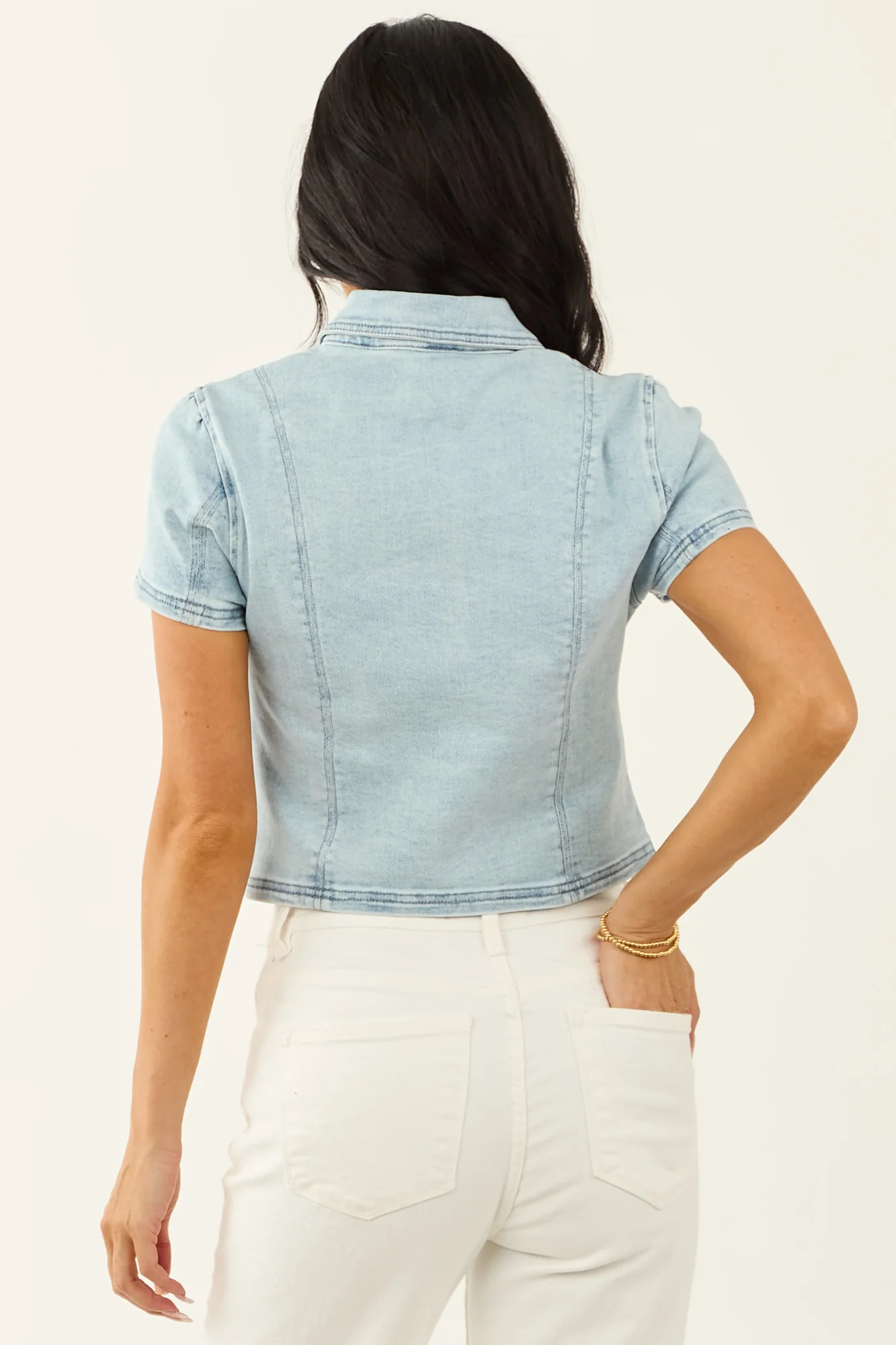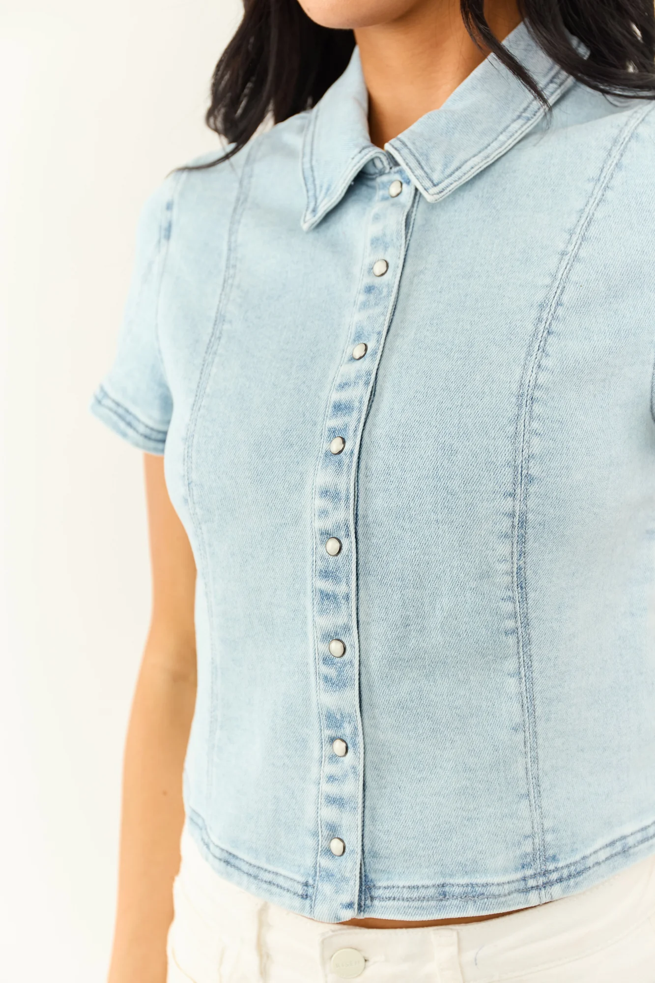 Upgrade your wardrobe with this laid-back denim top . Featuring snap closures, a collared neckline, and a slightly cropped design, this top is made of 93% Cotton, 6% Polyester, and 1% Spandex for a comfortable fit. Perfect for everyday wear. Available in sizes S, M, L, and XL. Bust: 36-39, Length: 19.5-20.25, Sleeve: 6.5-7. Model is wearing a size Small. Size 1, Height 59, Bust 34, Waist 26