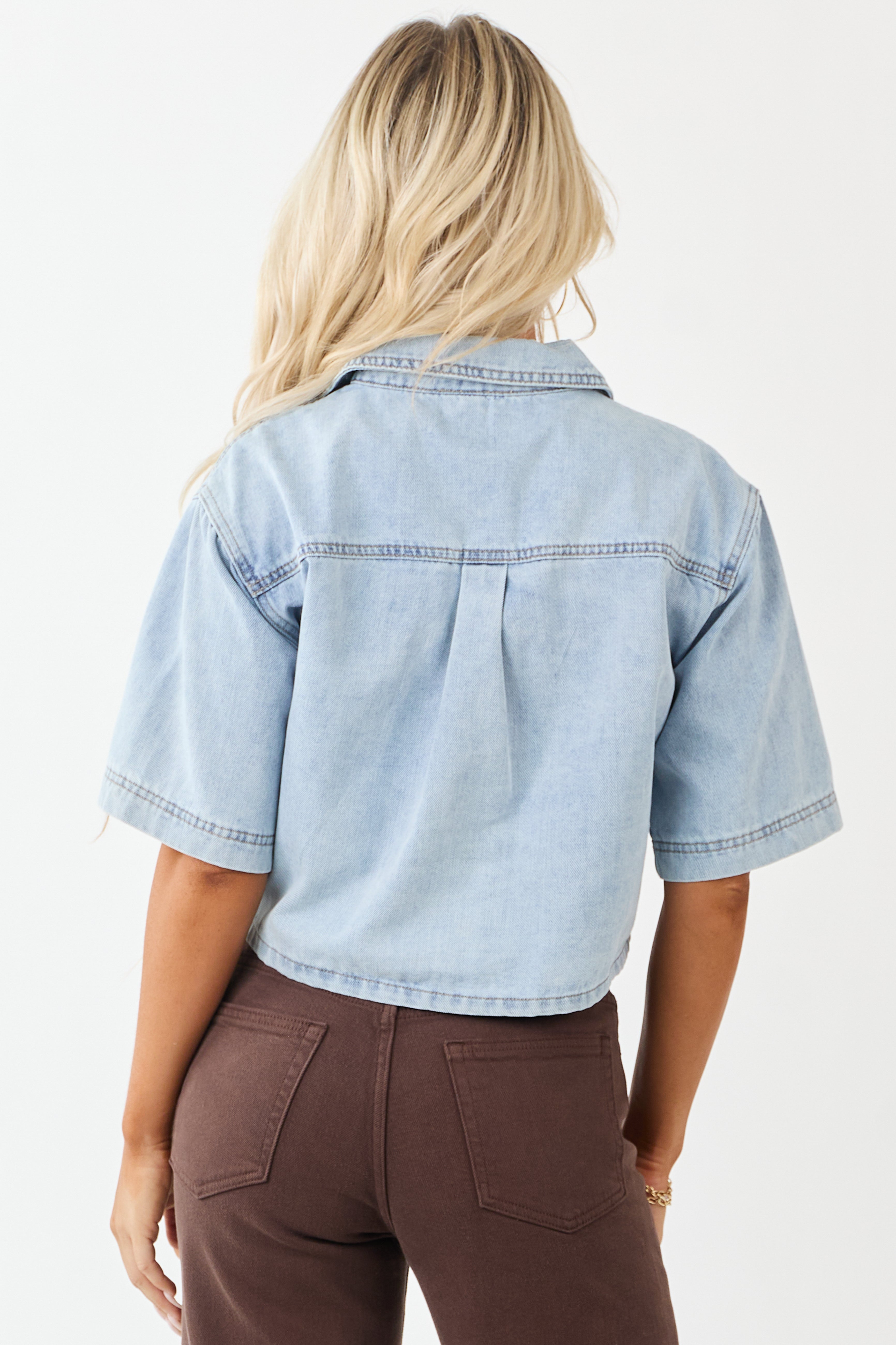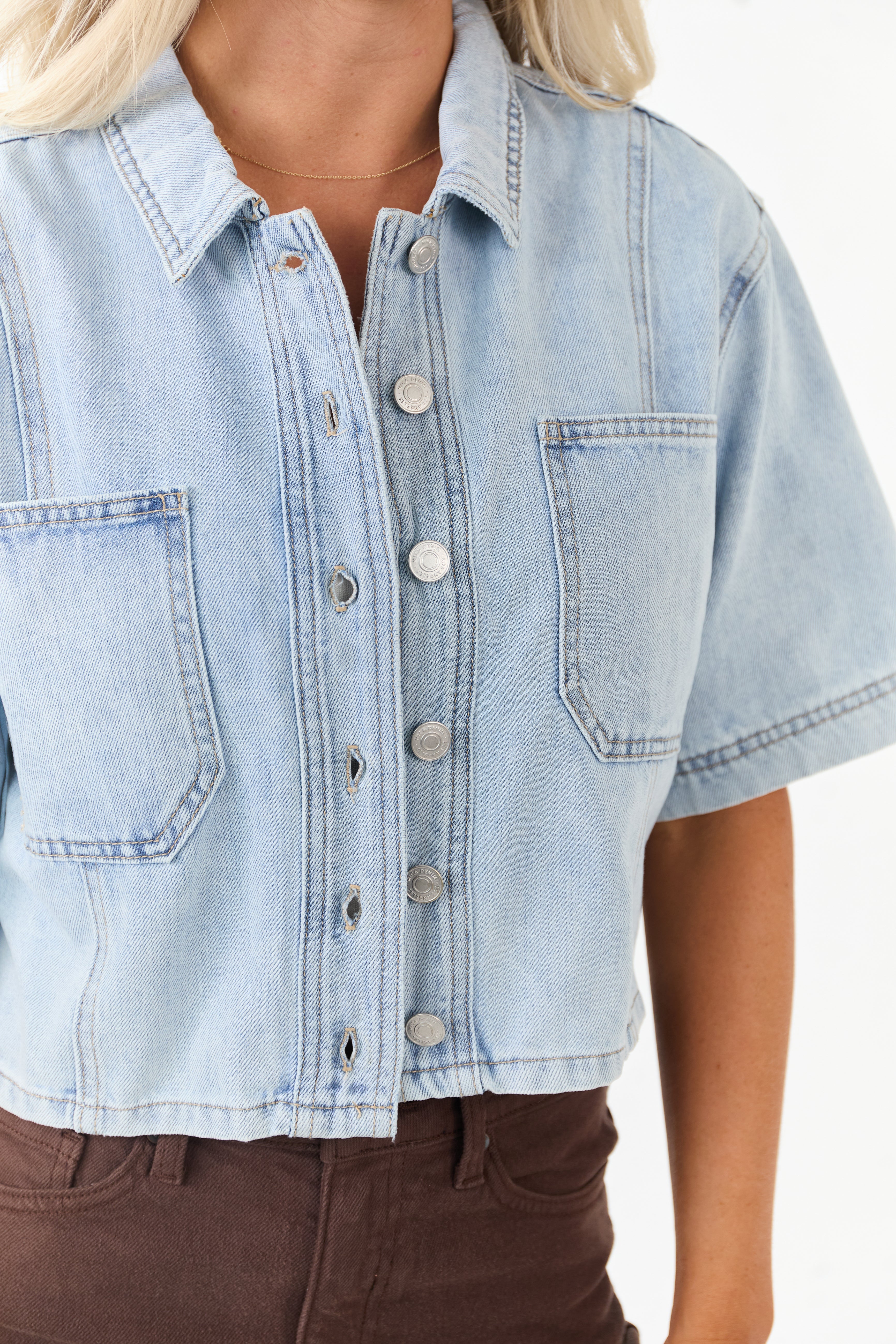 Experience timeless charm with our Light Wash Denim Button Down Boxy Top. Crafted from non-stretchy denim, this top features a structured fit with a semi-cropped length, chest pockets, and a classic button-down front. Made from 74% Cotton and 26% Polyester, it offers a polished yet casual look perfect for various occasions. Embrace the comfort and style of this top and elevate your wardrobe effortlessly.