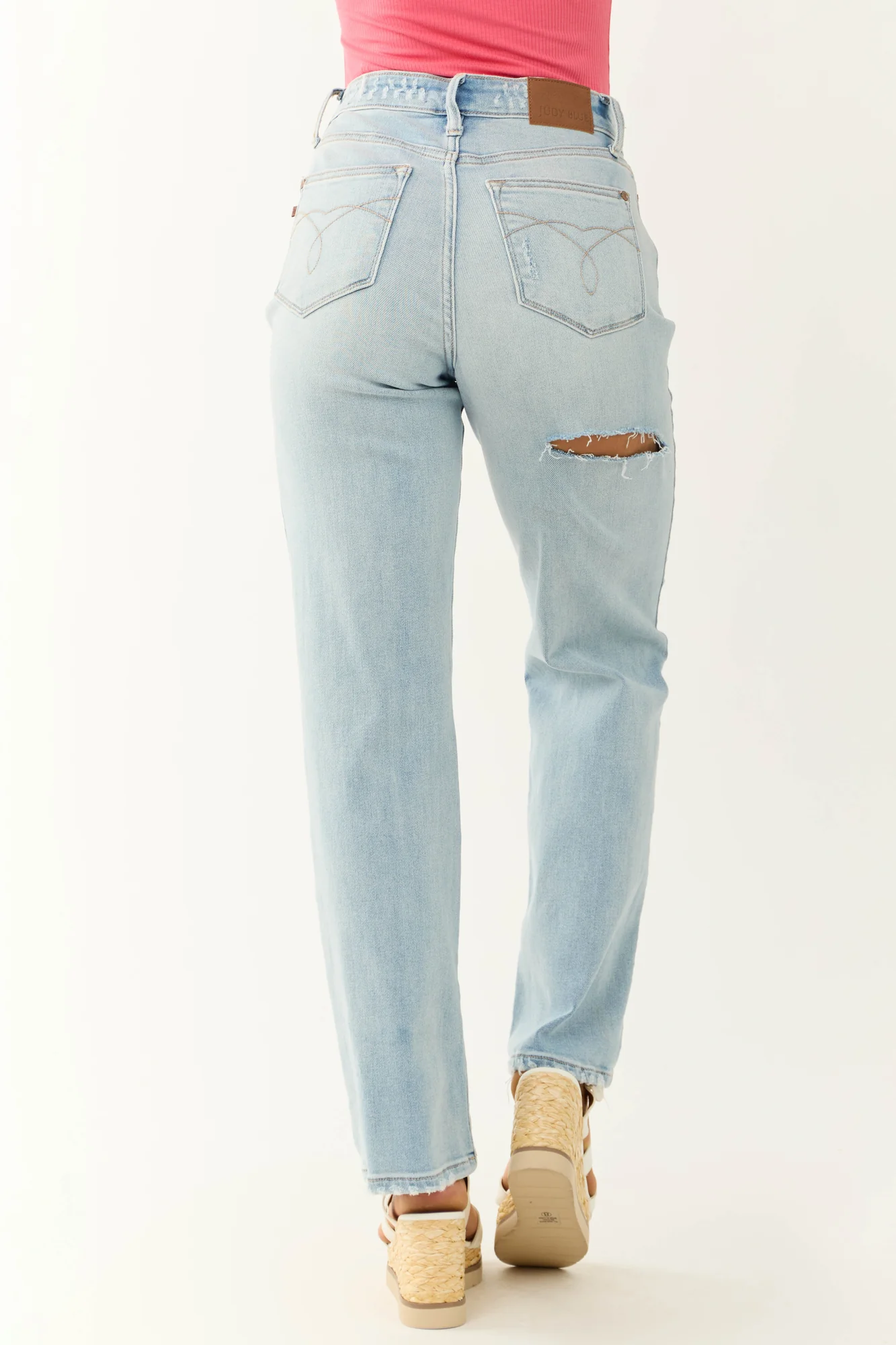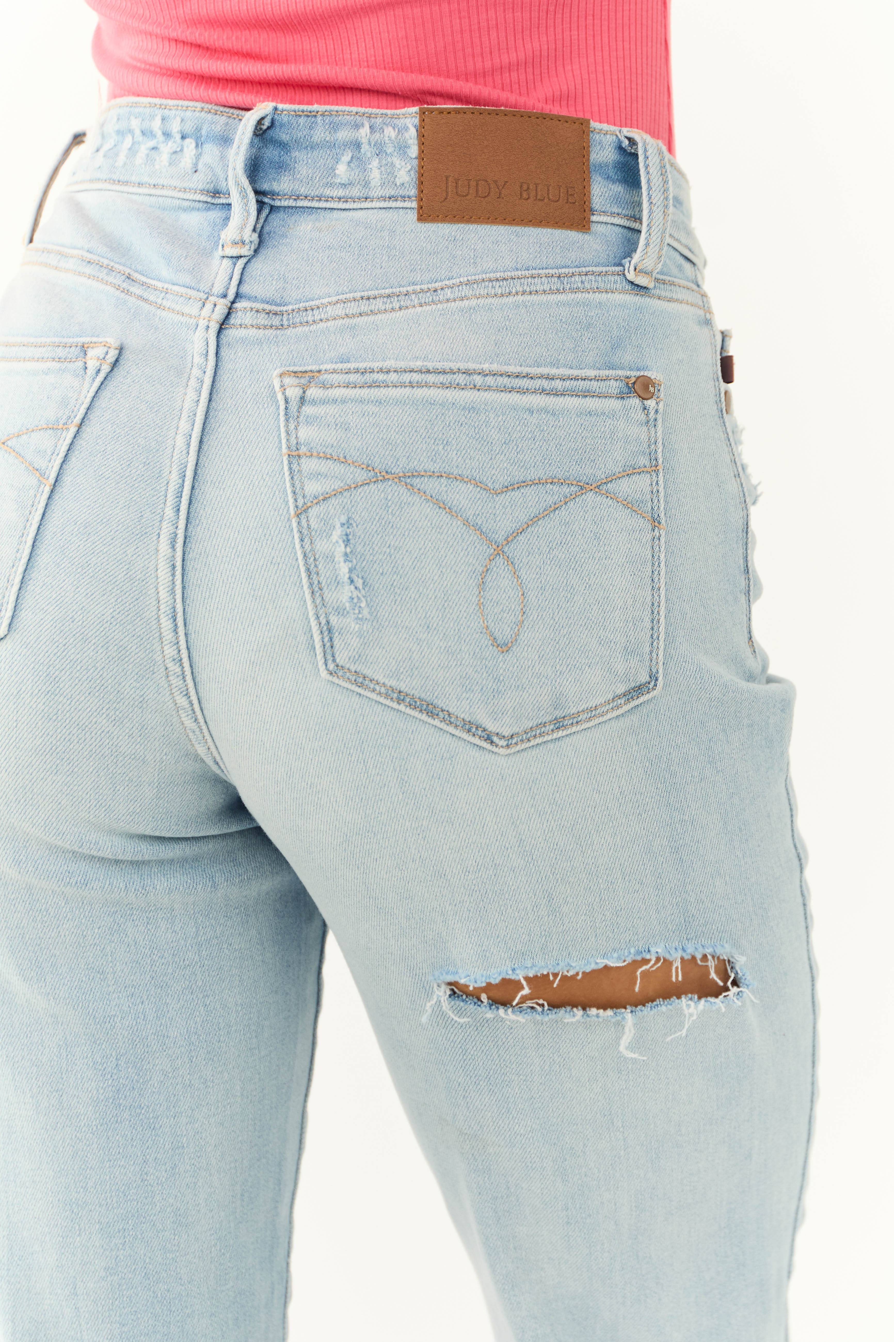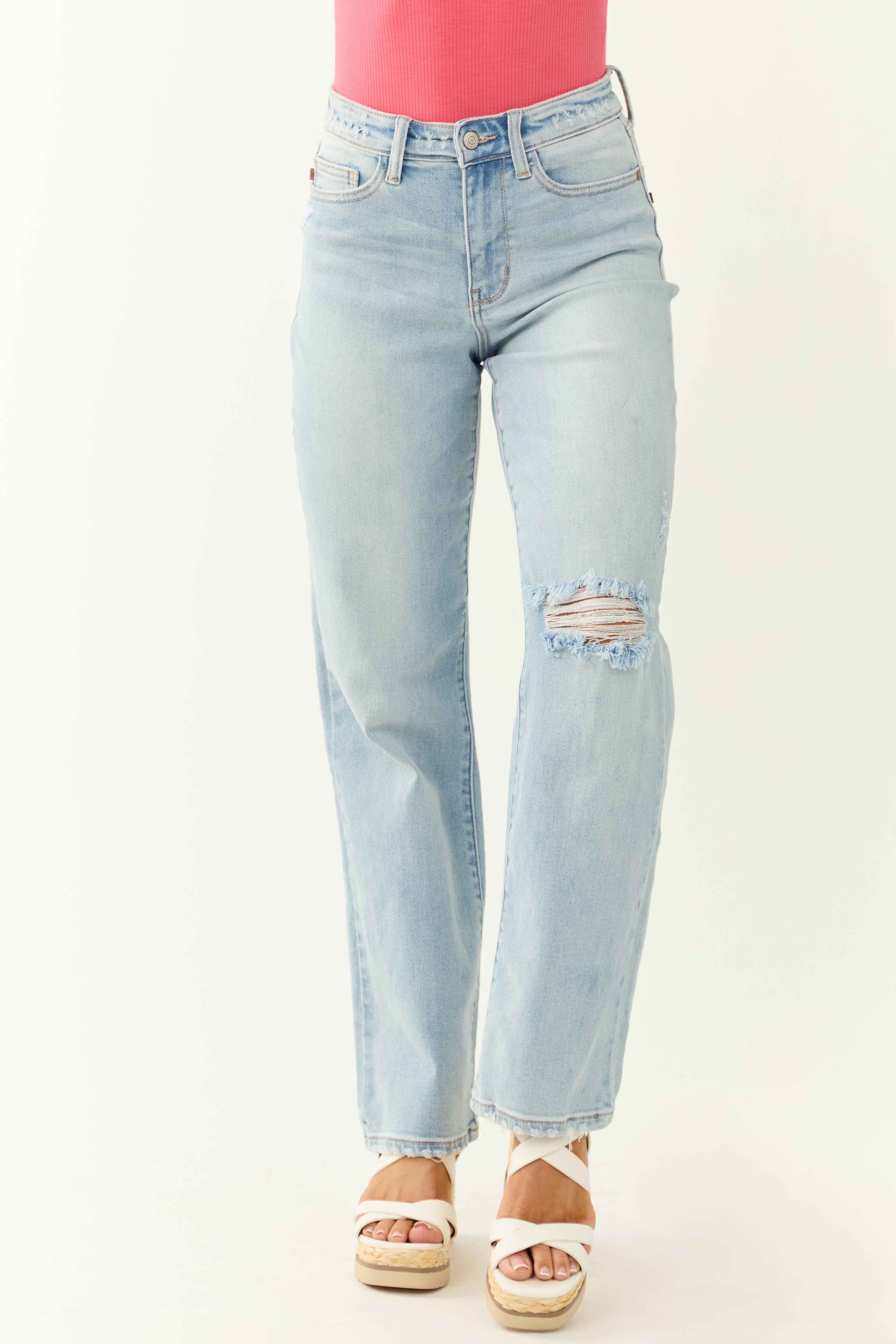 Update your denim collection with these Light Wash Distressed High Waisted Wide Leg Jeans. Crafted from stretchy denim for a comfortable fit, these jeans feature a zipper fly with button closure, belt loops, and a stylish distressed hem. The high waist design elongates your silhouette, while the five functional pockets add practicality. Whether youre out running errands or enjoying a casual day out, these jeans offer both style and versatility. Care Instructions: Machine wash cold, tumble dry low, cool iron as needed. Available in sizes 0 through 15.