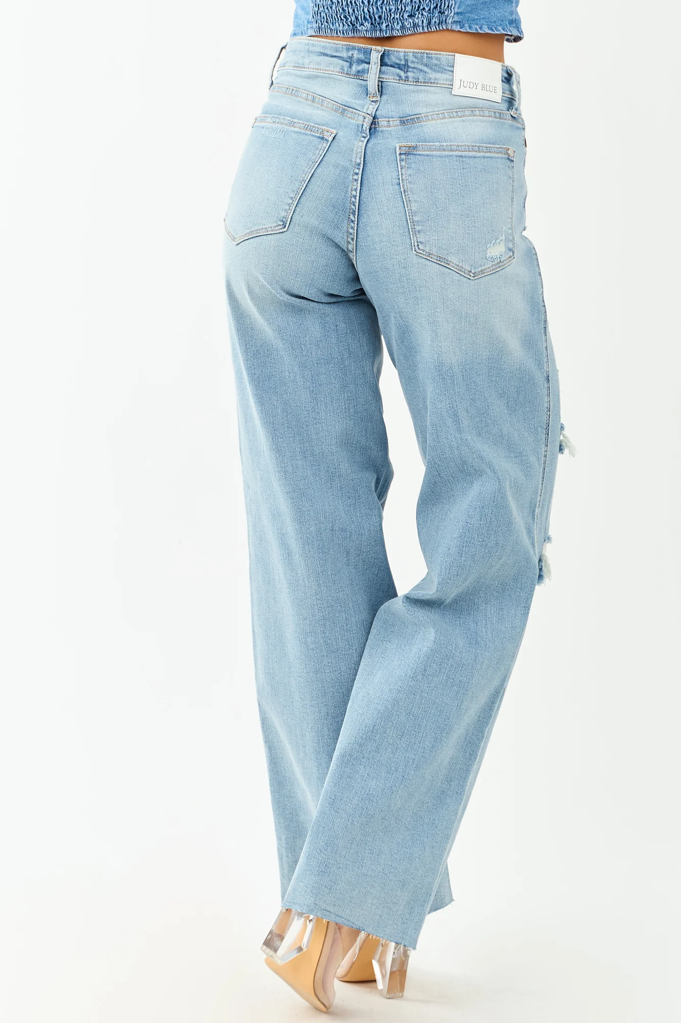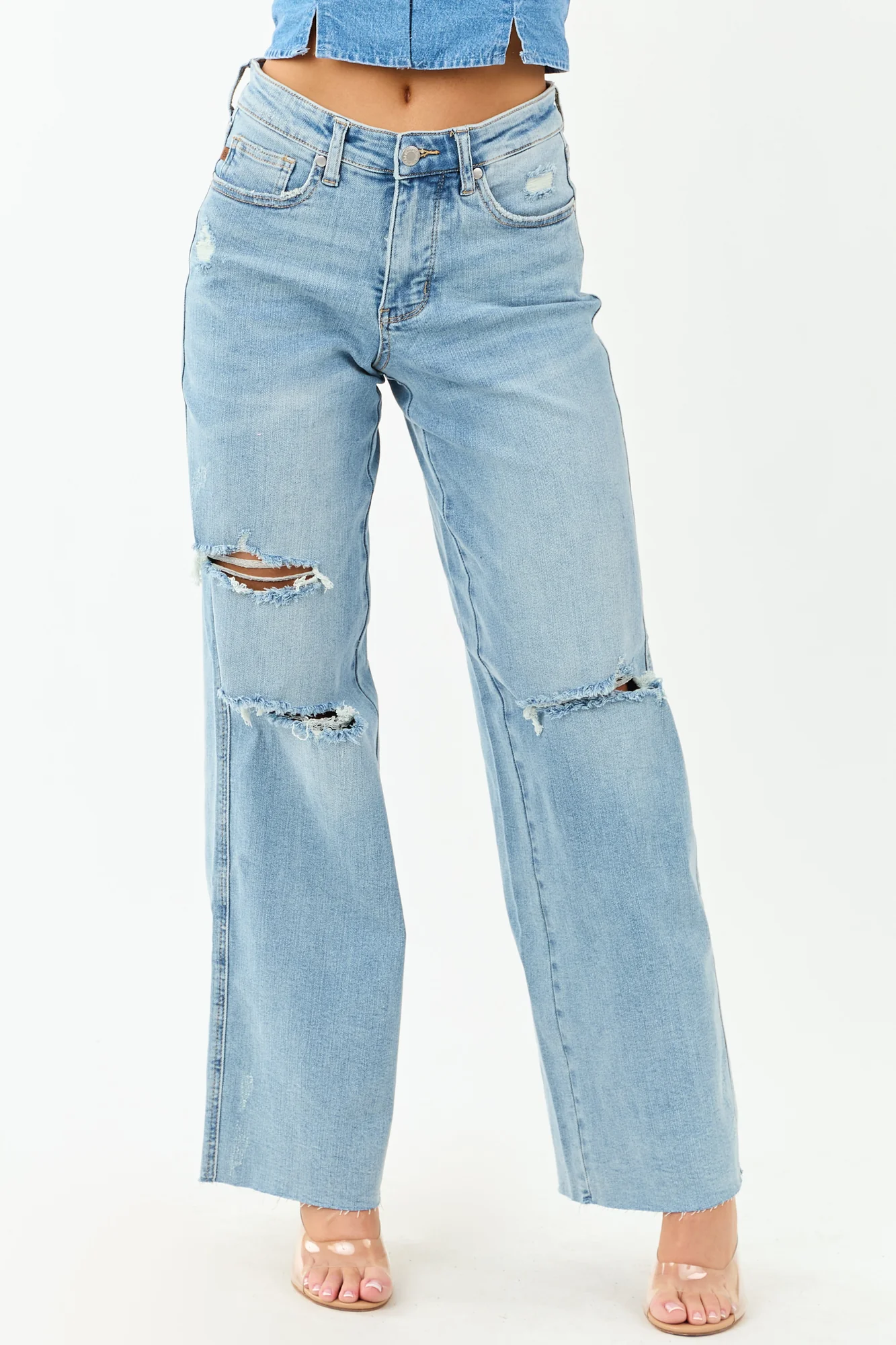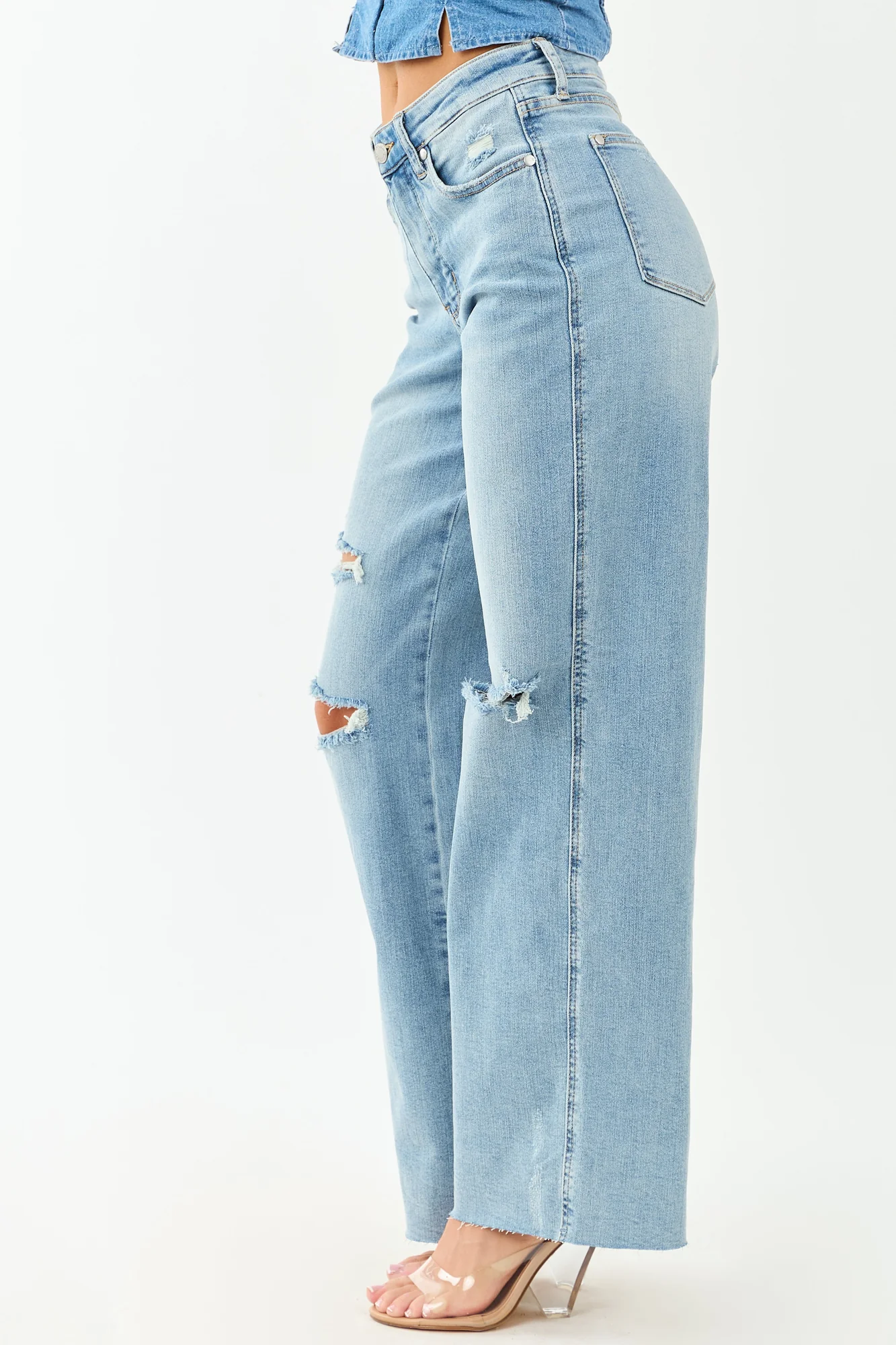 Elevate your wardrobe with our tummy control high rise jeans in a light wash denim. These wide leg jeans feature a relaxed fit, 10″ front rise and 15″ back rise, and 32.5″ inseam. Crafted from 91% Cotton, 7% Polyester, and 2% Spandex, they offer a perfect stretch for comfort. The raw hem and distressing accents on pockets and knees add a trendy touch to your look. With five pockets, zipper fly, and belt loops, these jeans blend style with functionality. Stand out with this tall length piece that brings both versatility and fashion to your everyday outfits. Model in size 3/26, measures 57″ tall with 34″ bust and 26″ waist.