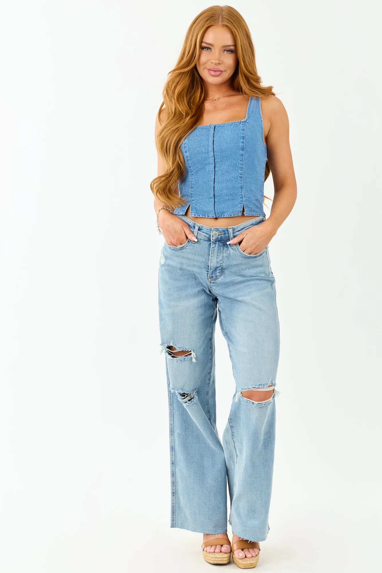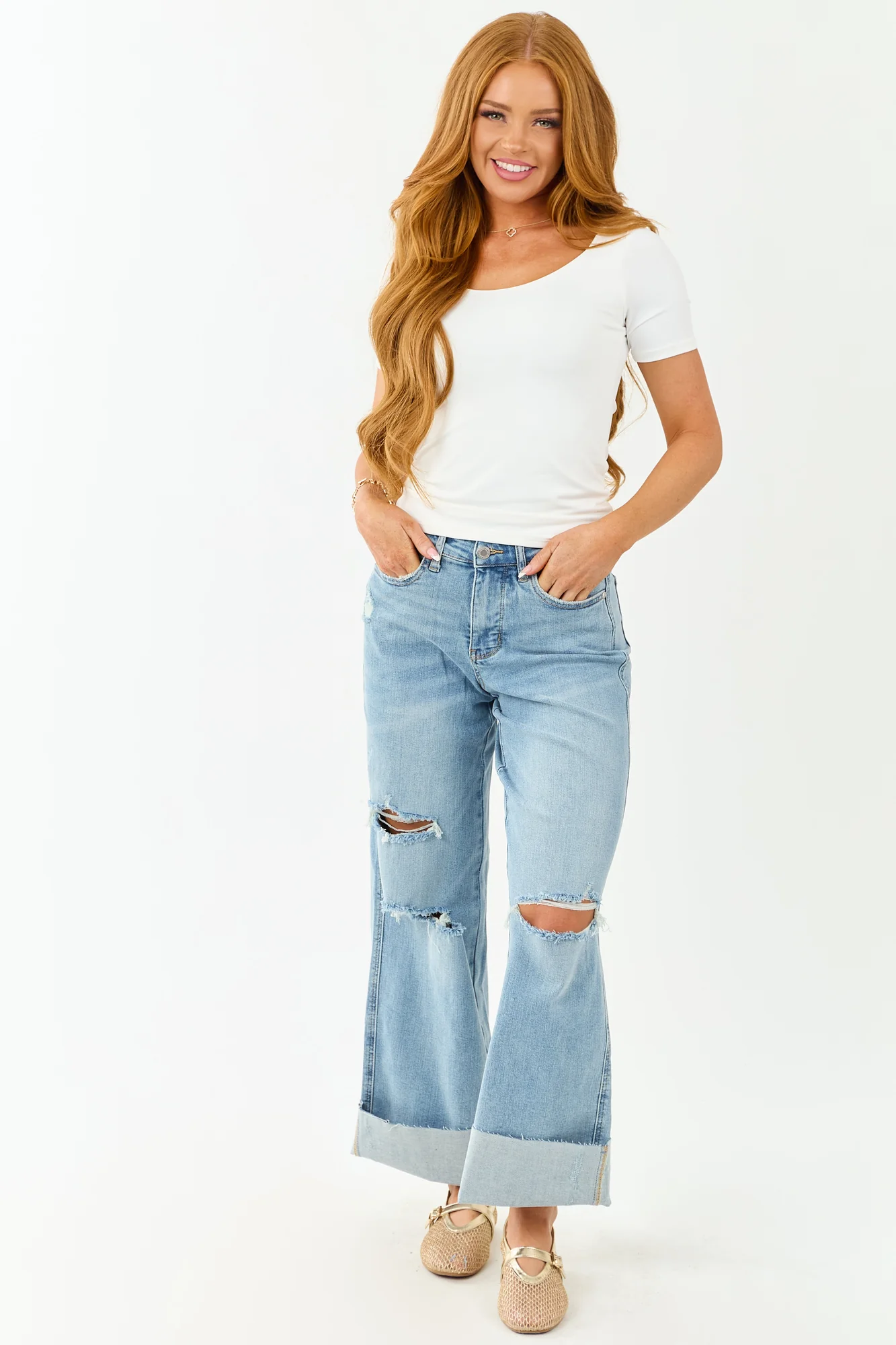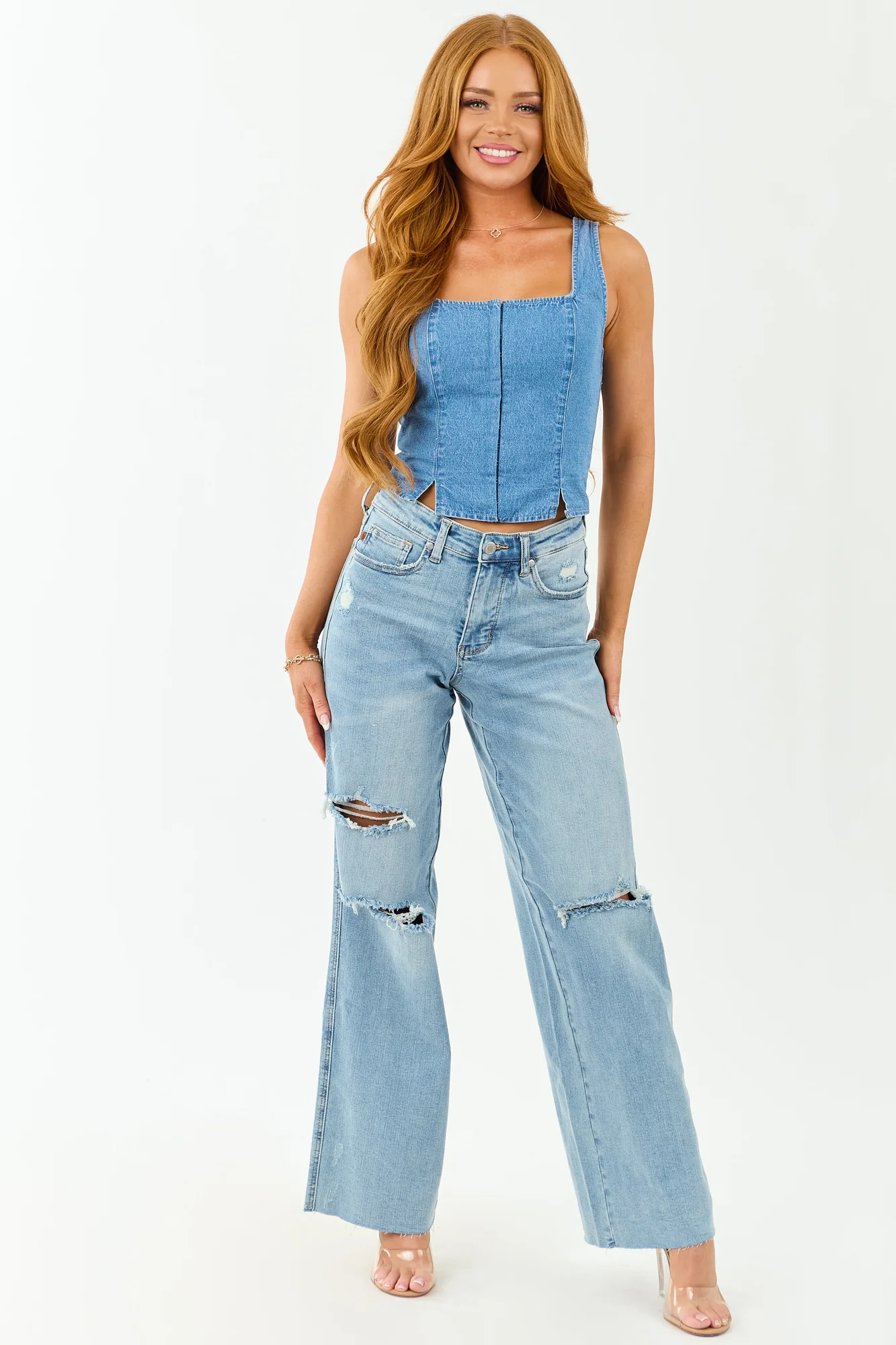 Elevate your wardrobe with our tummy control high rise jeans in a light wash denim. These wide leg jeans feature a relaxed fit, 10″ front rise and 15″ back rise, and 32.5″ inseam. Crafted from 91% Cotton, 7% Polyester, and 2% Spandex, they offer a perfect stretch for comfort. The raw hem and distressing accents on pockets and knees add a trendy touch to your look. With five pockets, zipper fly, and belt loops, these jeans blend style with functionality. Stand out with this tall length piece that brings both versatility and fashion to your everyday outfits. Model in size 3/26, measures 57″ tall with 34″ bust and 26″ waist.