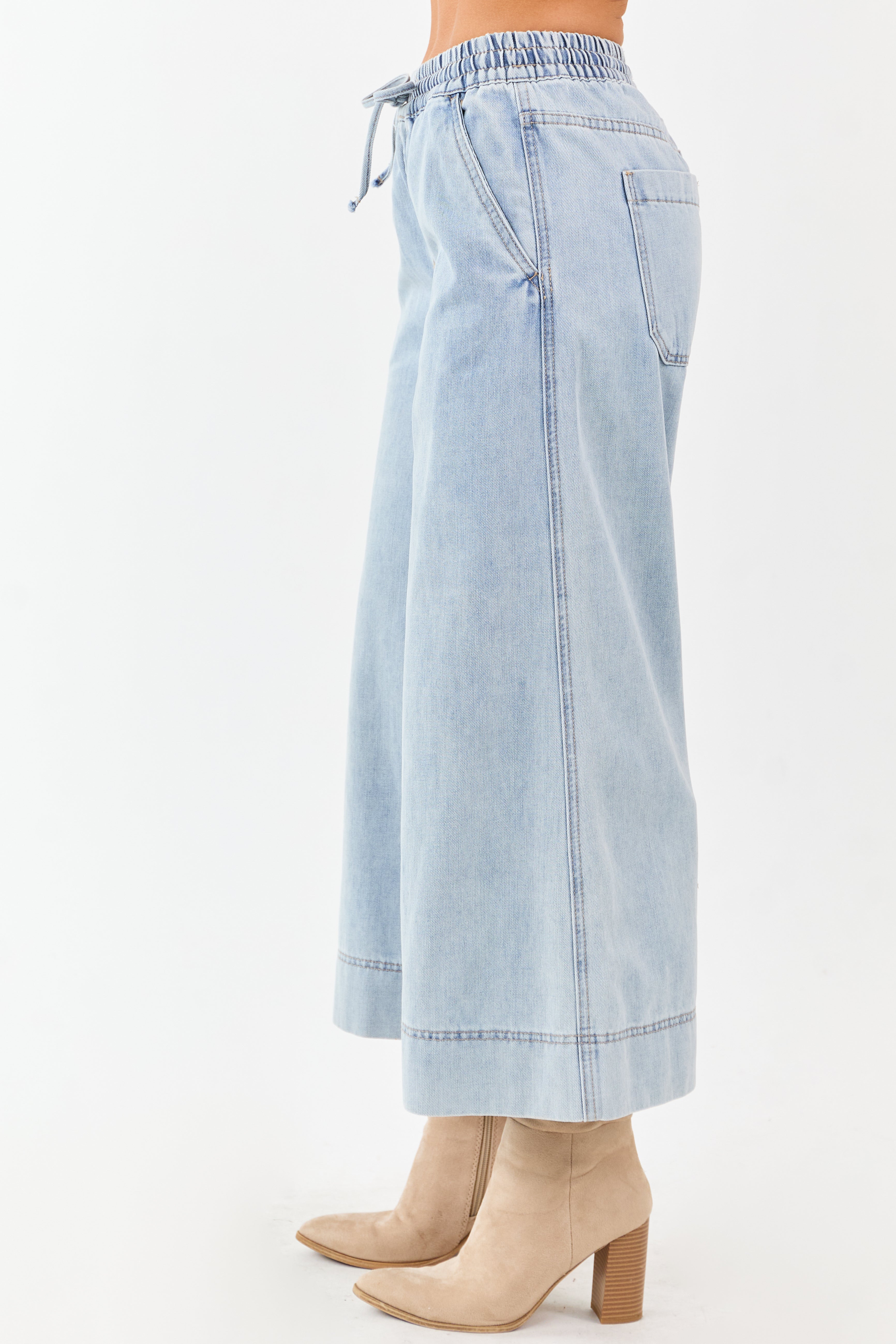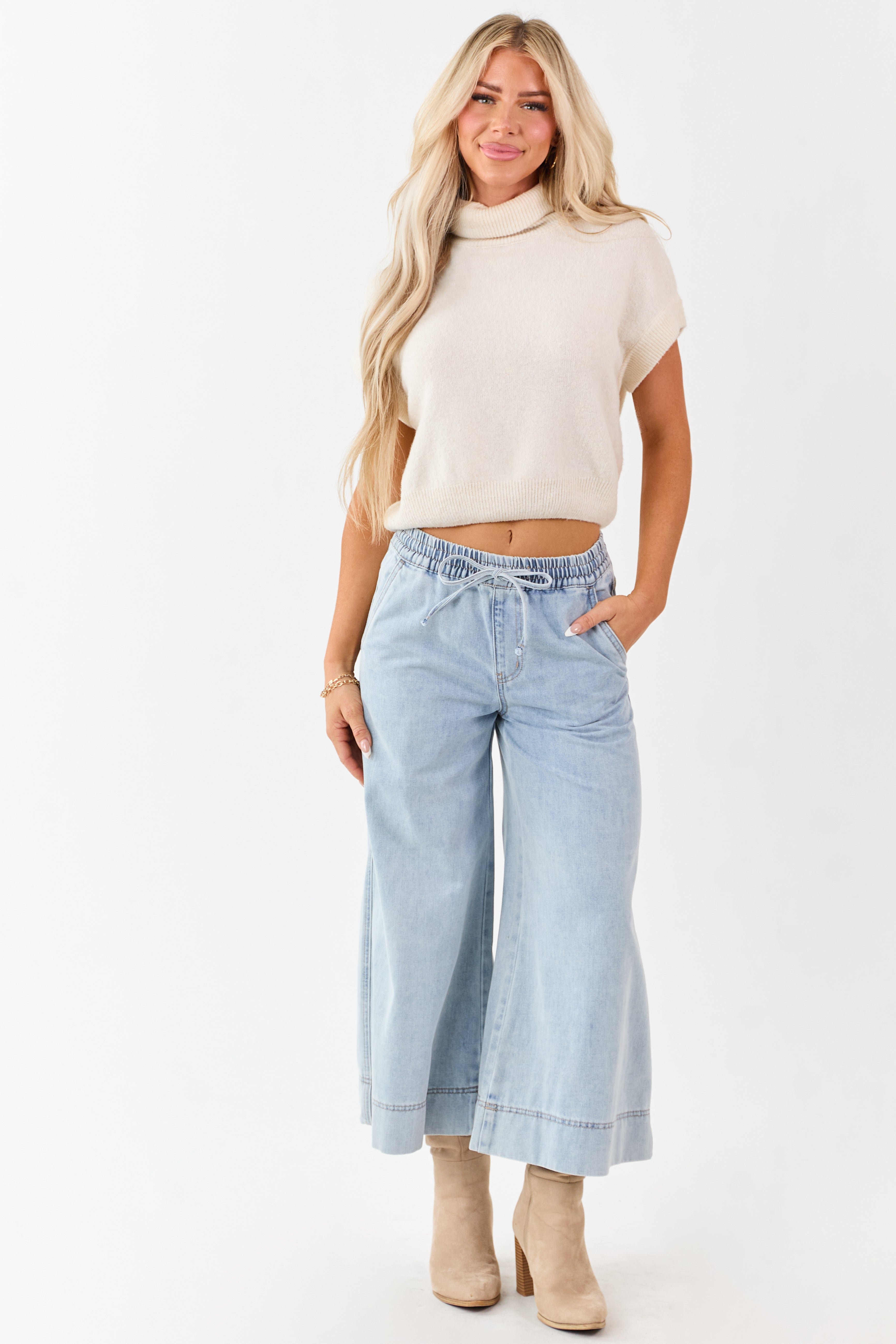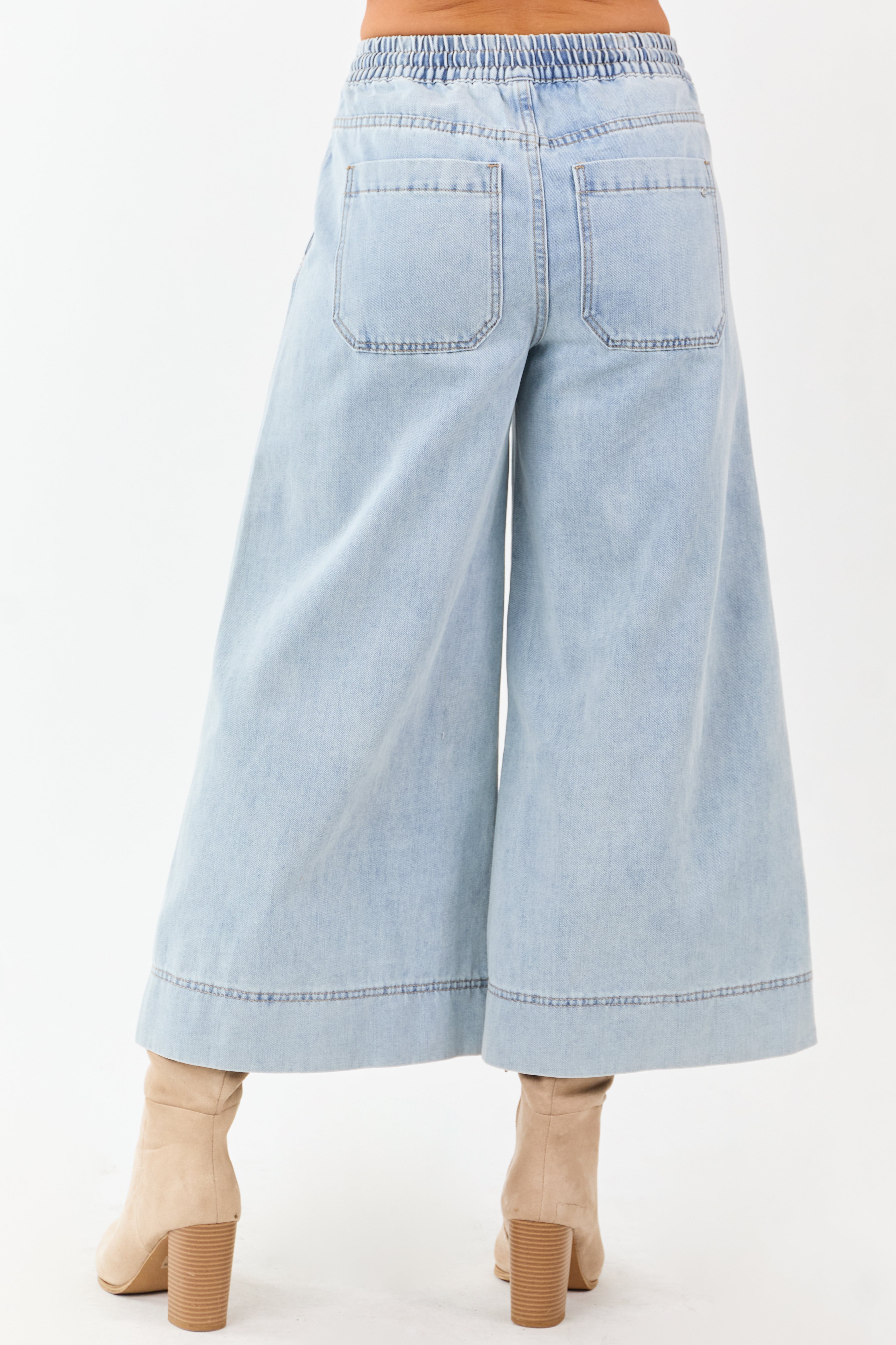 Experience casual comfort in these breezy light wash capri denim jeans featuring a smocked drawstring waist for a perfect fit. Ideal for autumn outings and relaxed occasions, these non-stretchy lightweight jeans offer a high-rise look with a stretchy smocked waistband and adjustable drawstring. With a cropped style, four pockets, and inseam of 24″, these jeans are made of 74% Cotton and 26% Polyester. Imported. Model wears size Small (Waist: 28″, Hip: 42″). Models measurements: Size 3, Height 57″, Bust 35″, Waist 26″.