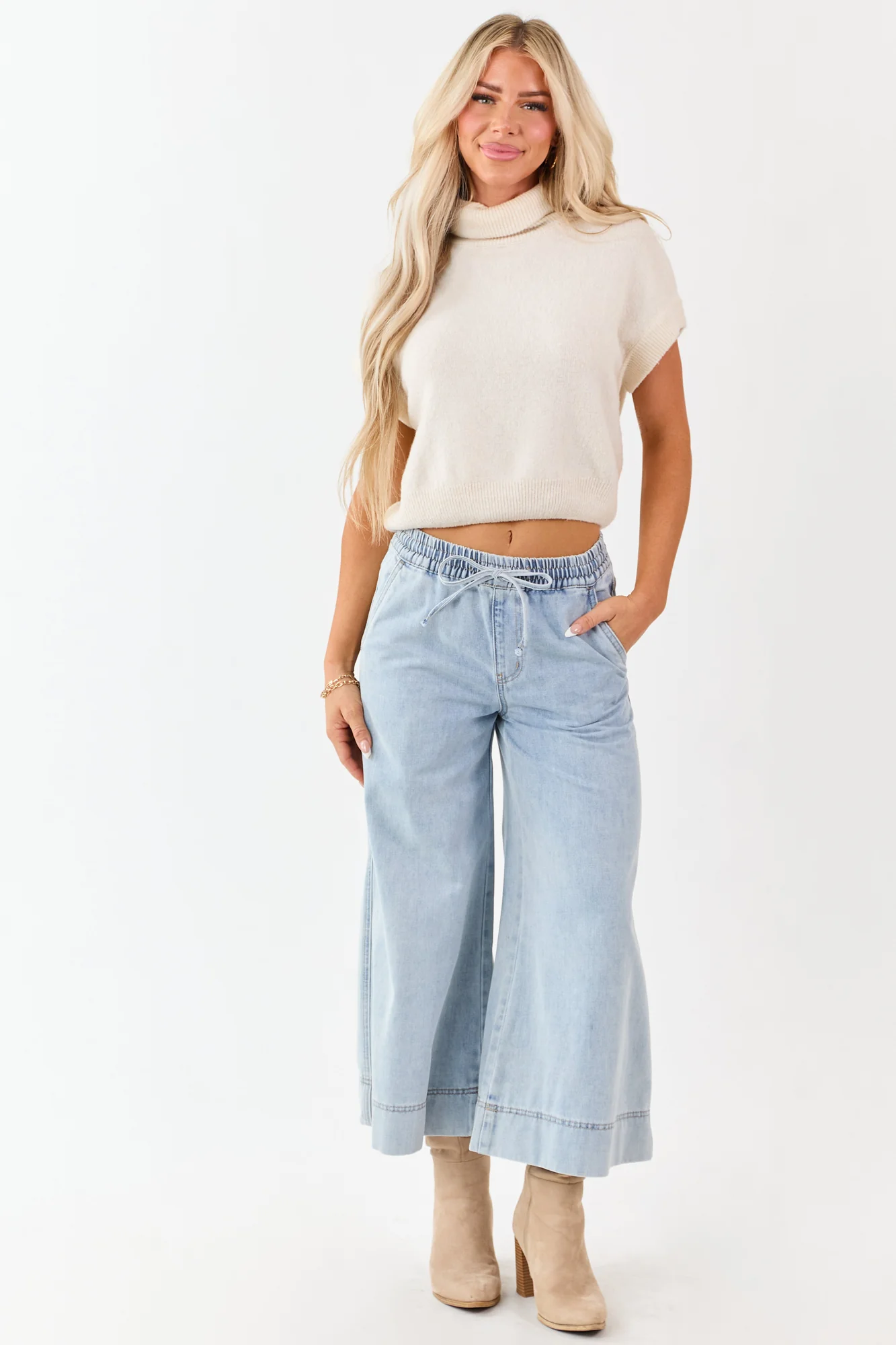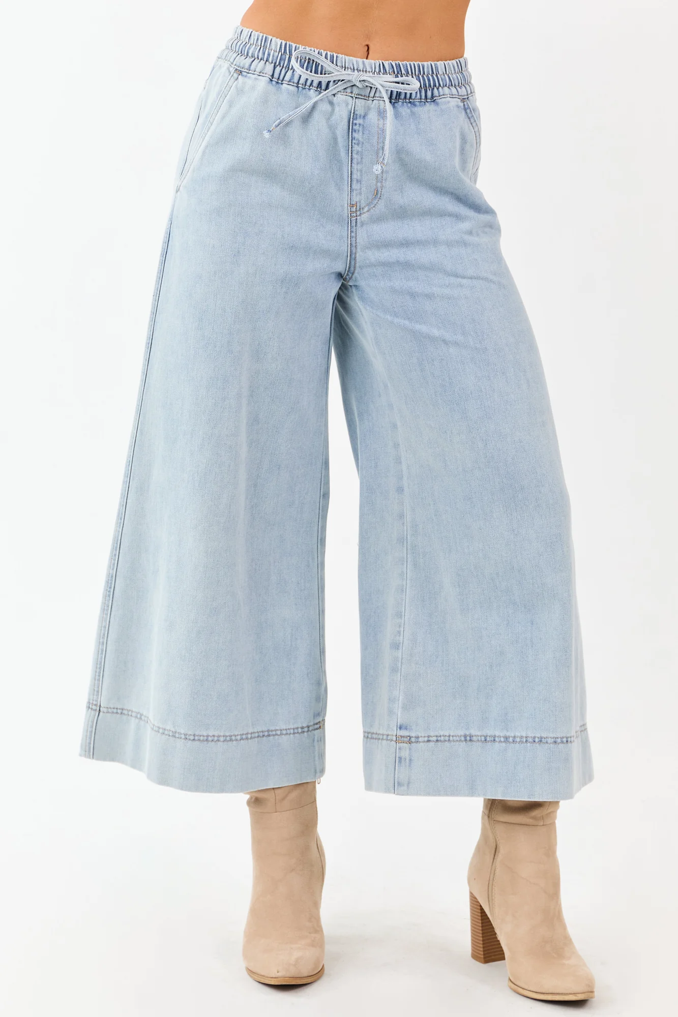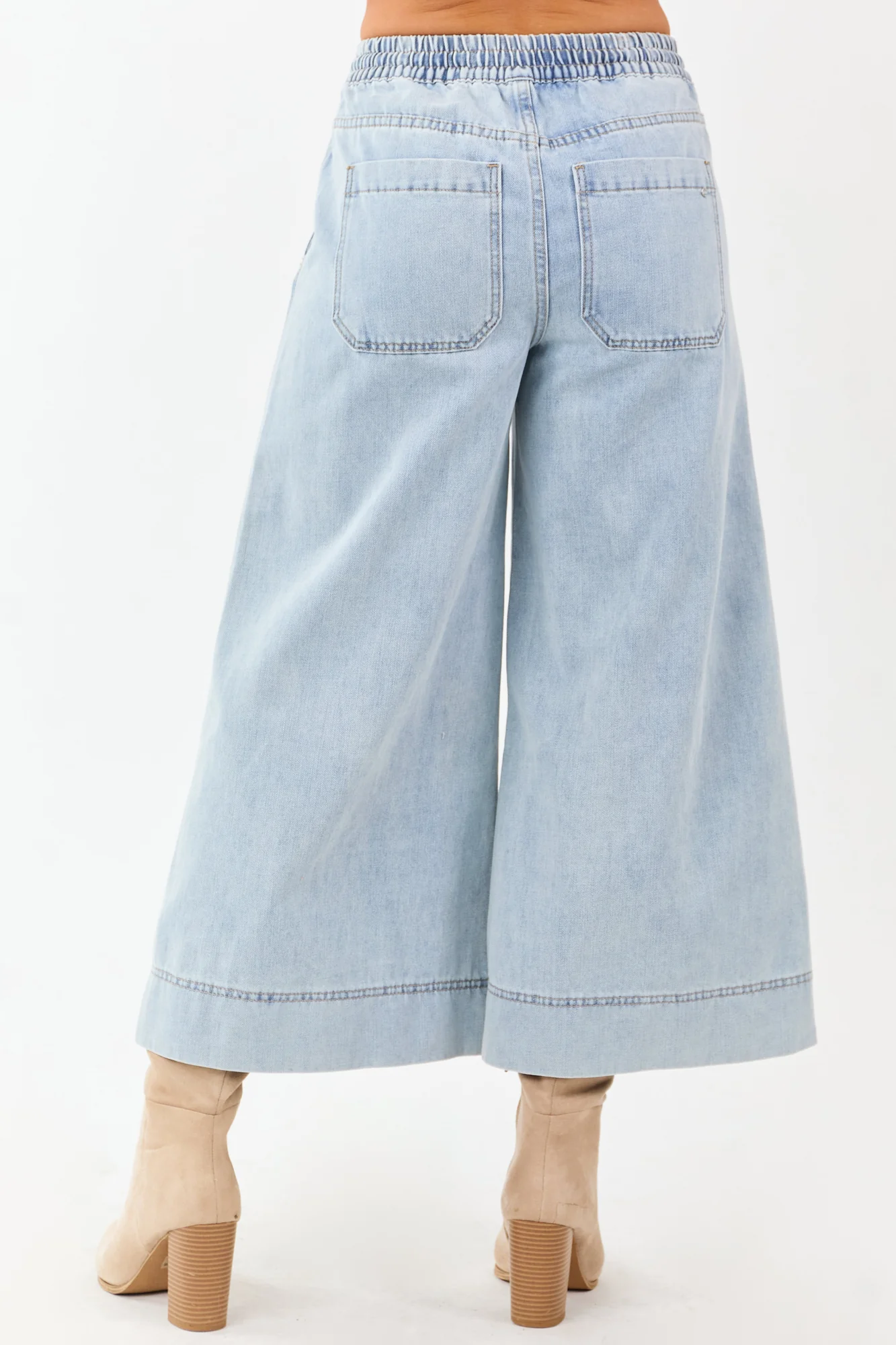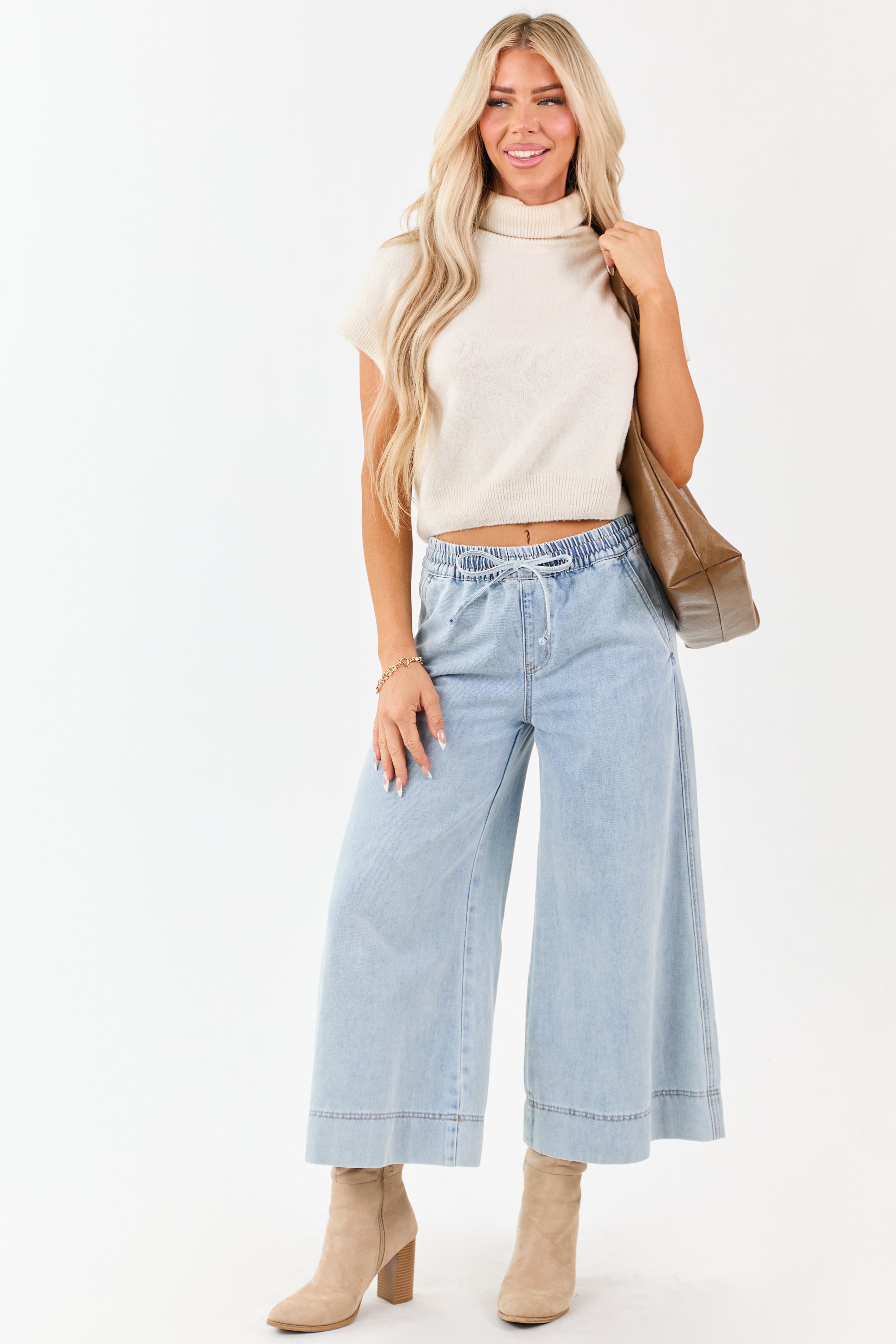 Experience casual comfort in these breezy light wash capri denim jeans featuring a smocked drawstring waist for a perfect fit. Ideal for autumn outings and relaxed occasions, these non-stretchy lightweight jeans offer a high-rise look with a stretchy smocked waistband and adjustable drawstring. With a cropped style, four pockets, and inseam of 24″, these jeans are made of 74% Cotton and 26% Polyester. Imported. Model wears size Small (Waist: 28″, Hip: 42″). Models measurements: Size 3, Height 57″, Bust 35″, Waist 26″.