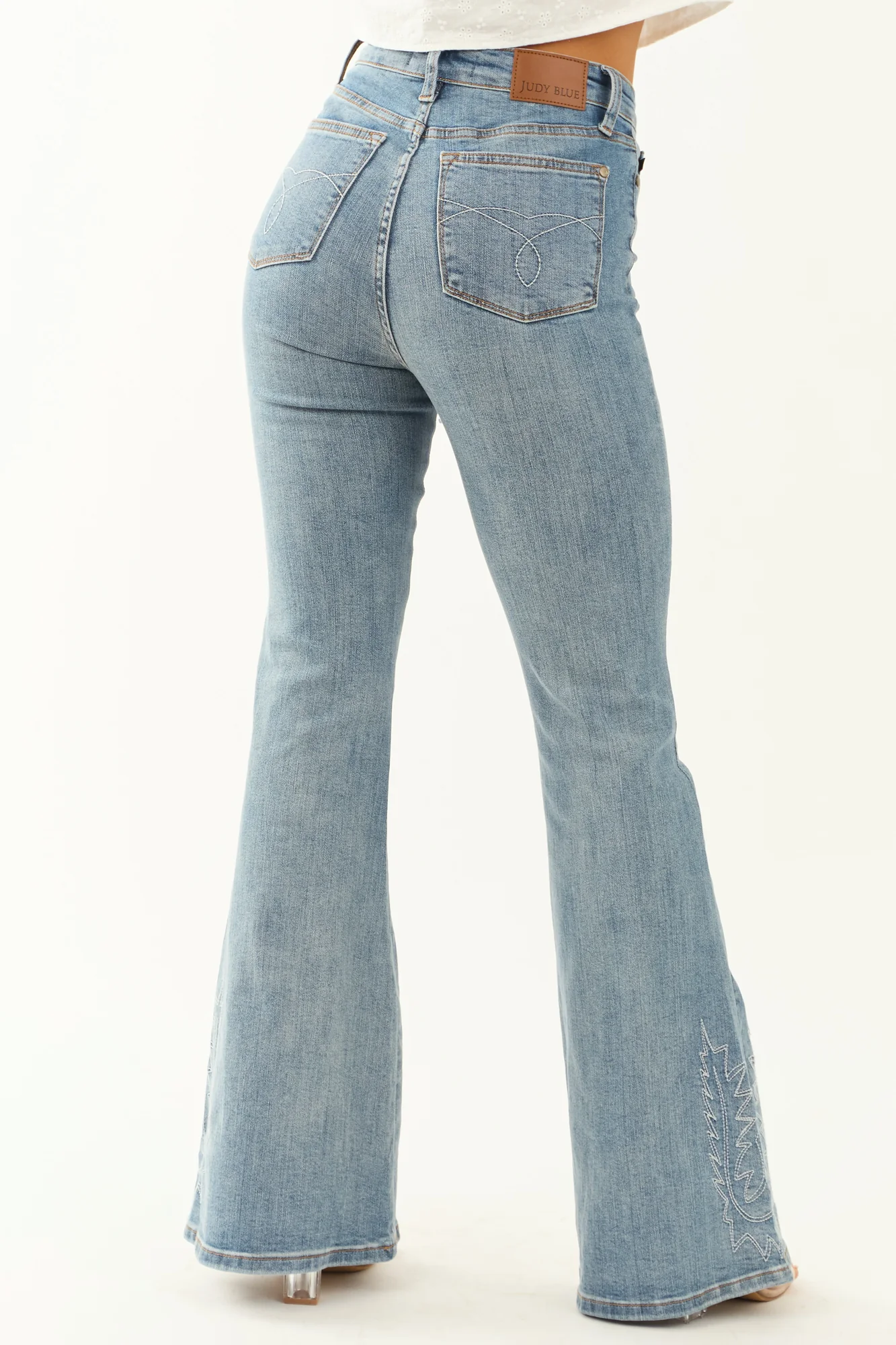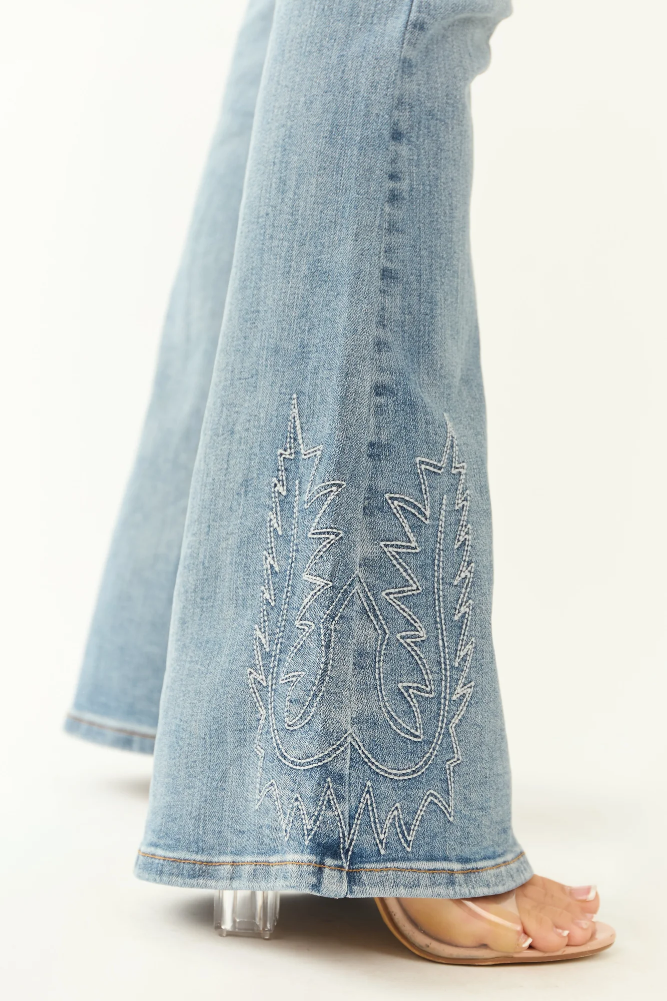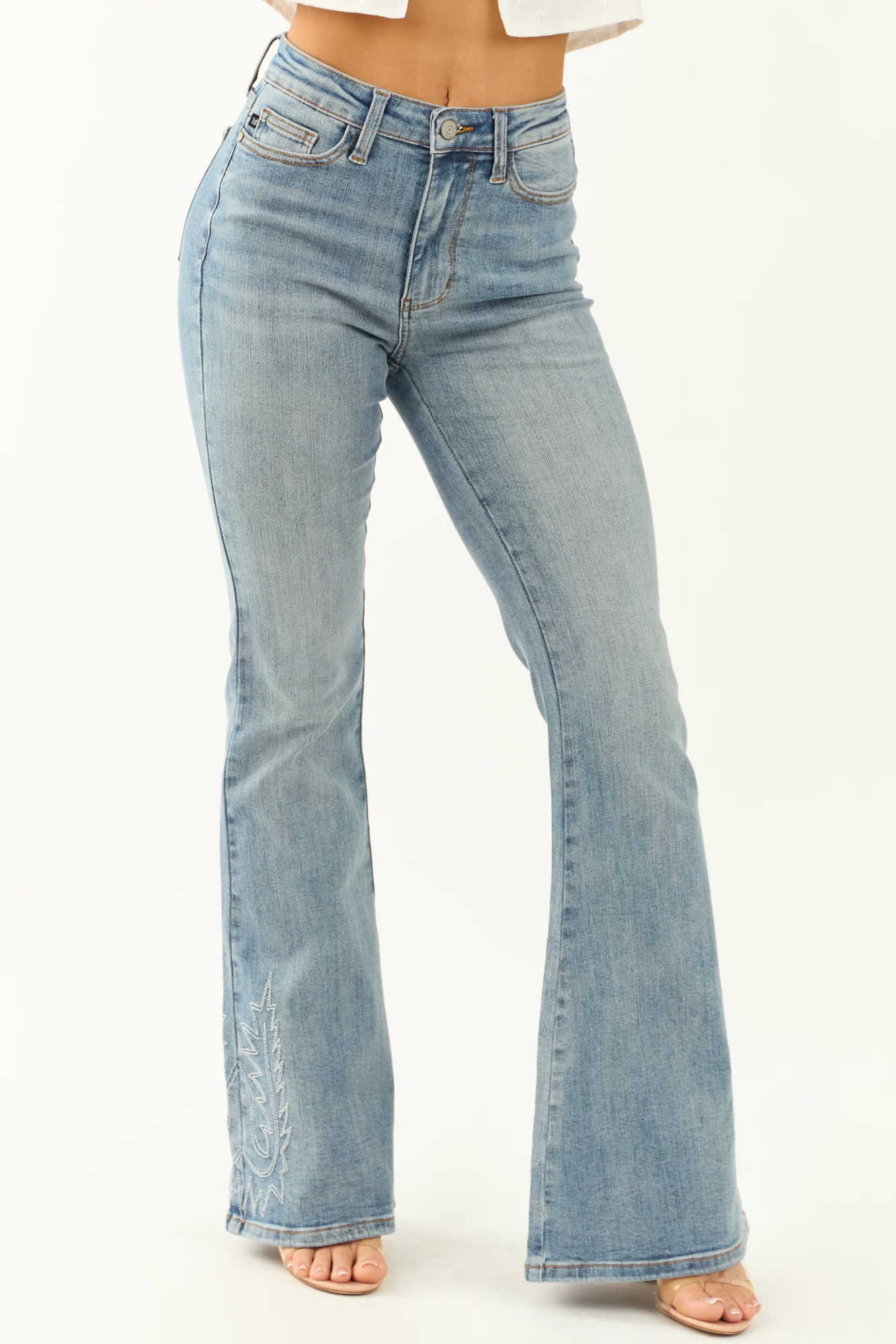 Indulge in western-inspired elegance with these light wash flare jeans featuring intricate ivory embroidery. Elevated with high-rise style, stretchy denim, and 5 functional pockets, these jeans offer a flattering fit. Crafted from 91% Cotton, 7% Polyester, and 2% Spandex for comfort and style. Available in waist sizes from 25″ to 33″ and inseams from 33″ to 33.5″. Complete your look with the unique embroidered back pockets and hem detail. Saddle up in style!