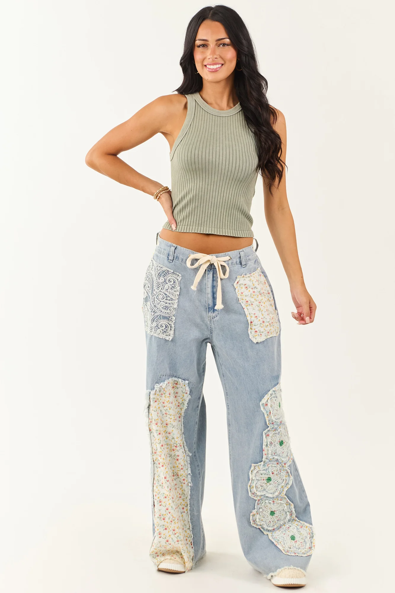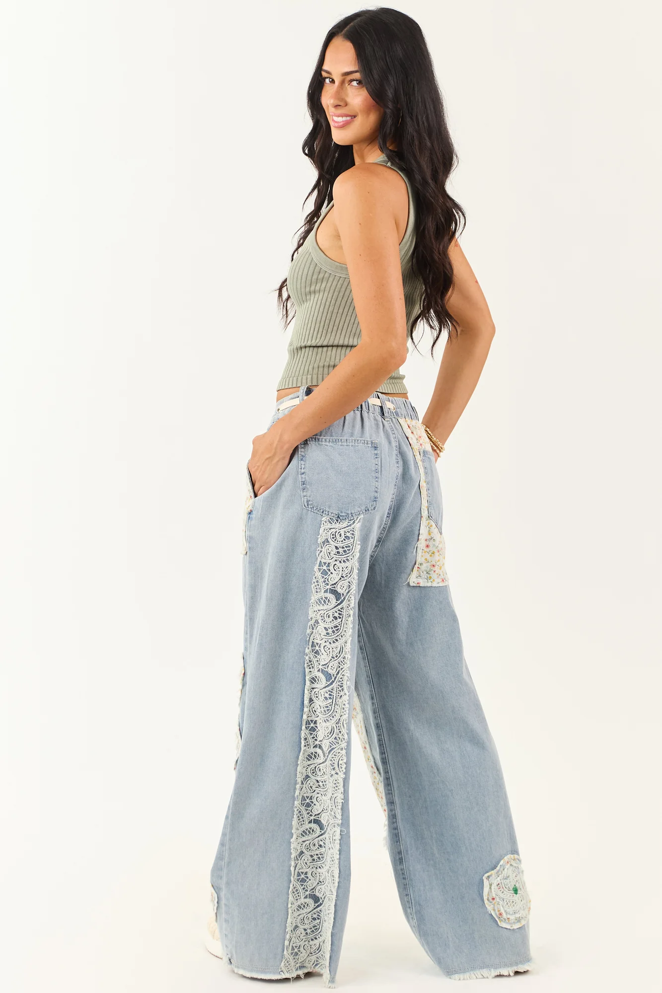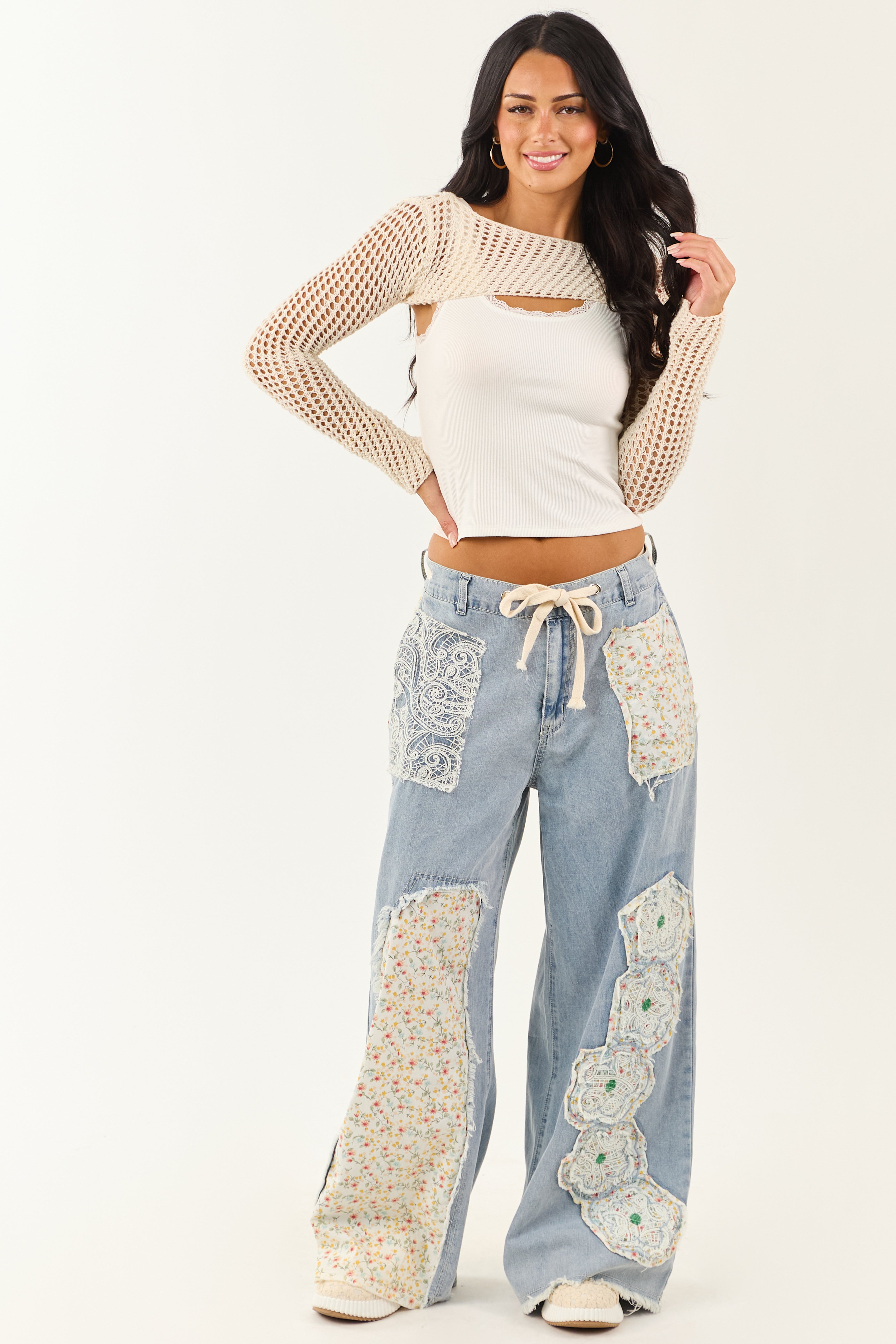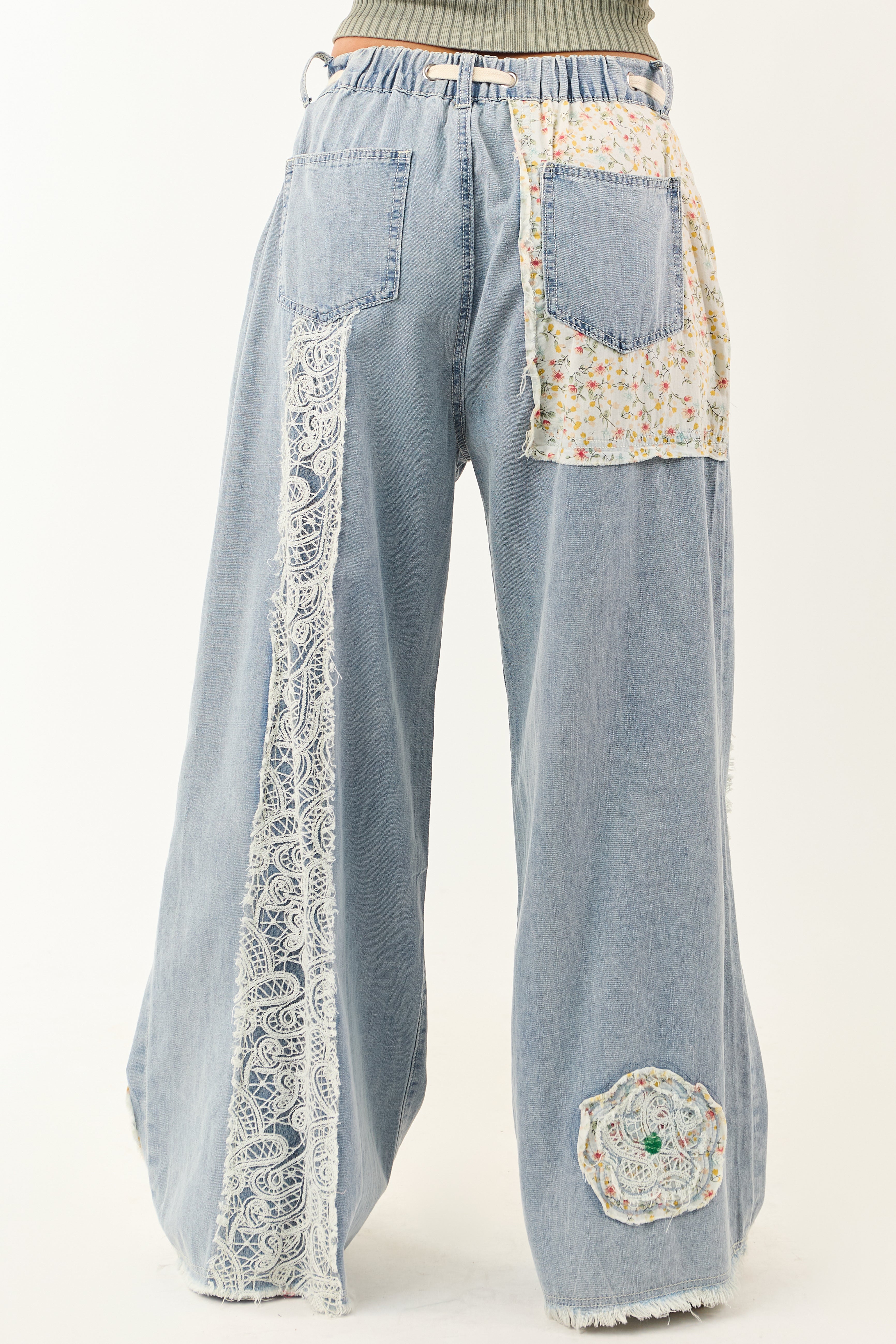 Achieve relaxed style with these Light Wash Floral Patchwork Denim Pants featuring a comfortable drawstring waist. Perfect for weekends, festivals, or casual wear. Made of non-stretchy lightweight denim with a stretchy back waistband. Adorned with floral patchwork in Seafoam, Sky Blue, Lemon, Cherry Blossom, Jade, and Powder Blue shades. Lace details in Ivory. Includes adjustable drawstring, zipper fly, button closure, 4 pockets, and wide legs. Inseam length of 30″. Crafted from 100% Cotton. Imported. Model is wearing size Small. Models Profile: Size 1, Height 59″, Bust 34″, Waist 26″.
