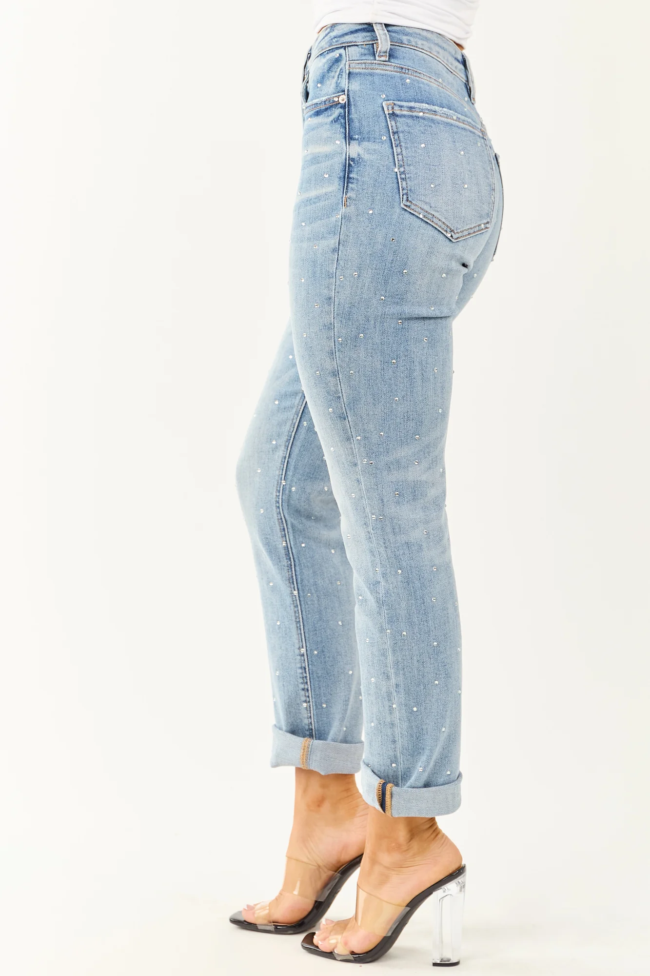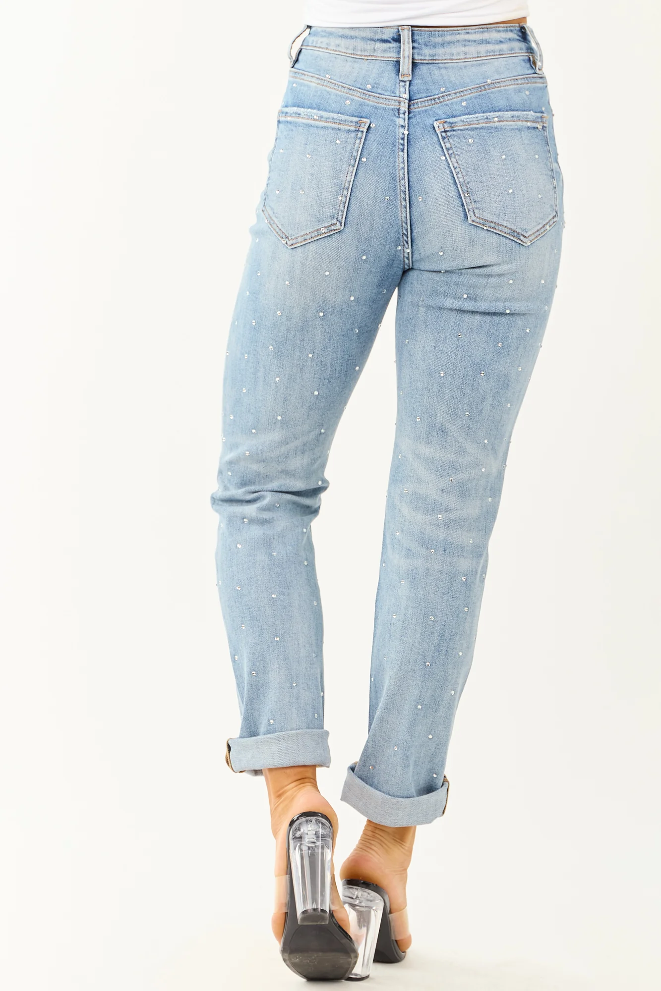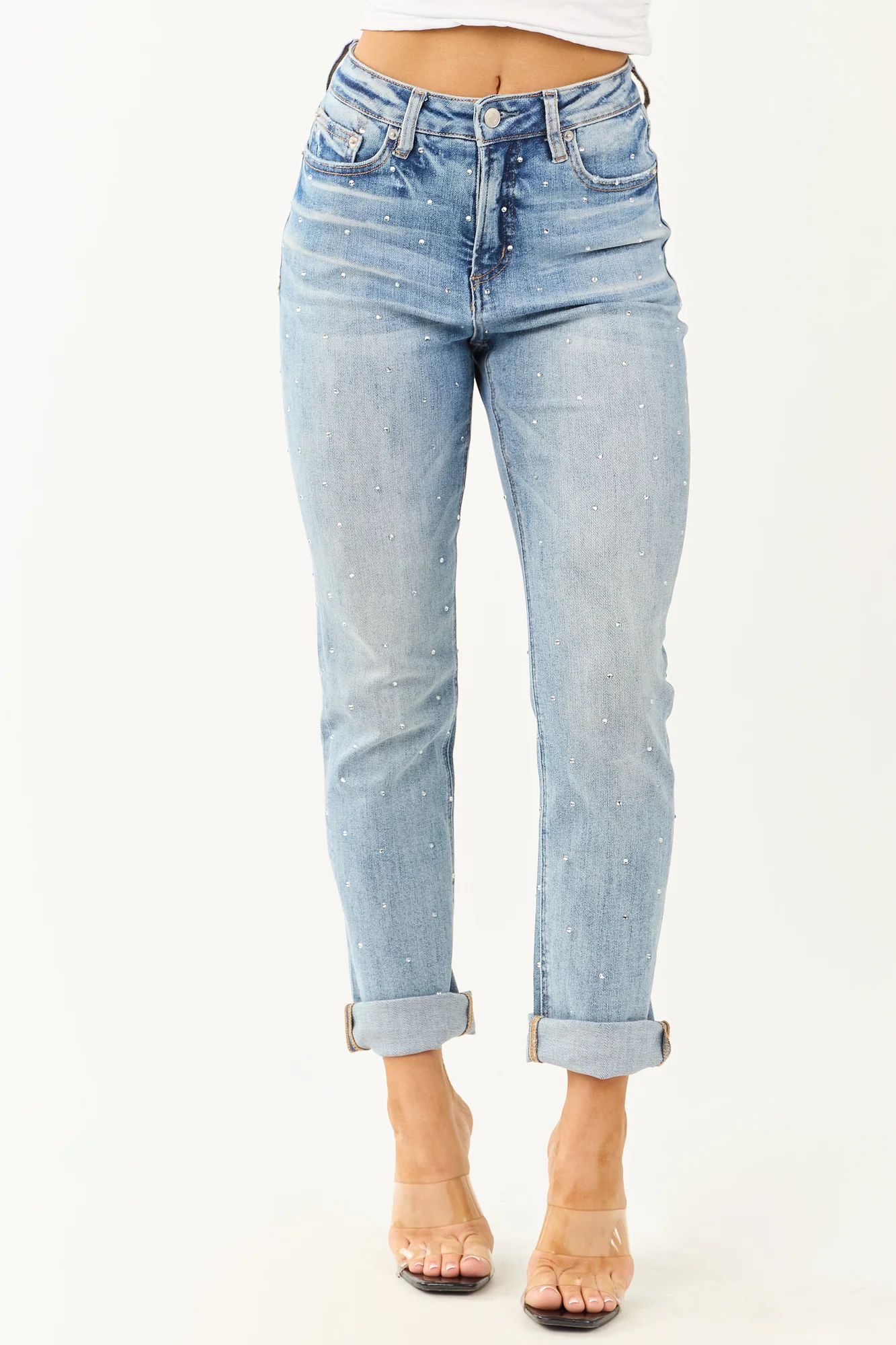 These light wash denim jeans feature a touch of sparkle with white rhinestones, perfect for stylish outings. The high-rise design offers a comfortable fit, complete with stretch for forgiveness in the waistband. Crafted with 94% Cotton, 4.5% Polyester, and 1.5% Spandex, these jeans include light distressing, whiskering, 5 pockets, belt loops, and a zipper fly with button closure. Inseam length is 30 inches. Model is showcasing a size 25, with measurements of Size 1, Height 57″, Bust 34″, Waist 26″.