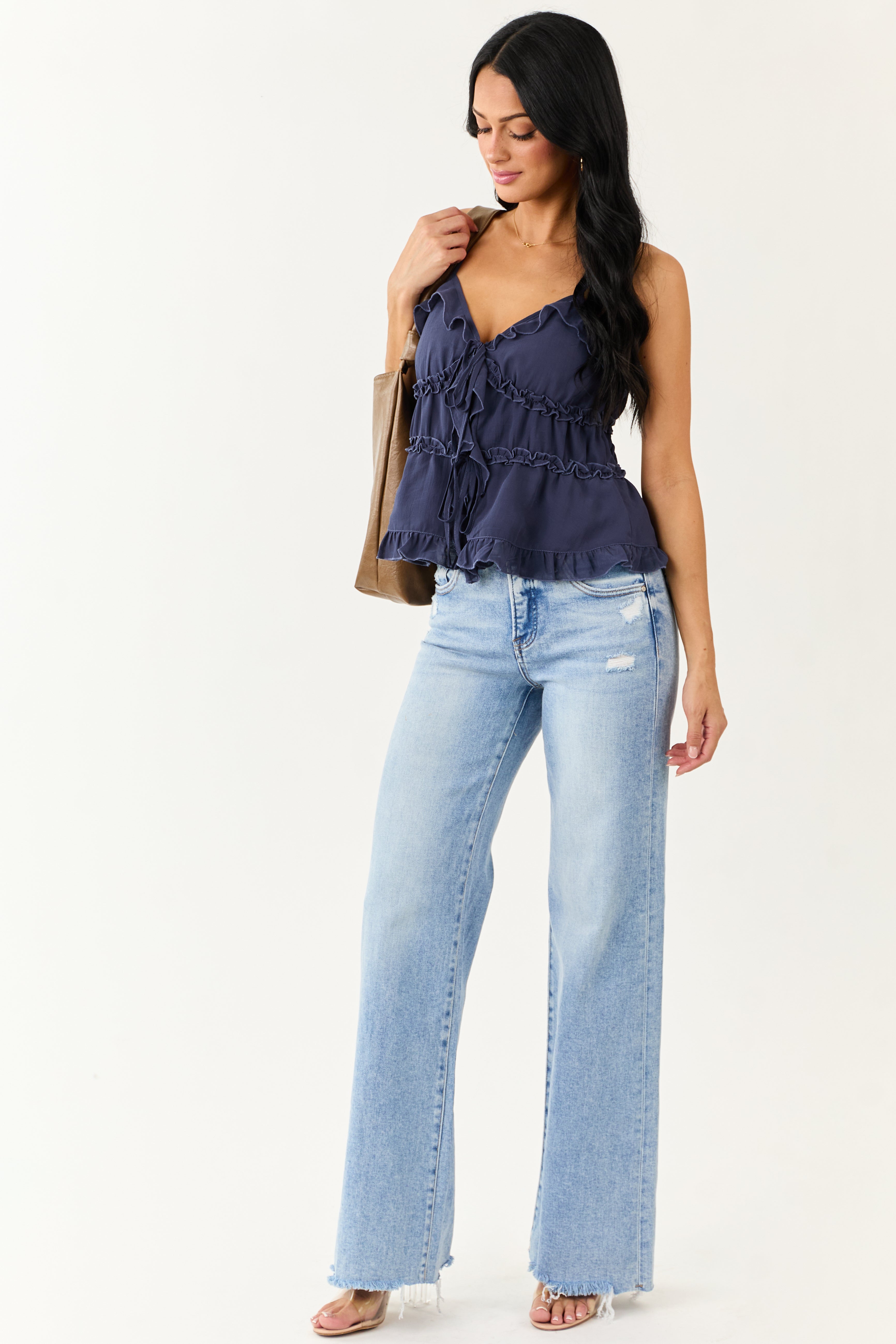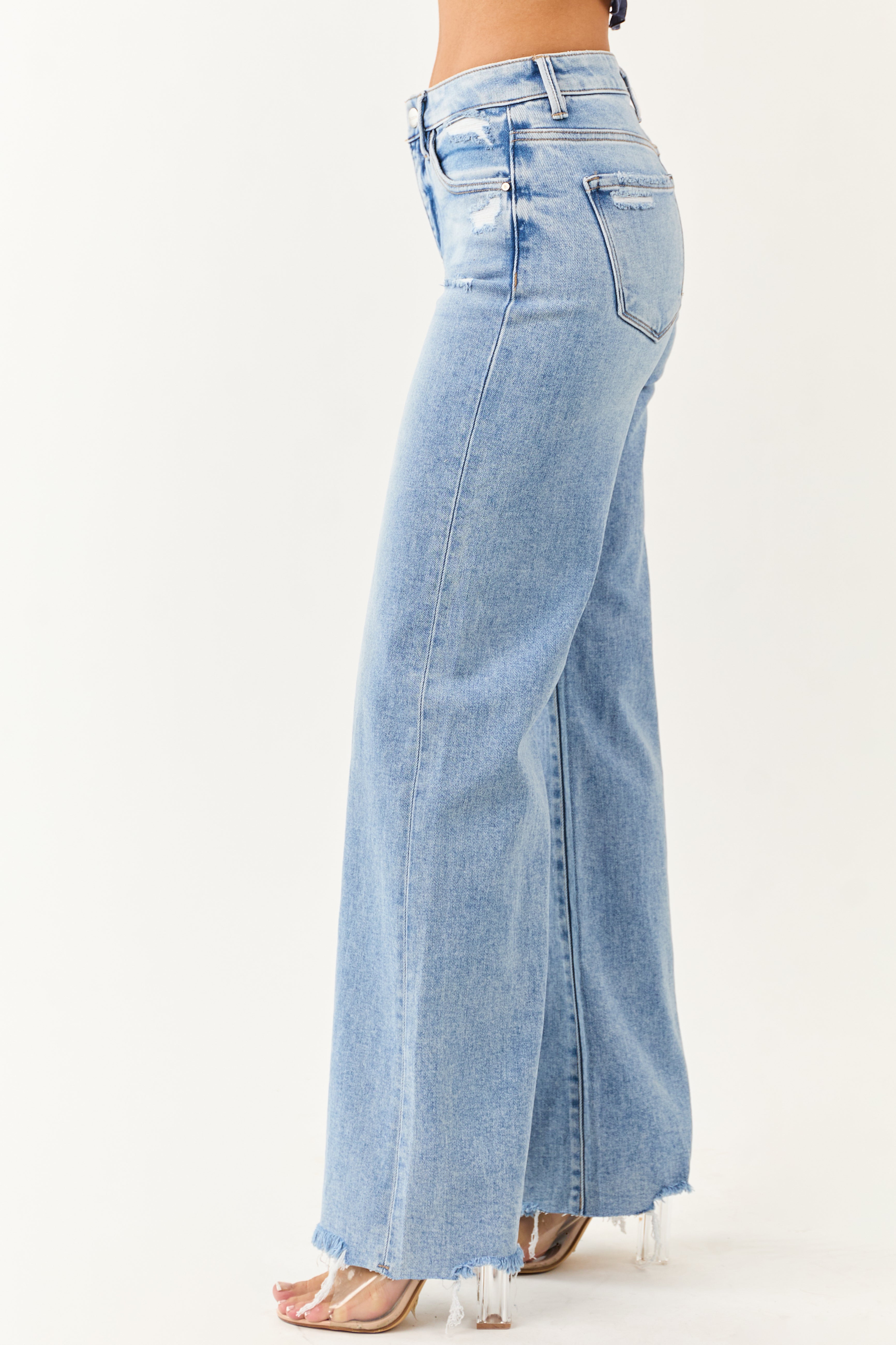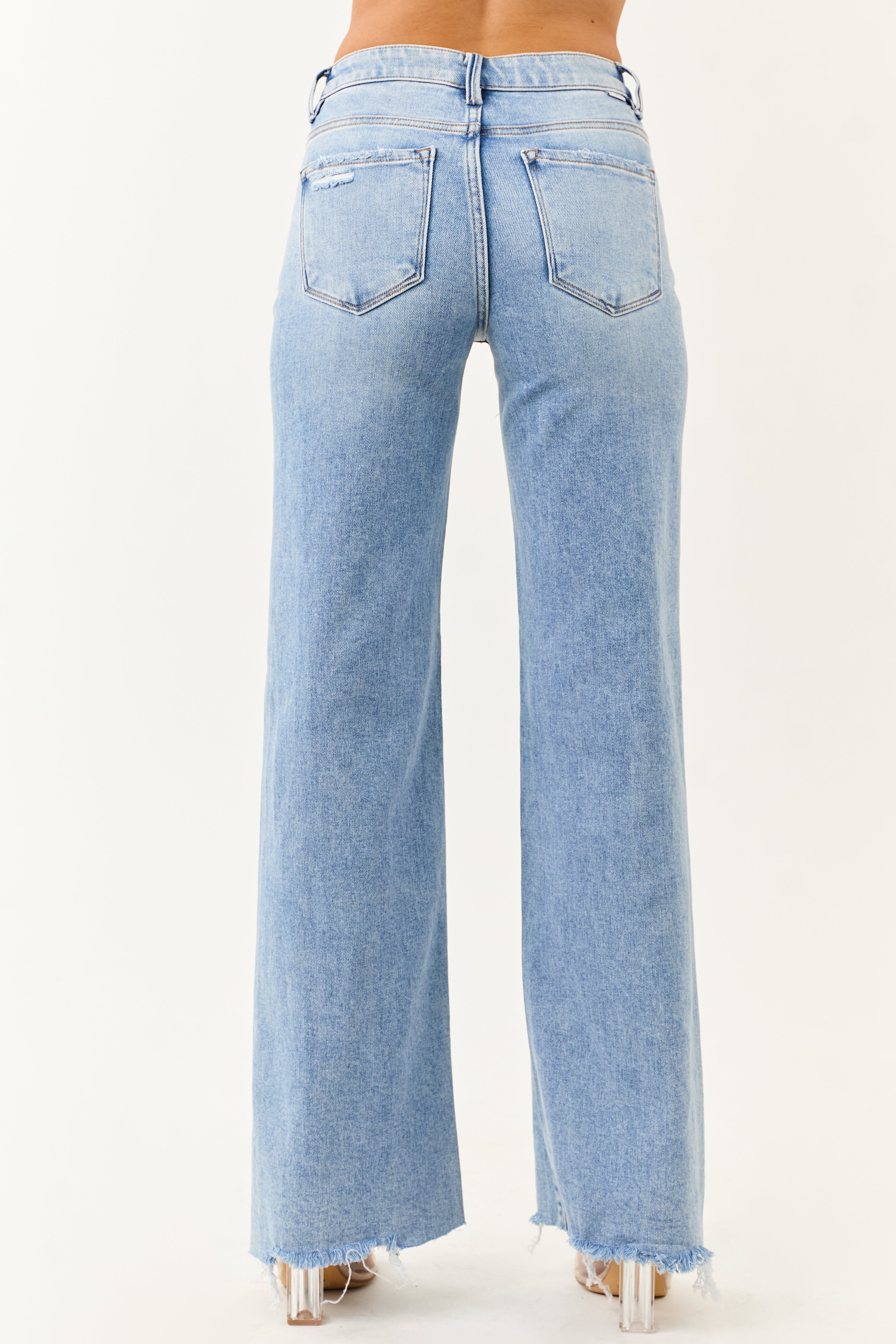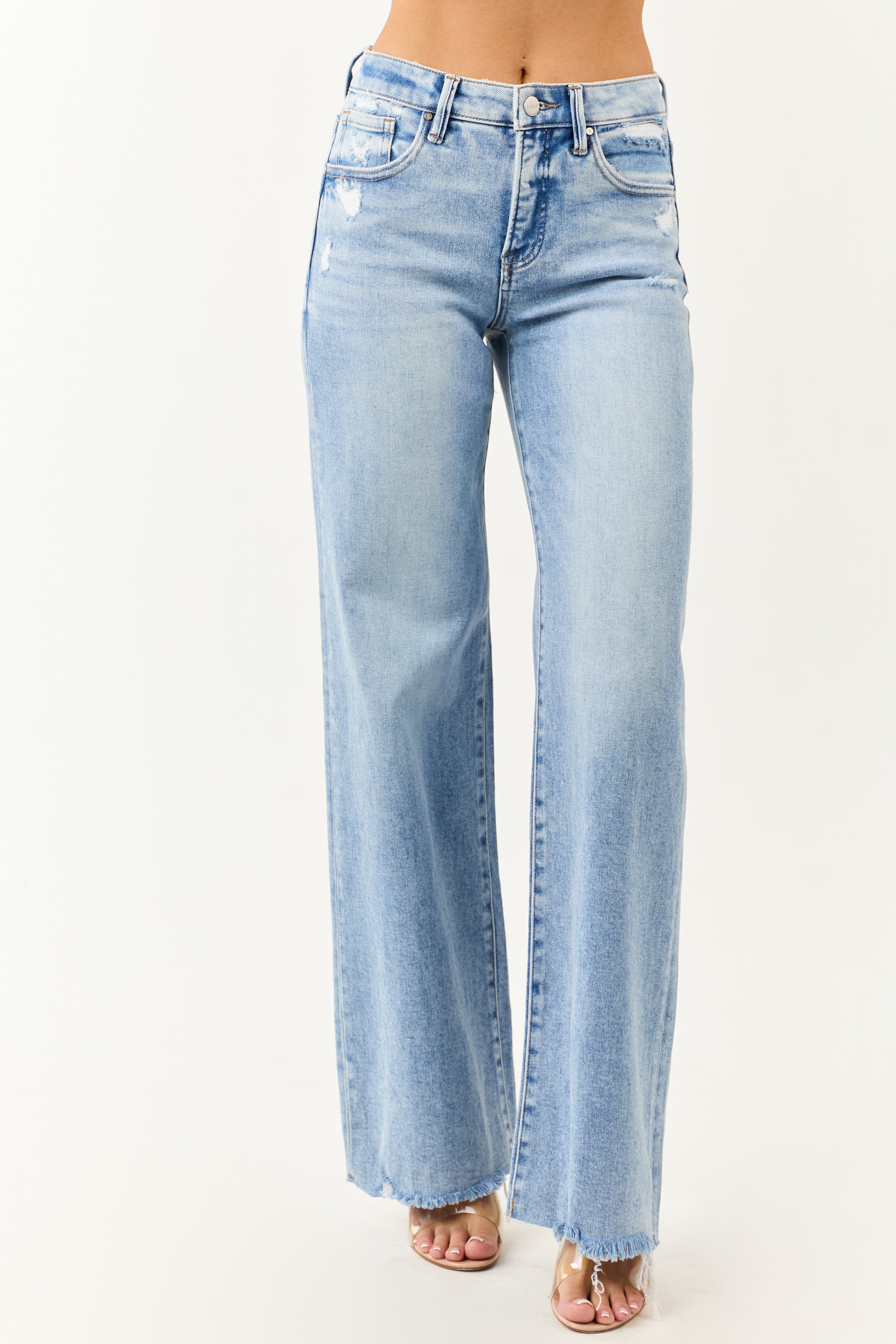 Step out in confidence with these light wash wide leg jeans designed with built-in tummy control for a smooth, flattering fit. These tall length jeans feature high-rise design, stretchy denim, and raw frayed hem. Perfectly pair them with boots or heels. These jeans fit true to size and provide a stylish look with light distressing. Zipper fly with button closure, 5 pockets, and belt loops included. Made of 93% Cotton, 5% Polyester, 2% Spandex. Imported. Waist measurements verified by our team on the actual item. Model is wearing size 3.