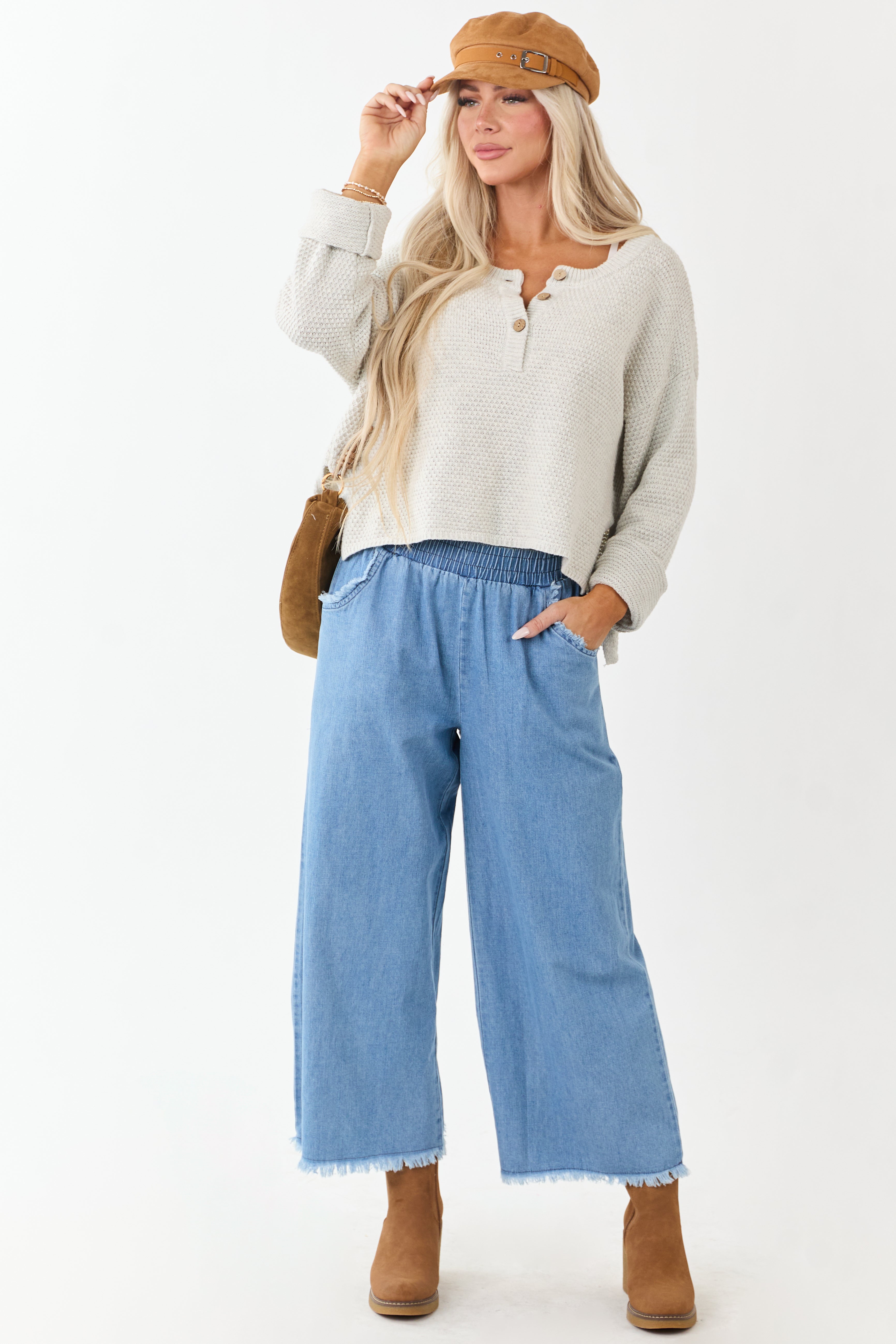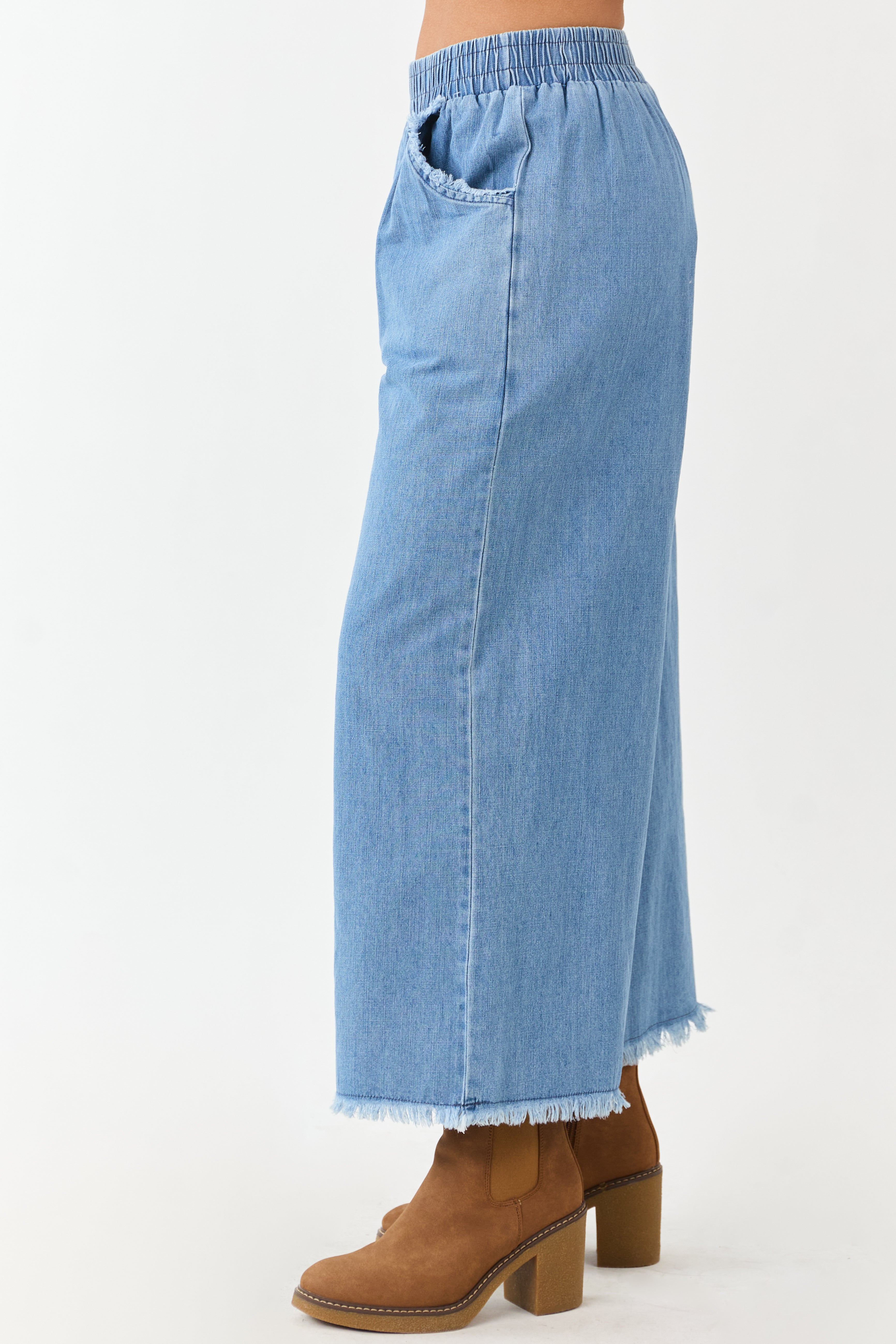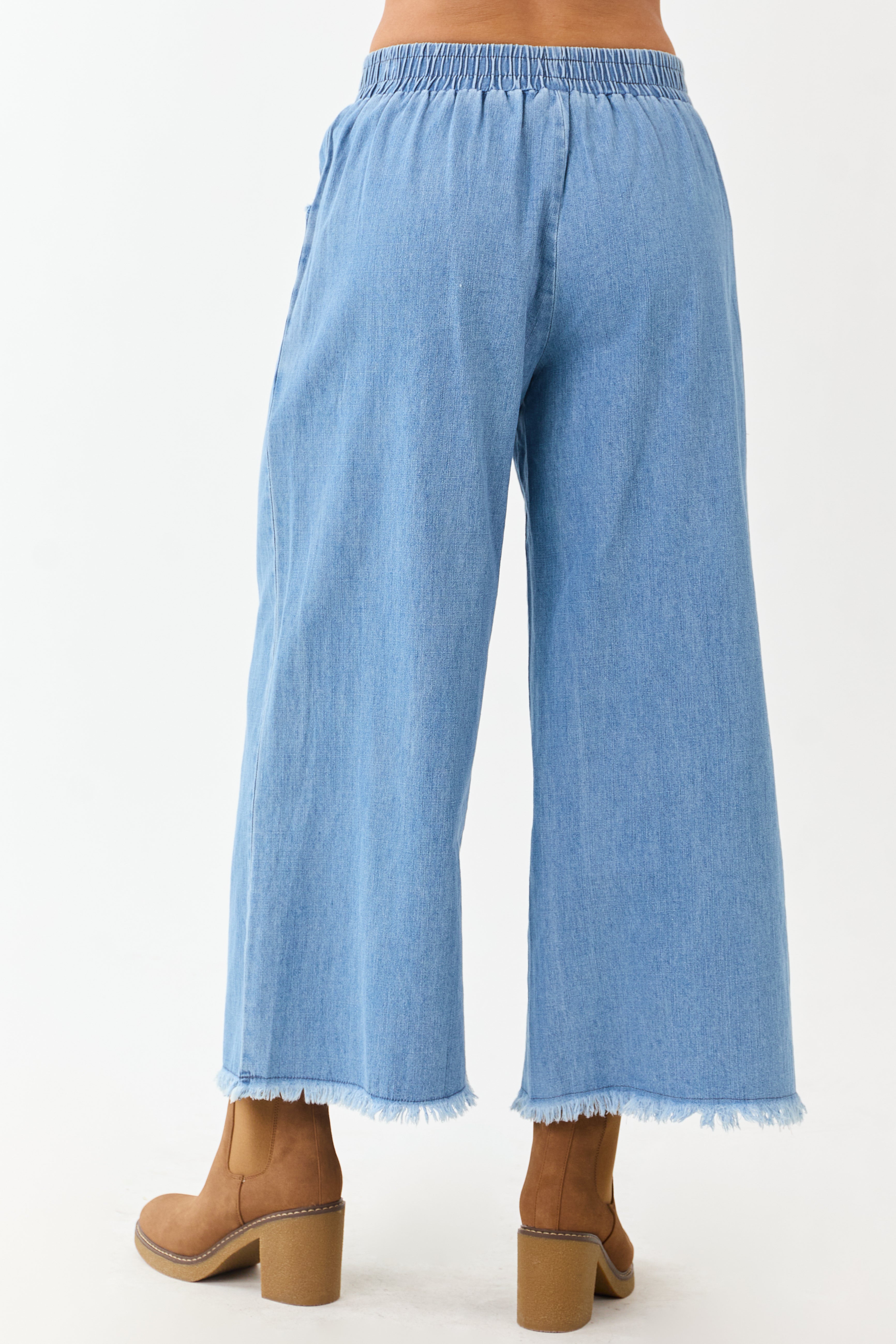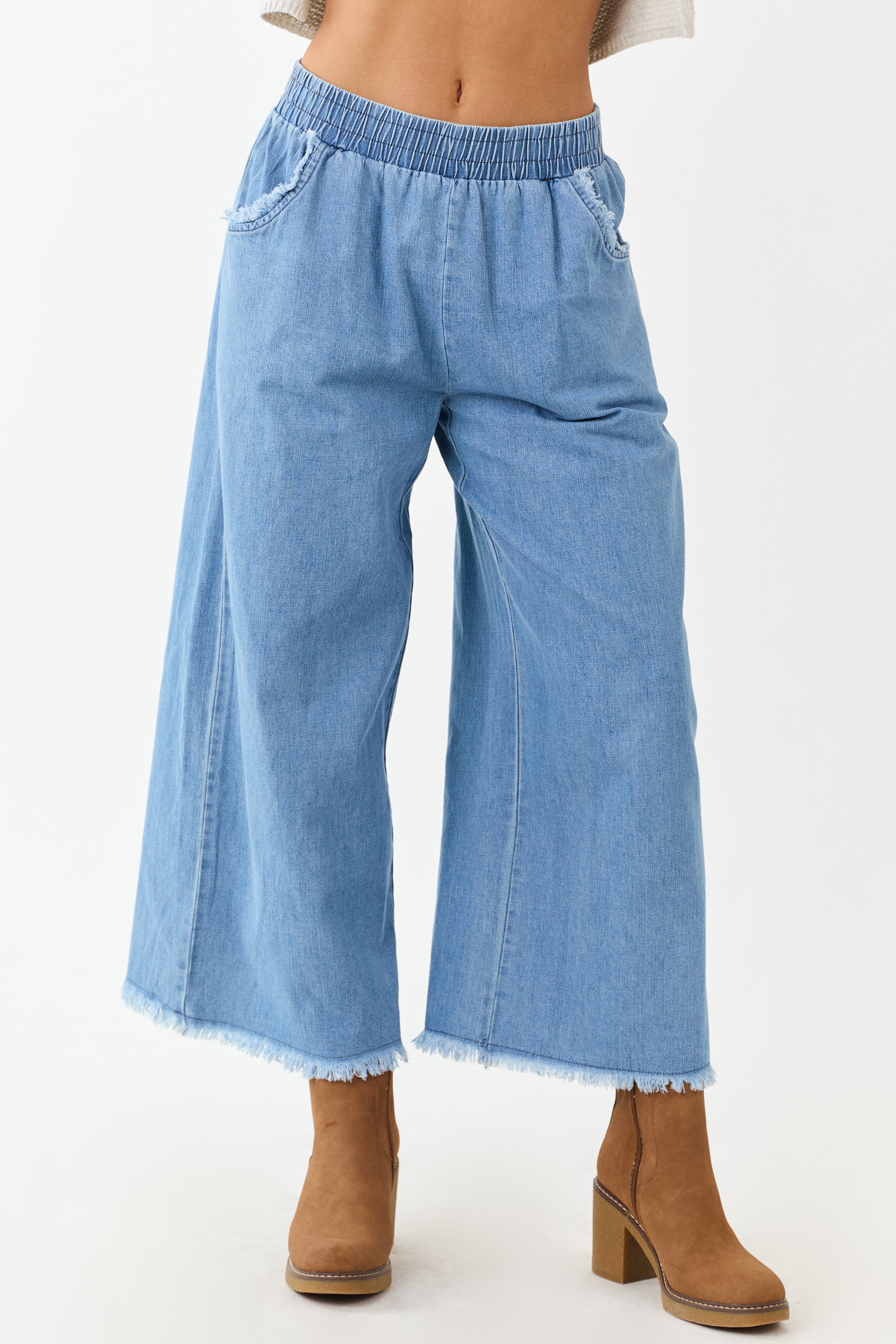 These stylish Light Wash Wide Leg Chambray Cropped Pants combine fashion and comfort effortlessly. Crafted from non-stretchy lightweight denim, they feature a wide leg, cropped silhouette, and an elastic waistband for a perfect fit. The frayed pockets and hem add a trendy touch. Ideal for various occasions. Material: 85% Cotton, 15% Polyester. Available in sizes XS, S, M, L, XL. See the size chart for detailed measurements.
