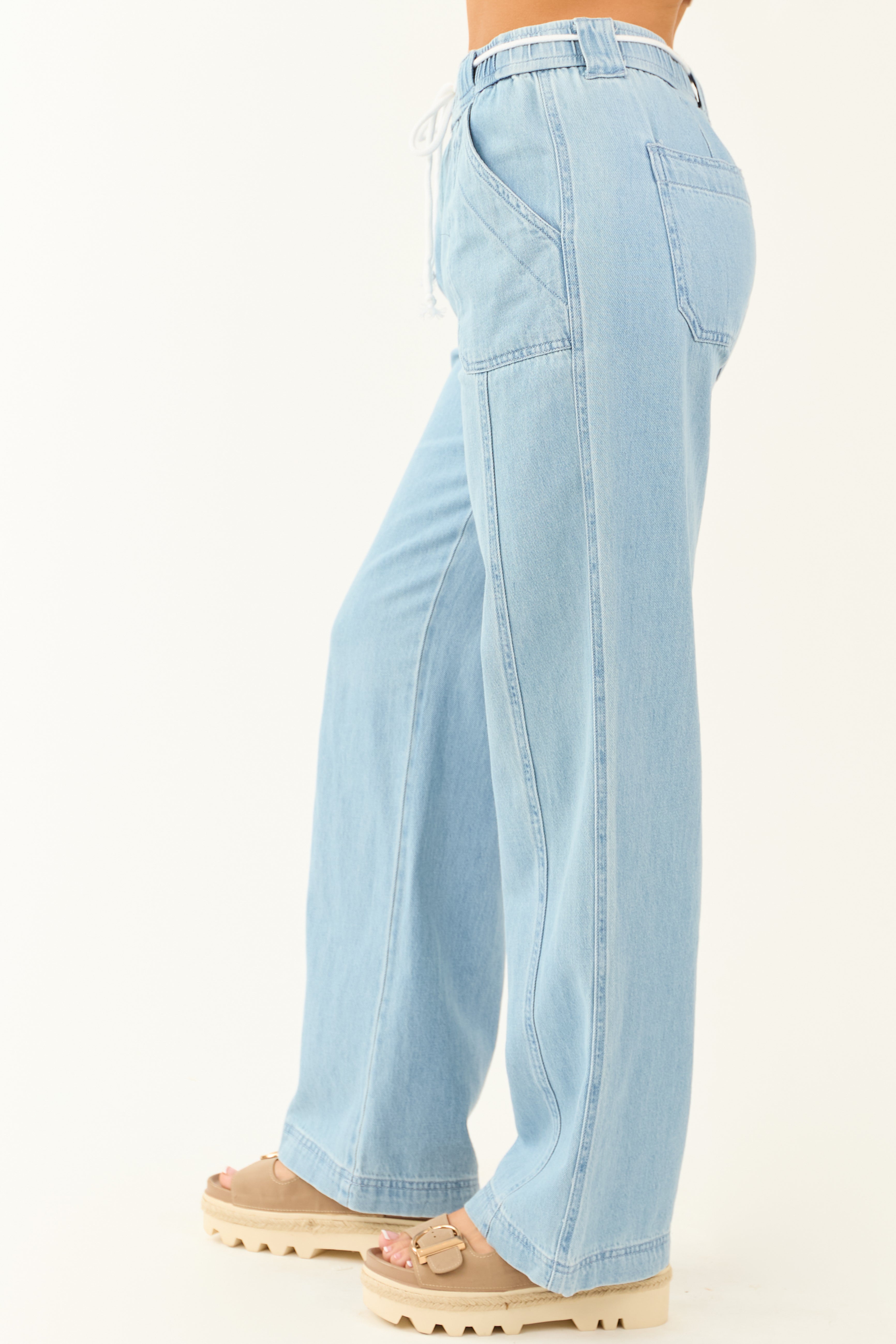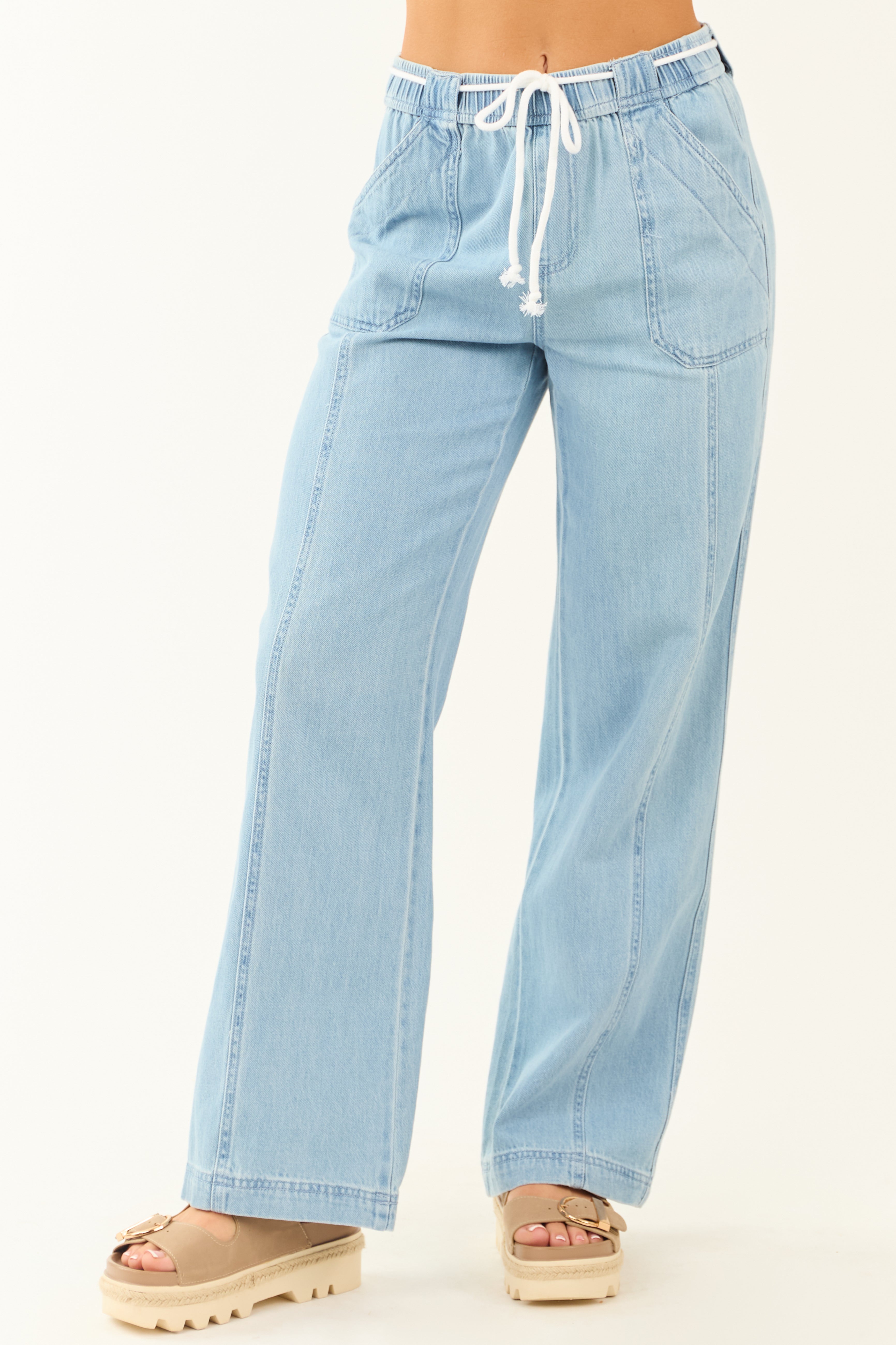 Discover the perfect balance of comfort and style with our Light Wash Wide Leg High Waist Cotton Tie Jeans. Featuring non-stretchy denim, high-waisted design, and an adjustable white waist tie for a chic look. Seamlessly transition from day to night with these versatile jeans. Find your ideal fit with our size chart – XS (Size 0/2) to XL (Size 16/18). Embrace fashion with substance. Order now!
