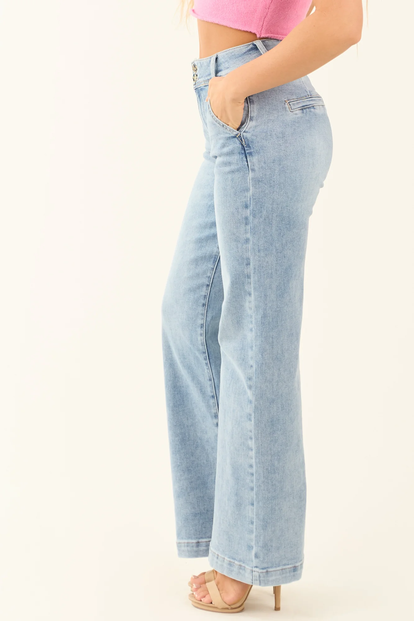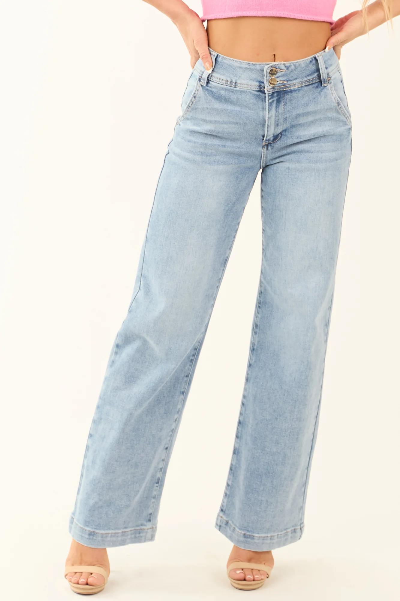 Experience ultimate comfort and style in these Light Wash Wide Leg Jeans. Crafted from a stretchy blend of 92% Cotton, 6% Polyester, and 2% Spandex, these high-rise jeans feature a zipper fly with a practical double button closure. With 2 front pockets, belt loops, and a classic 5-pocket design, these jeans offer both fashion and functionality. The semi-stretchy denim ensures a perfect fit, allowing for 1-3″ extra in the waist. Care Instructions: Machine wash cold, gentle cycle. Model is wearing size 1, Measurements: Height 57″, Bust 34″, Waist 26″