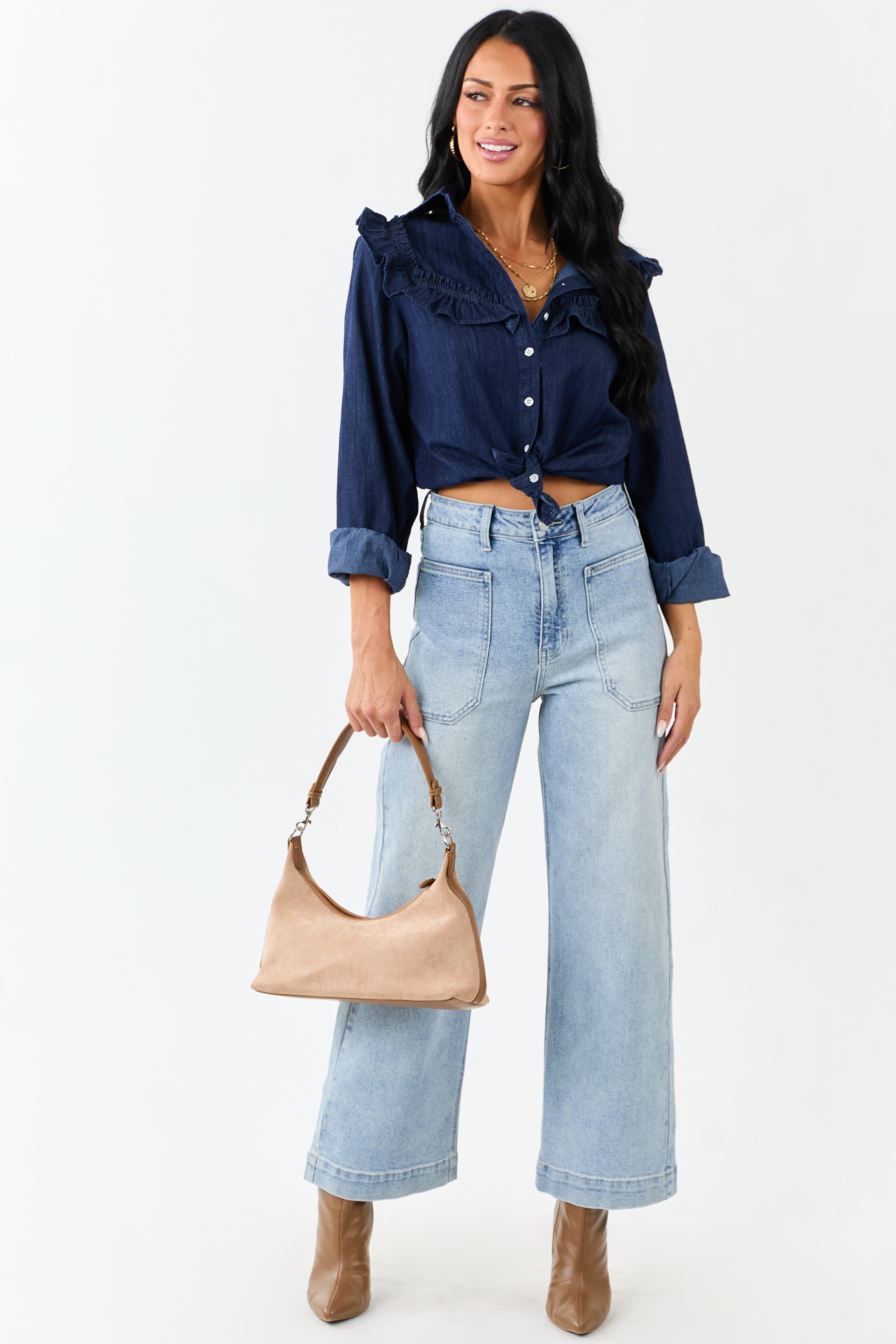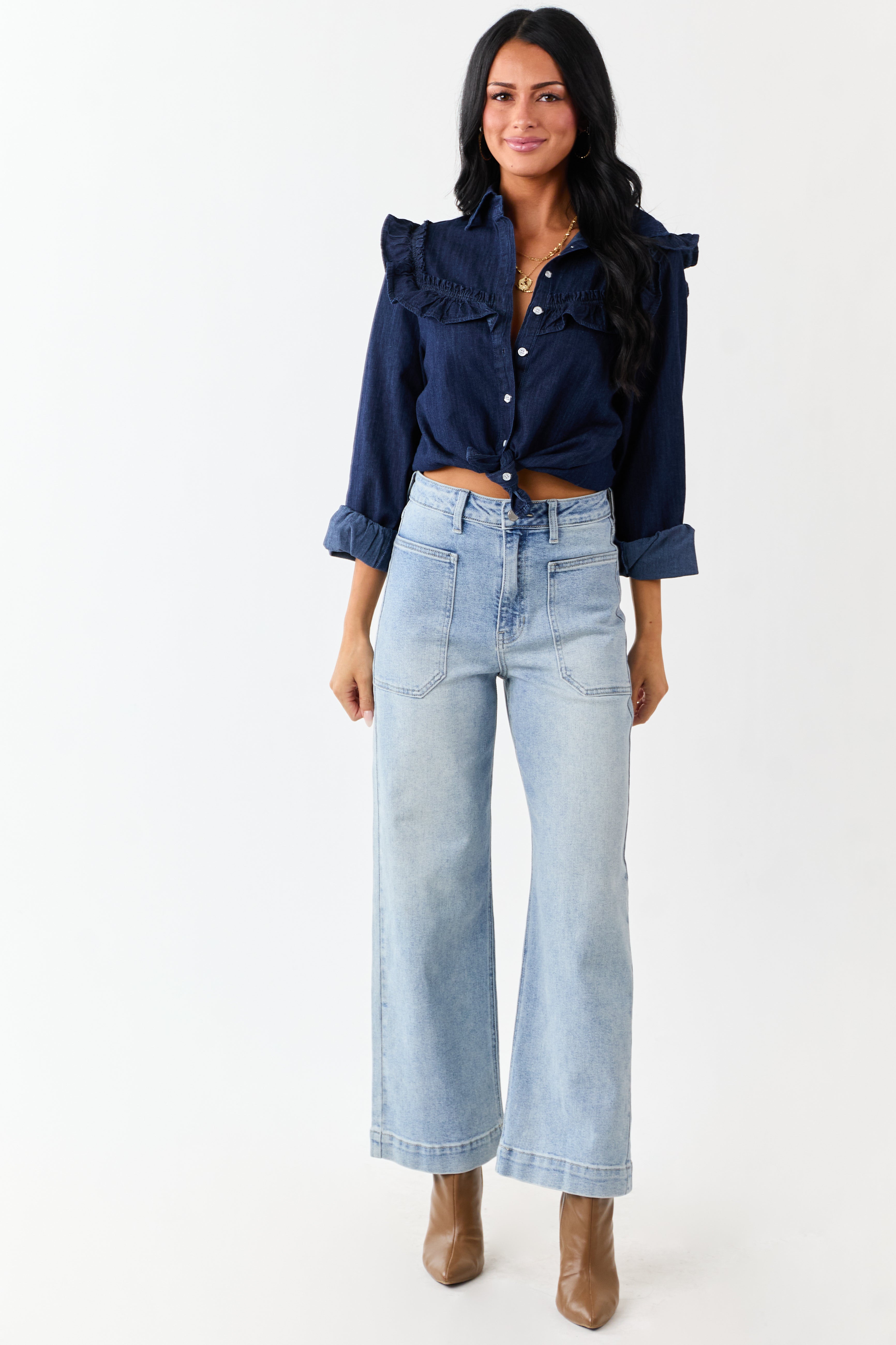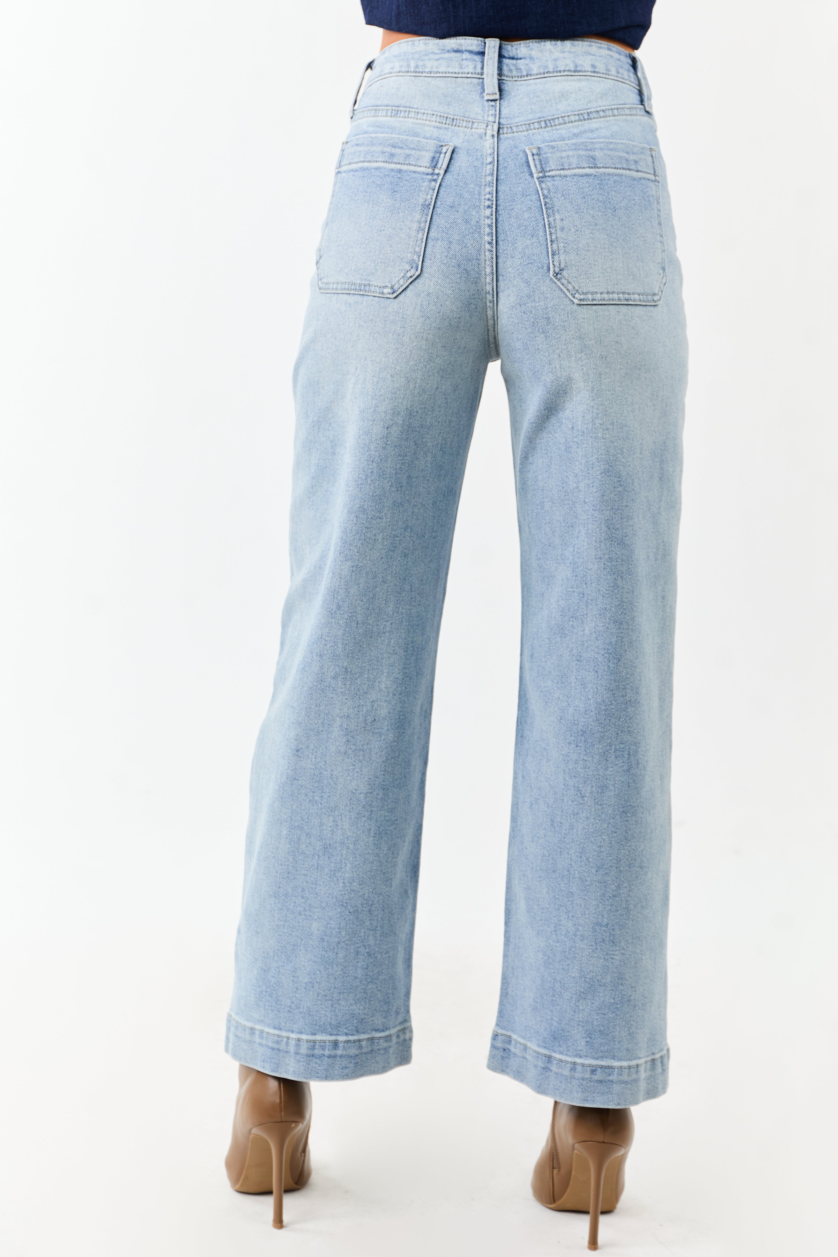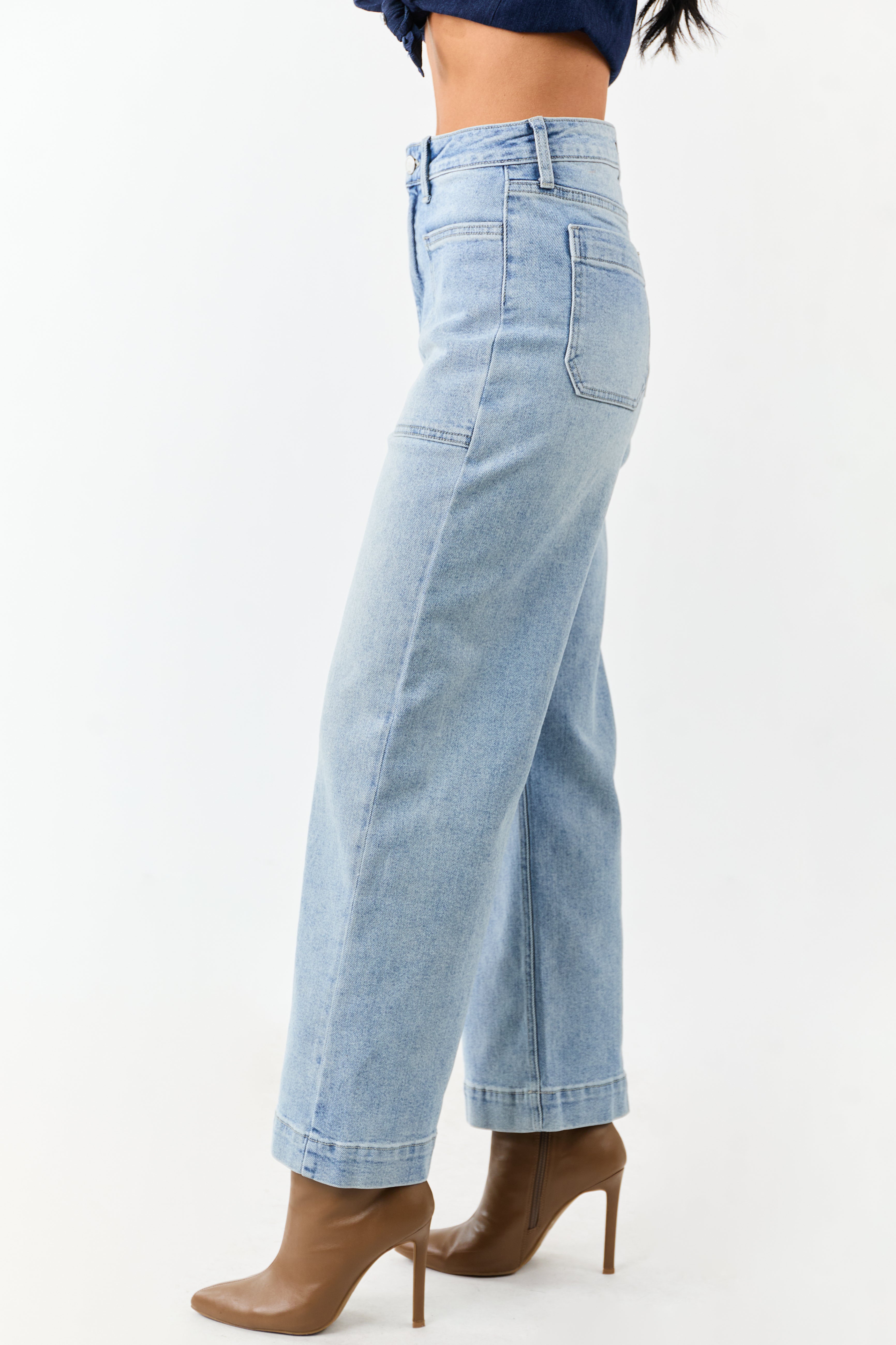 Upgrade your wardrobe with these practical pocket jeans featuring a stretchy fit and trendy wide leg silhouette. These high-rise jeans crafted from semi-stretchy denim ensure a comfortable fit. With 4 pockets, zipper fly, button closure, and belt loops, these jeans are both stylish and functional. The inseam measures 28 inches and the material consists of 96% Cotton, 3% Elasterell, and 1% Spandex. Imported. Available in sizes 24 to 31. Model is wearing a size 26. Unleash your fashion sense with these versatile jeans!