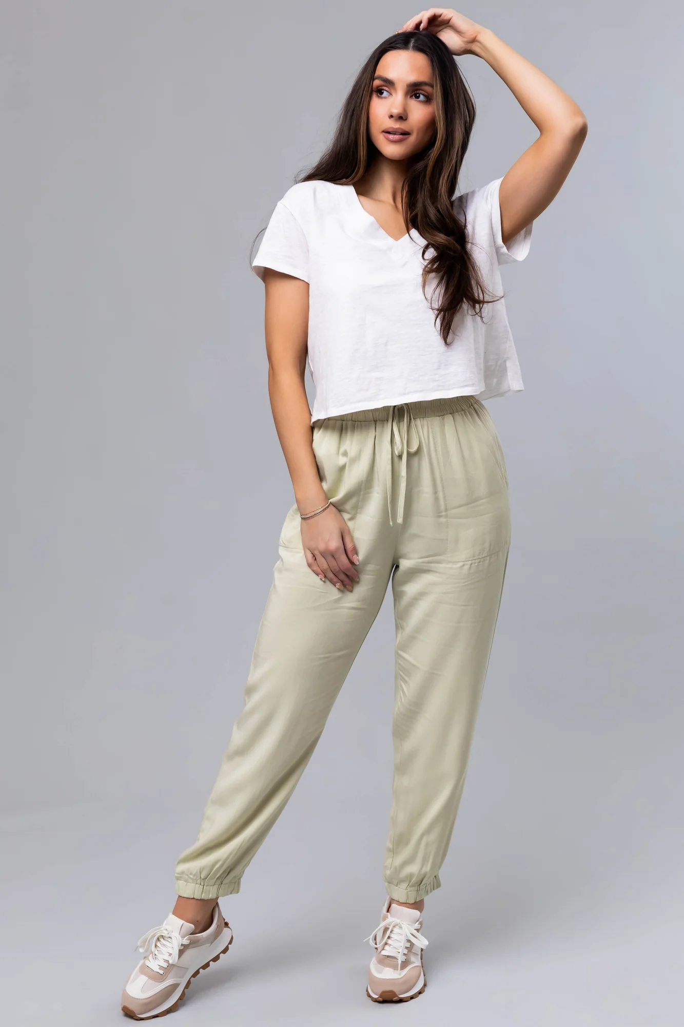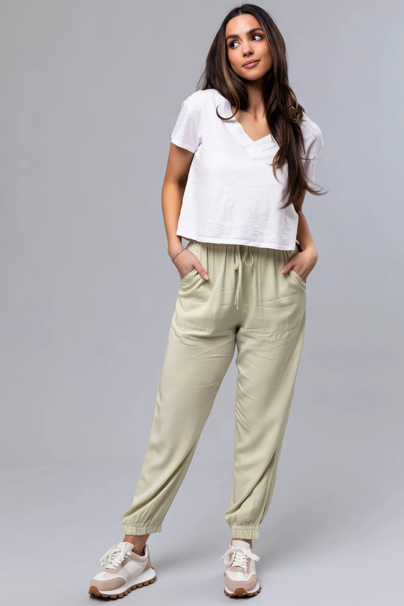 Discover comfort and style with our Lightweight Green Woven Joggers for Women. Available in sizes S, M, and L with a relaxed fit, elastic waist, non-functional waist tie, and pockets. Made of 70% Tencel and 30% Rayon for a luxurious feel. Ideal for casual occasions and spring season. Hand wash cold, hang to dry. Model is wearing a size Small.