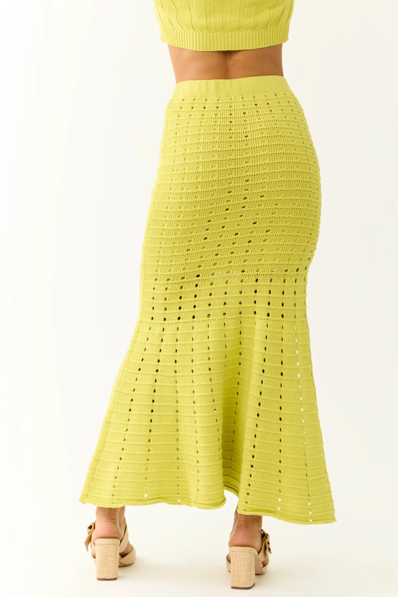 Elevate your style with our Lime Crochet Maxi Skirt featuring a mermaid fit, non-stretchy crochet, stretchy elastic waistband, side slit, and pointelle cutouts. Pair it with our Lime Short Sleeve Pointelle Cropped Sweater for a stunning ensemble. This skirt is lined, made of 100% Cotton, and the lining is 100% Polyester. Care instructions: Hand wash cold, line dry, iron on low heat, do not bleach. Model is wearing a size Small. Model’s measurements: Height 57″, Bust 34″, Waist 26″.