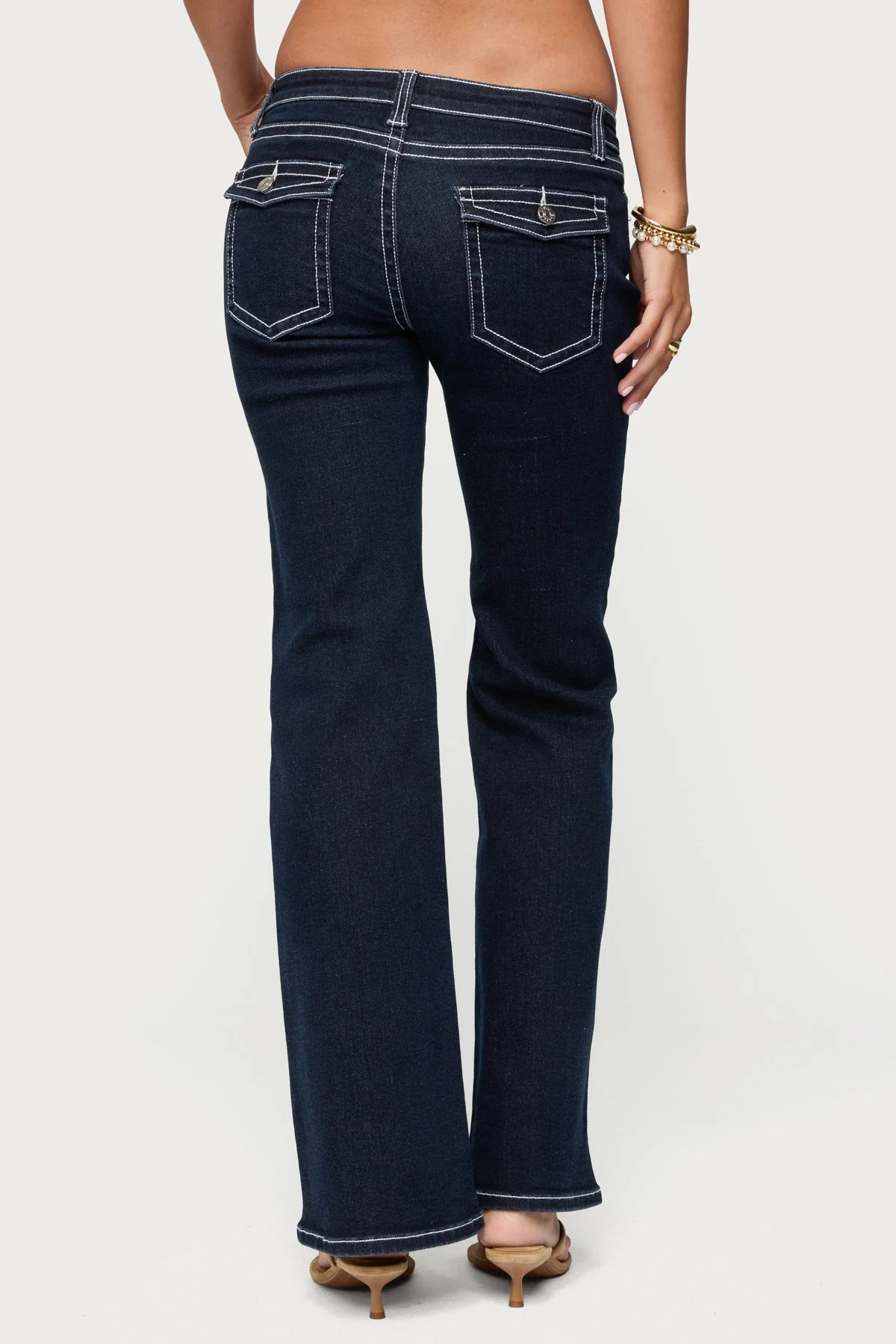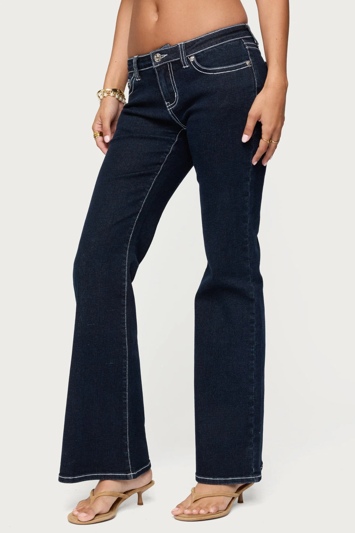 Jeans Low rise waist Flare leg fit Contrast stitching Stretchy denim fabric Cotton, Polyester, Spandex Model wears size S Inseam of size S (in): 32.09 Model height is 5’9 Item care: Machine wash at maximum 30ºC, wash with similar colors, do not bleach, do not tumble dry, iron at a maximum of 110ºC, do not dry clean