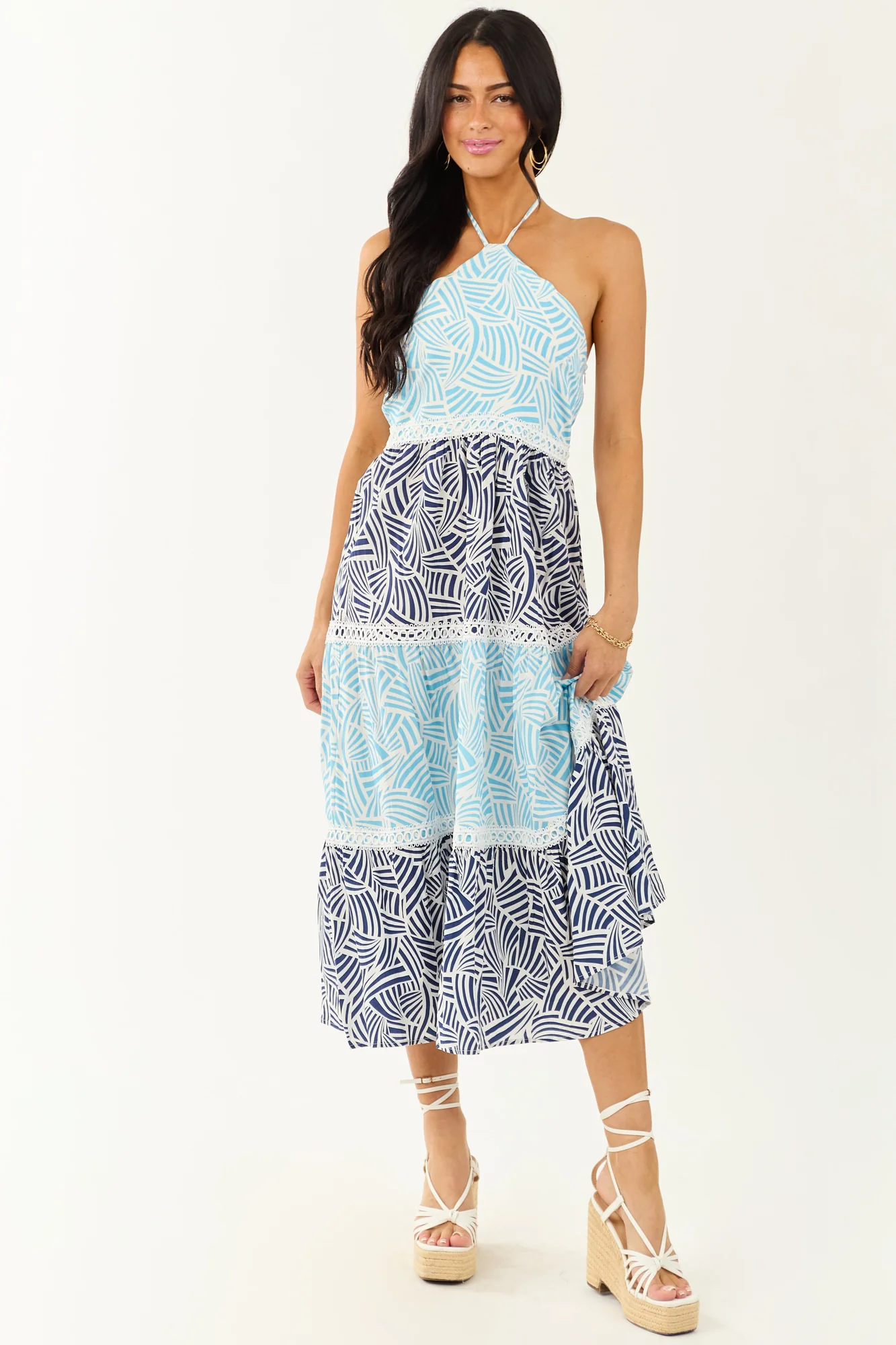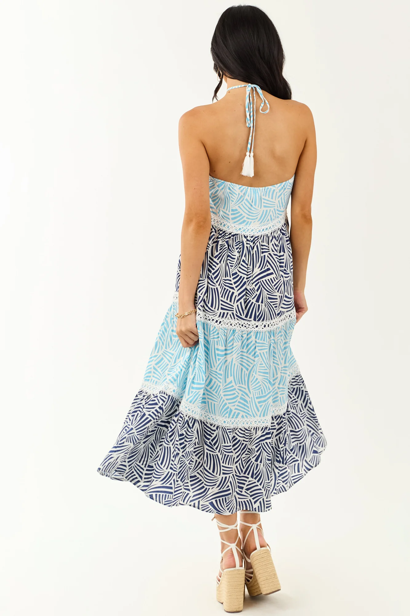 Step out in style with Lovelos Abstract Colorblock Midi Dress in shades of Baby Blue, Navy, and Ivory Off White. This dress is perfect for gallery dates and summer soirées, featuring a forgiving elastic waist, side zipper with hook and eye closure, and adjustable halter tie with tassel details. The lined bodice and tiered lace add a touch of elegance to this 100% Rayon dress. Look cool and confident in every step!