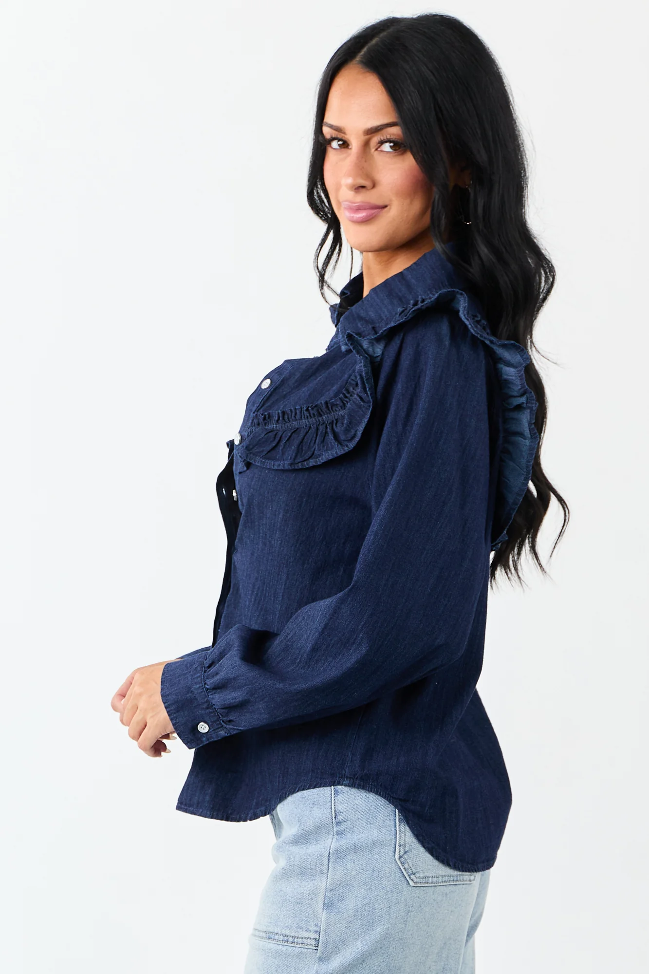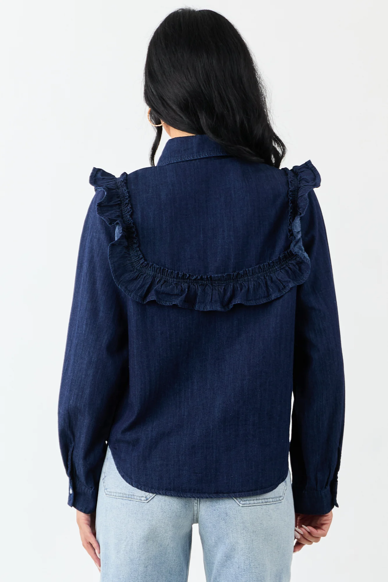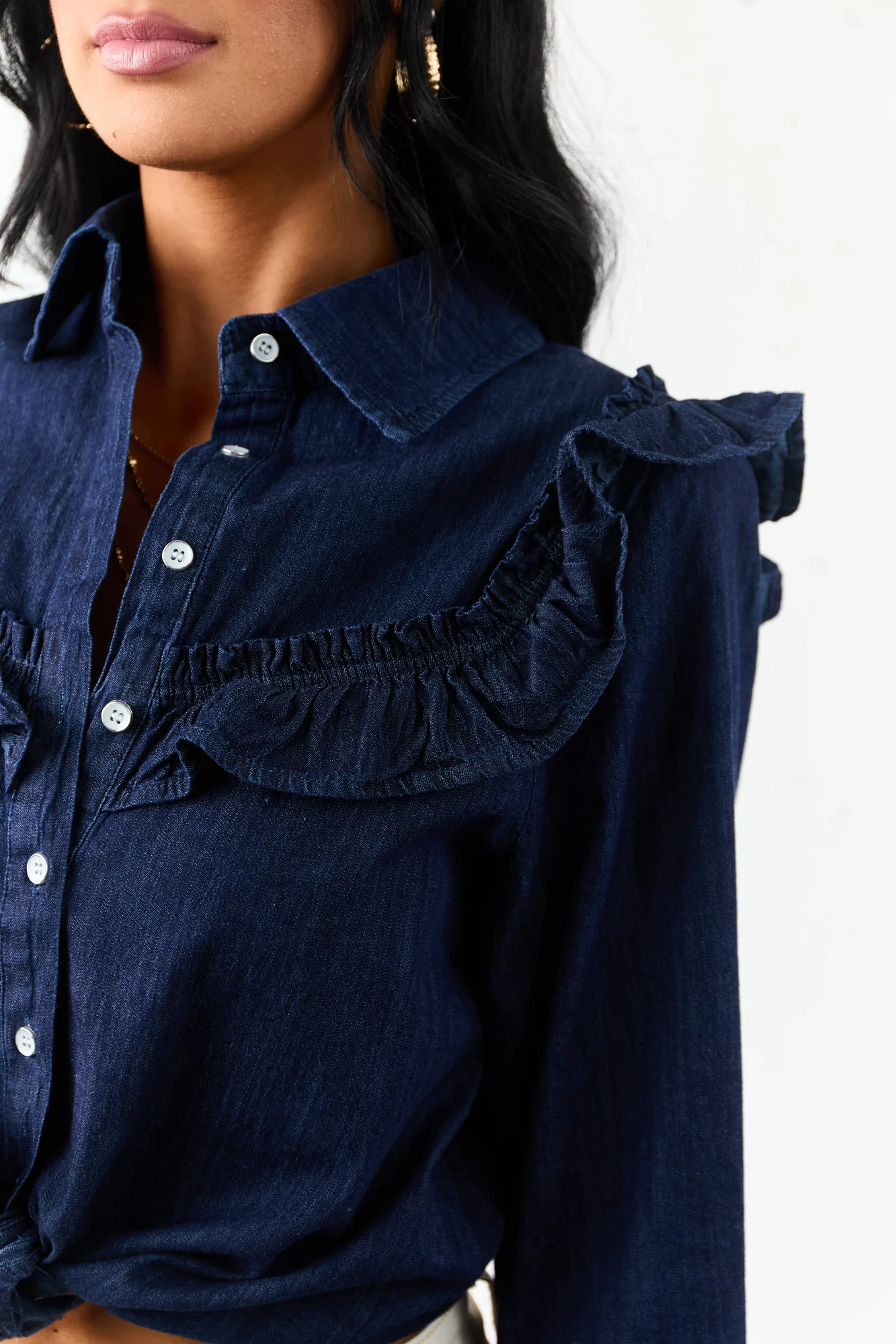 Upgrade your wardrobe with this dark denim button-up top featuring a ruffled yoke for added texture and style. Crafted from non-stretchy denim, this top offers a relaxed fit with a collared neckline, button cuffs, and 98% Cotton, 2% Polyester composition. Perfect for any occasion, this versatile piece x GeeGee is a must-have staple. Available in sizes S, M, and L.