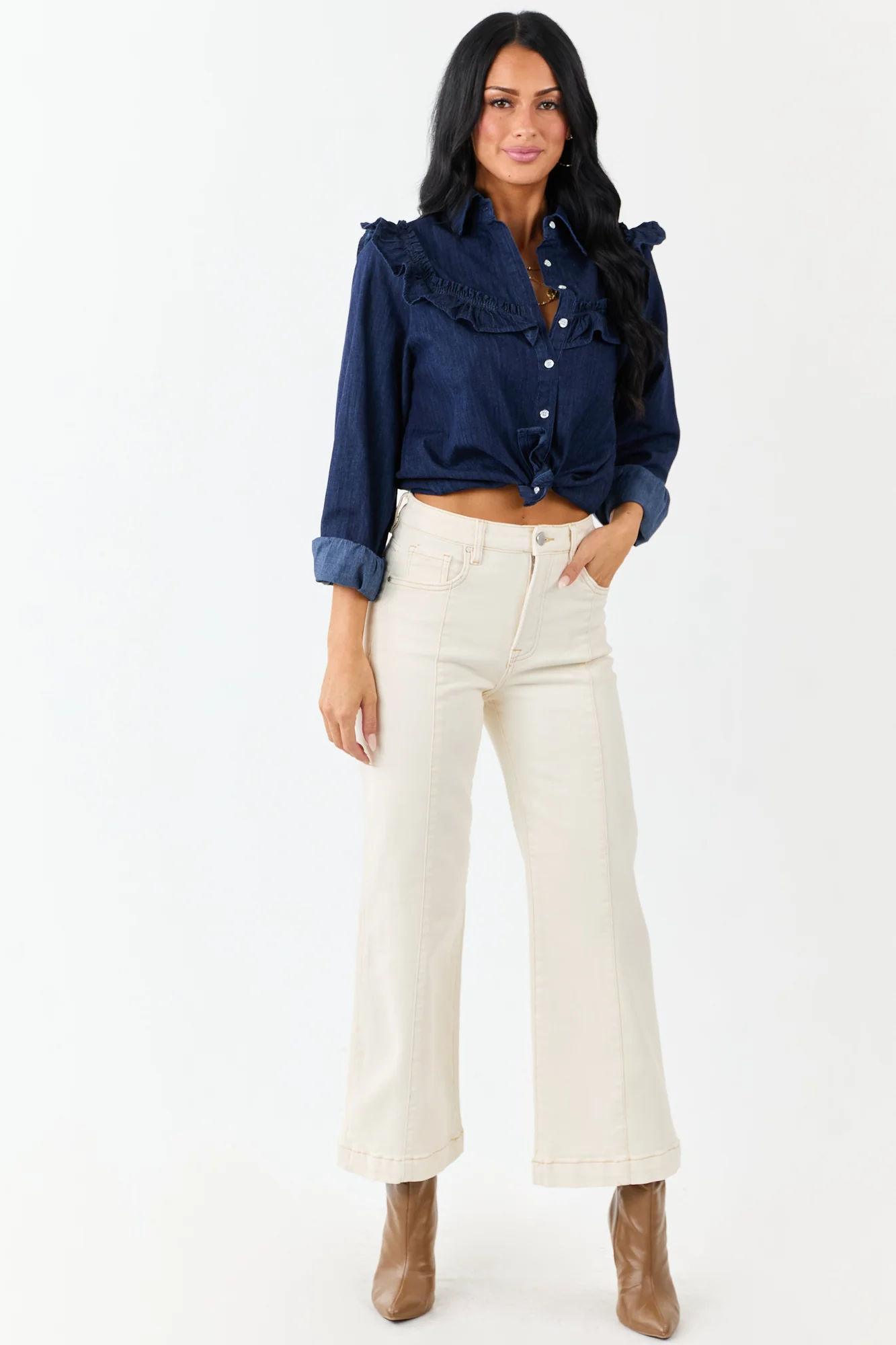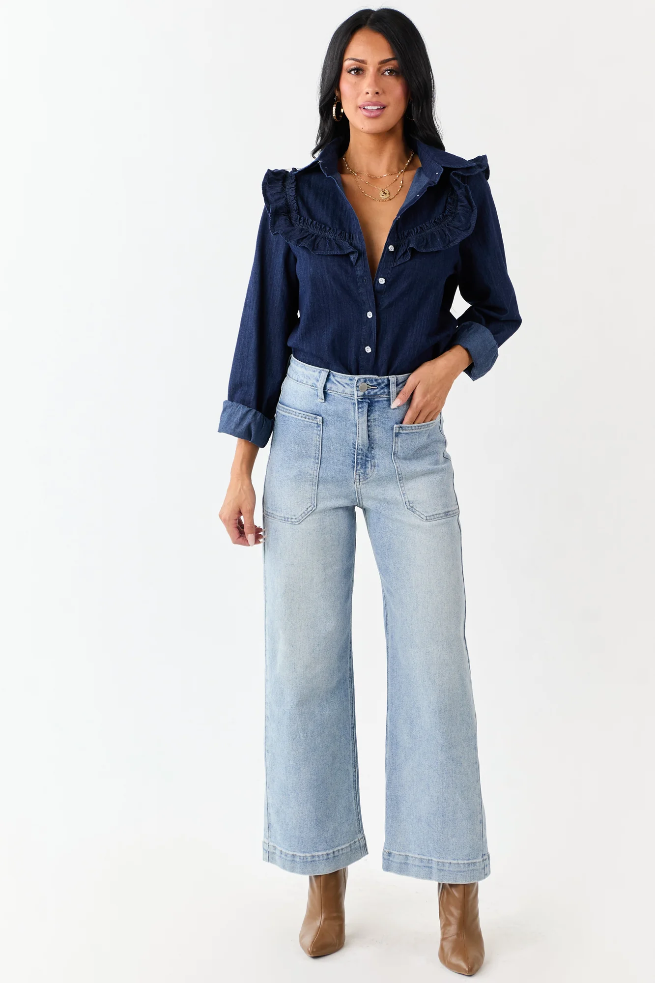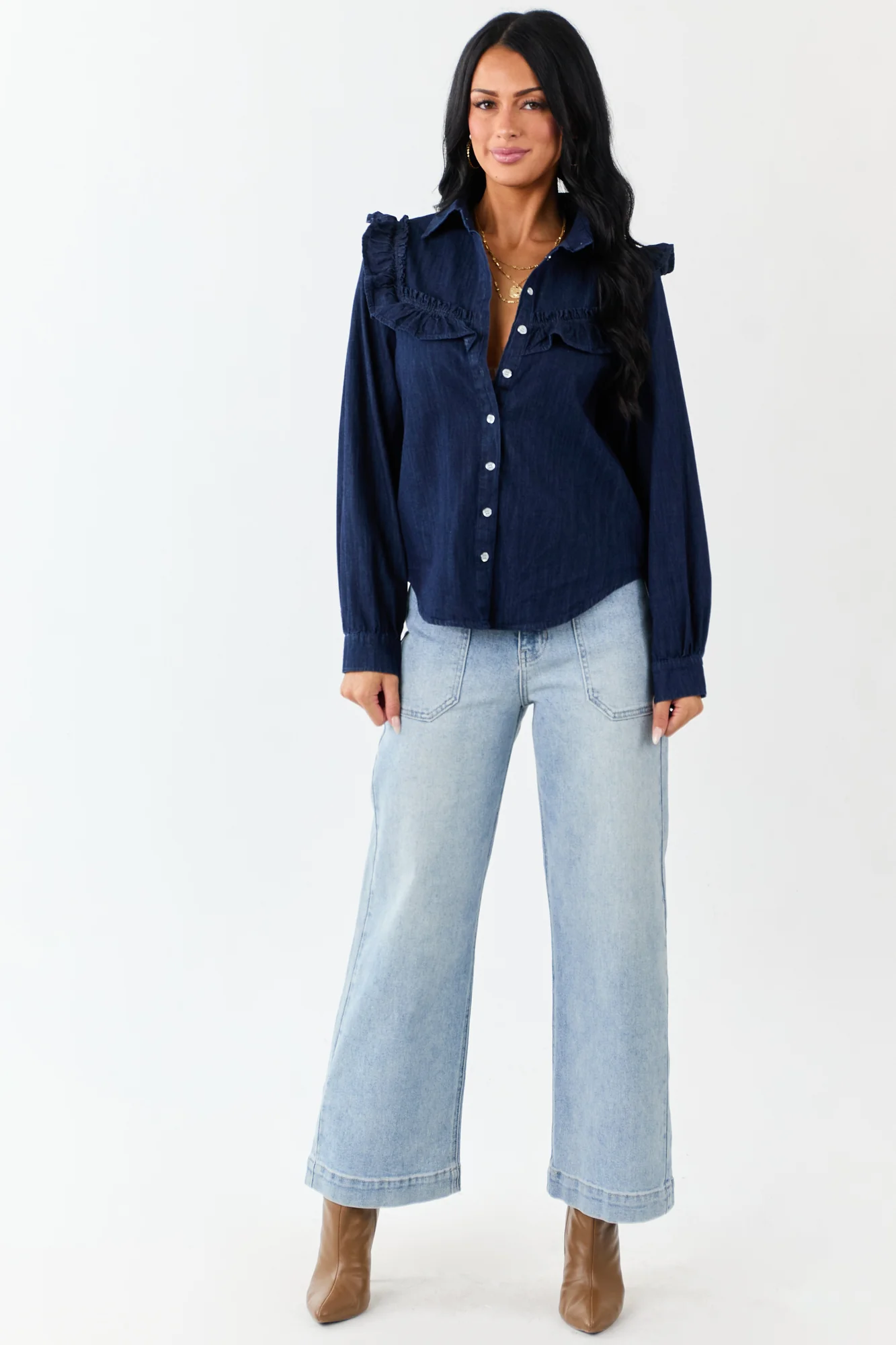 Upgrade your wardrobe with this dark denim button-up top featuring a ruffled yoke for added texture and style. Crafted from non-stretchy denim, this top offers a relaxed fit with a collared neckline, button cuffs, and 98% Cotton, 2% Polyester composition. Perfect for any occasion, this versatile piece x GeeGee is a must-have staple. Available in sizes S, M, and L.