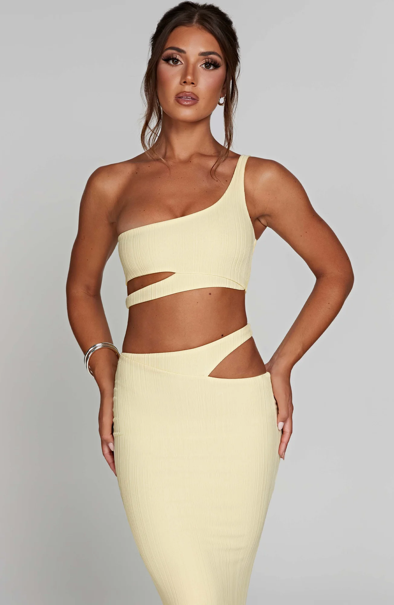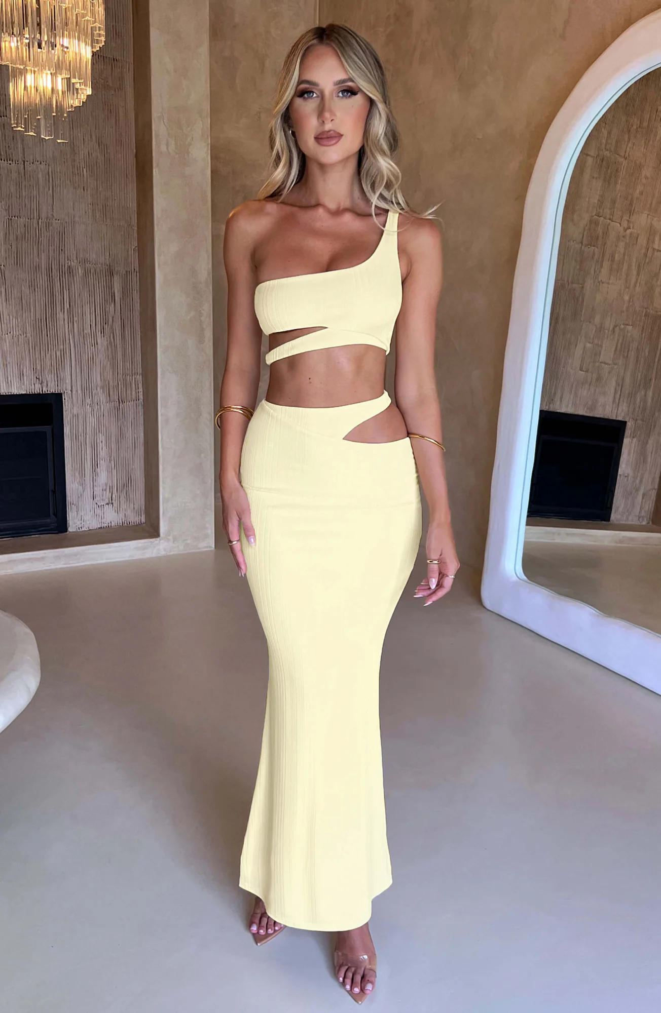 Elevate your style with the luxe textured Lemon Maxi Skirt featuring an extraordinary asymmetric design with cut-out detail, high waist, and floor-sweeping length. Made to hug curves comfortably, this skirt pairs perfectly with the matching Kaela crop top for a chic ensemble. Stand out with this vibrant piece at any event, whether its a festival, holiday gathering, or an evening out. The soft stretch knit ensures a flattering fit. Model is size XS. Available sizes: XS, S, M, L, XL, XXL.
