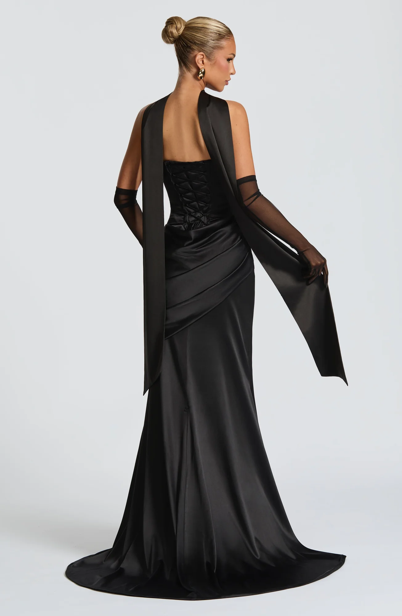 Indulge in elegance with our black satin maxi dress, perfect for formal occasions. The stretch satin fabric beautifully drapes the fit & flare skirt with a train for a sophisticated look. The strapless neckline and boned bodice ensure a structured silhouette, while the pleated cowl and lace-up back add intricate detail. Complete your ensemble with the Sybil scarf and Eli gloves (sold separately). Ideal for weddings, parties, and special events.