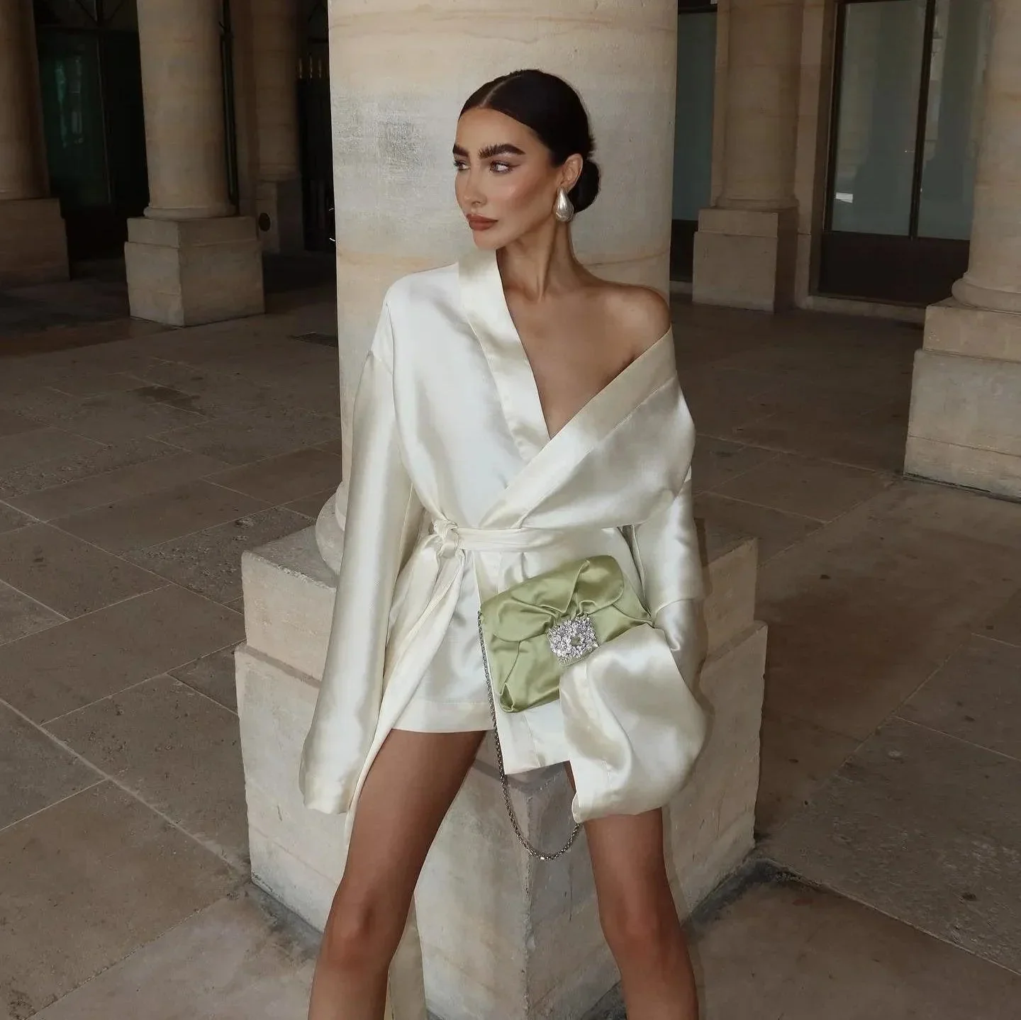 Elevate your evening wardrobe with this luxurious satin wrap mini dress featuring flowing long sleeves and a tie-waist detail for a flattering silhouette. Crafted from premium satin with a silky sheen, this dress exudes timeless elegance and modern sophistication, making it the perfect statement piece for any special occasion. For a customizable fit and maximum comfort, the wrap-style design enhances your waistline while the mini length hemline adds a modern edge. Explore more style inspirations on Instagram @mermaid_way. Enjoy a complimentary size exchange if needed.