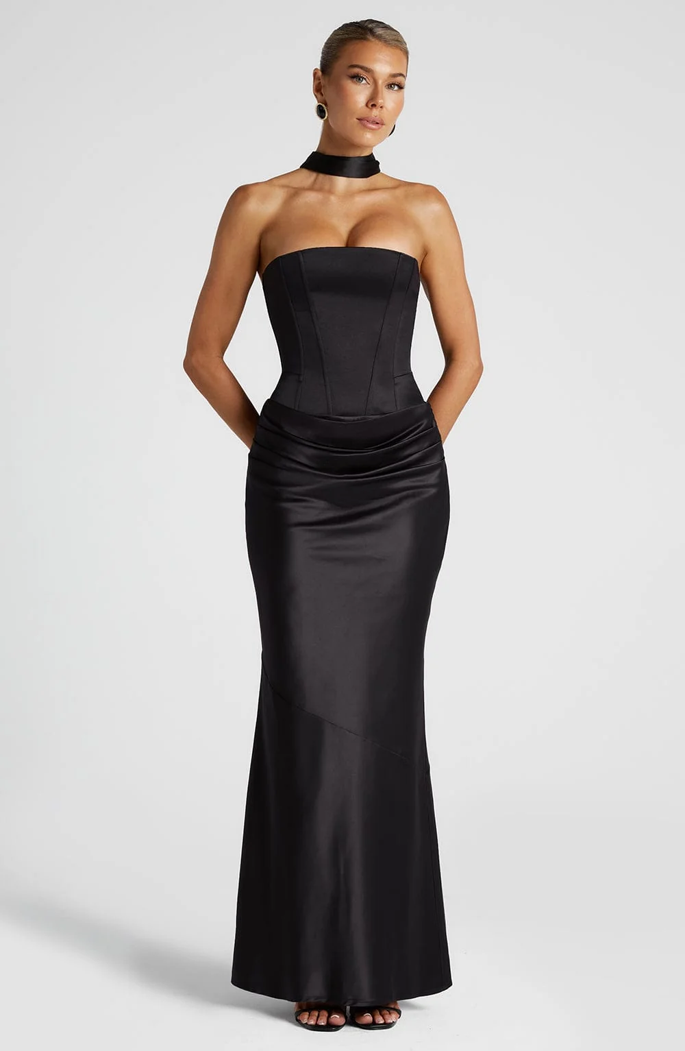 Indulge in luxury with our black maxi skirt from M.T. This premium stretch satin skirt, cut on the bias for a beautiful drape, features a pleat detail and diagonal seam at the knee. Elevate your look with the Audra top for a dreamy, luxe ensemble. The skirt is fully lined, has a low-rise cut, and fastens with an invisible zipper. Perfect for evening parties, birthdays, and nights out, this maxi length skirt exudes elegance and sophistication.