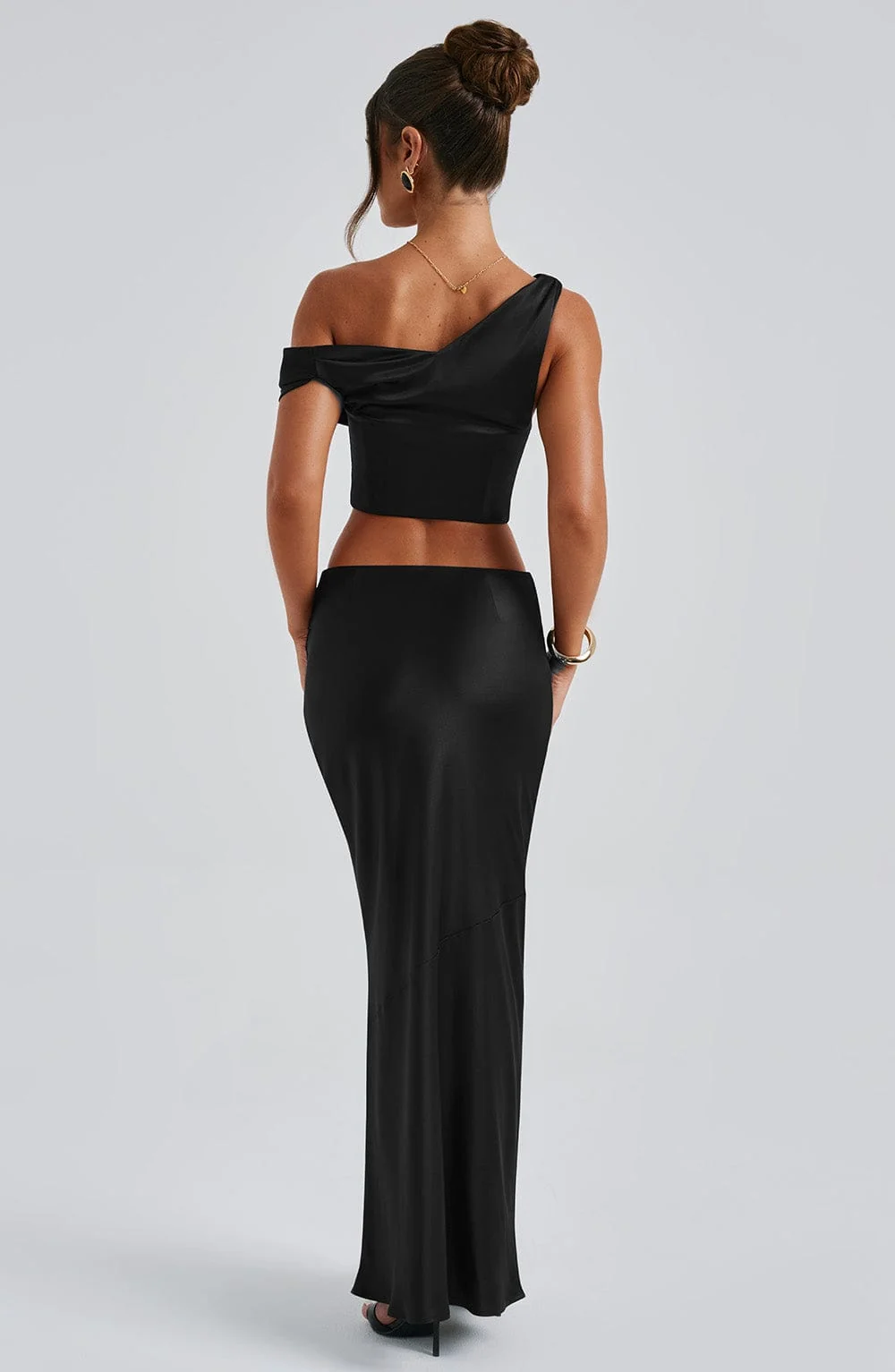 Indulge in luxury with our premium stretch satin Audra top in elegant black. Showcasing an off-shoulder style with twist strap detailing and an internal corset for a defined silhouette. This exquisite piece features a draped cowl detail, a shaped hem, and an invisible zipper. Fully lined for comfort and style. Perfect for evening affairs, parties, or a chic night out. Pair with our Bernadette skirt for a lavish ensemble that turns heads.