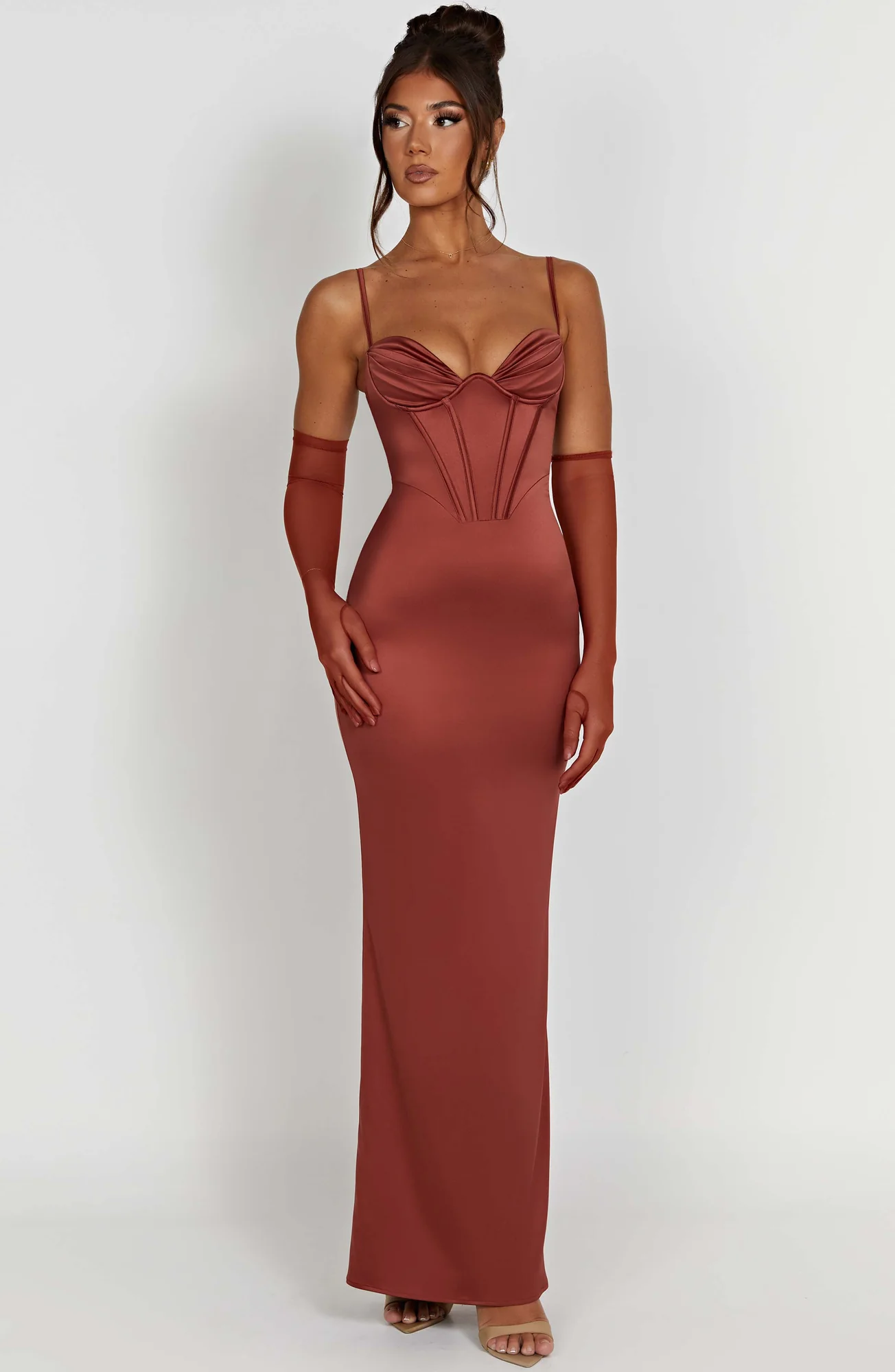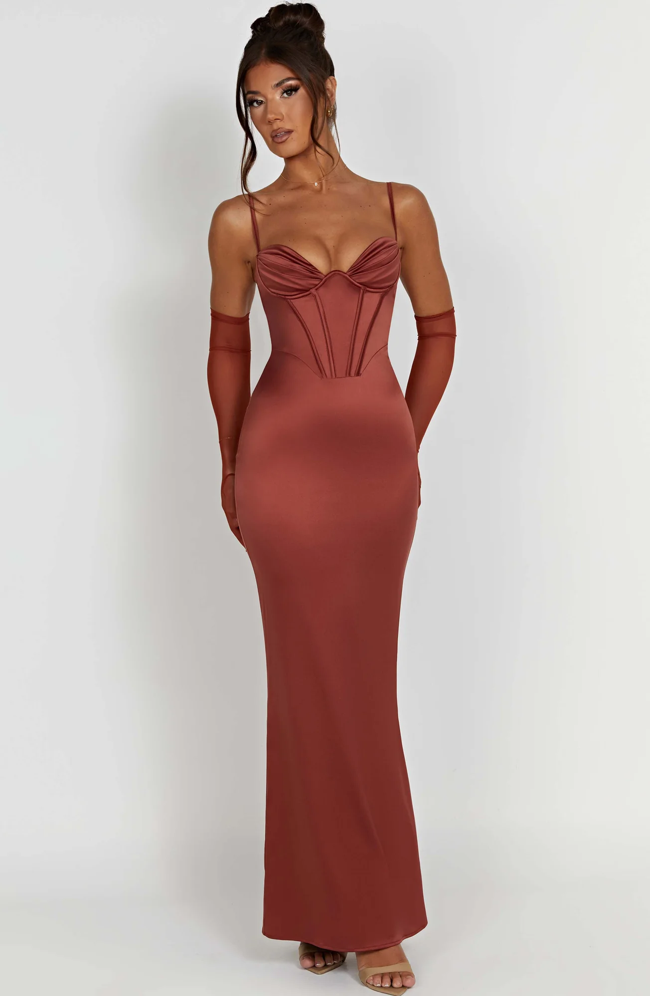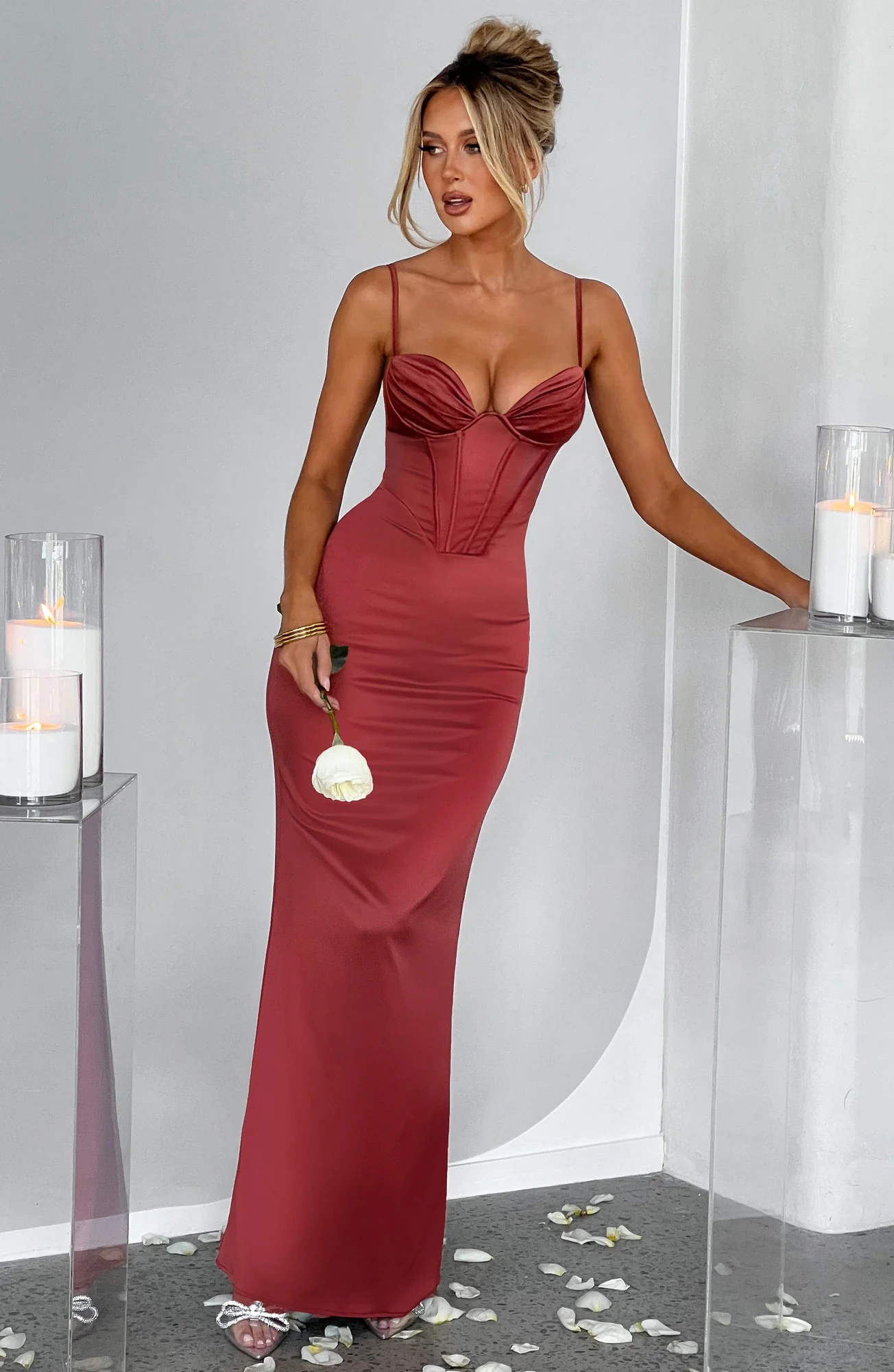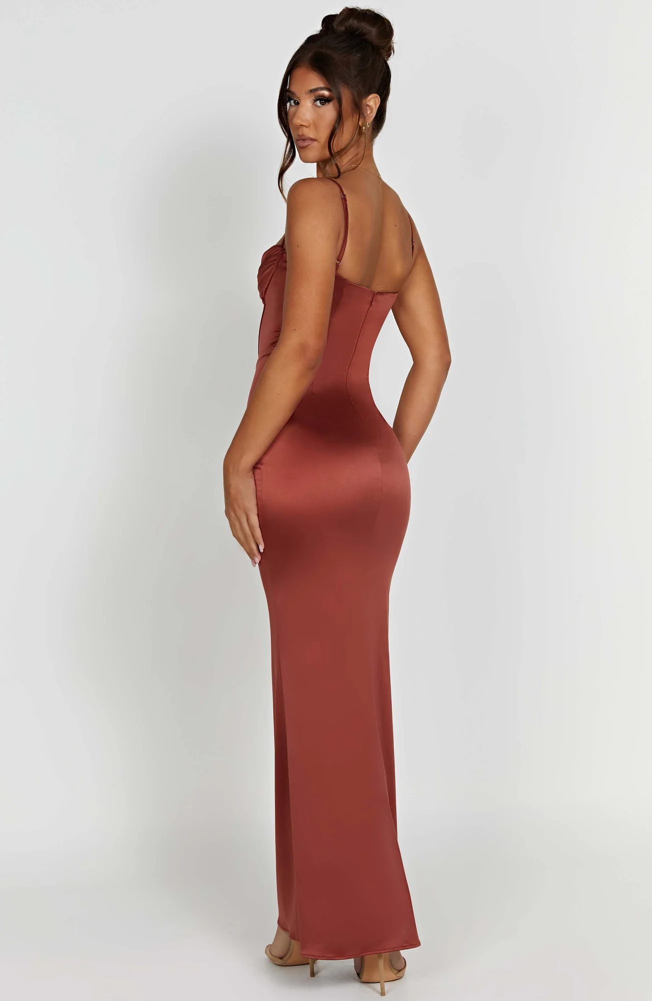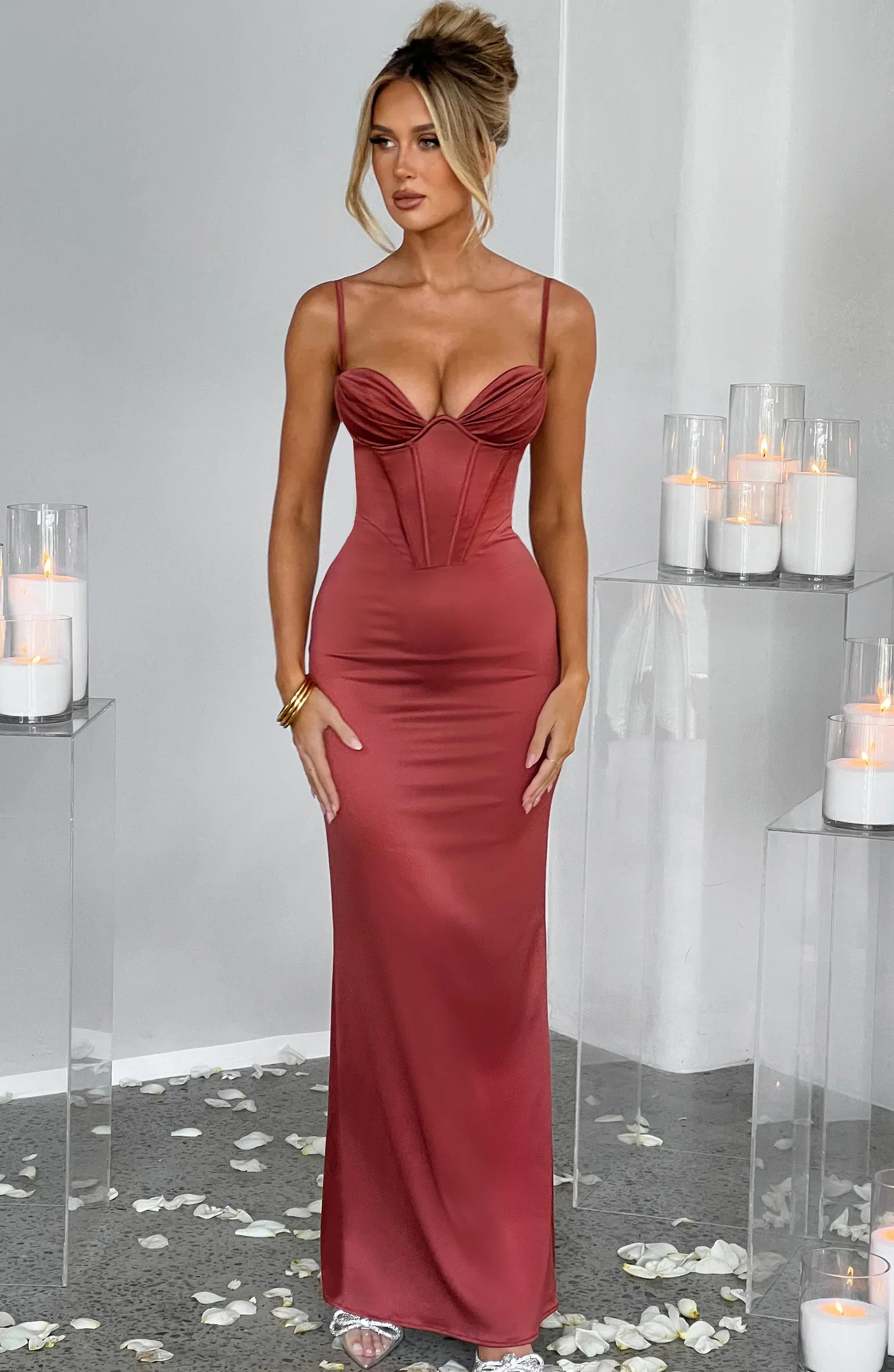 Indulge in the elegance of our Luxury Rust Satin Maxi Dress featuring a figure-hugging design with a corseted bodice for a flawlessly snatched look. Crafted from high-quality stretch satin, this showstopper boasts a pleated detail and underwired cups for uplifted cleavage. Adjustable straps ensure a tailored fit, while the floor-sweeping skirt adds drama. Perfect for evening events, formal occasions, weddings, and prom. Model in image is wearing size XS. Available in XS to XXL.