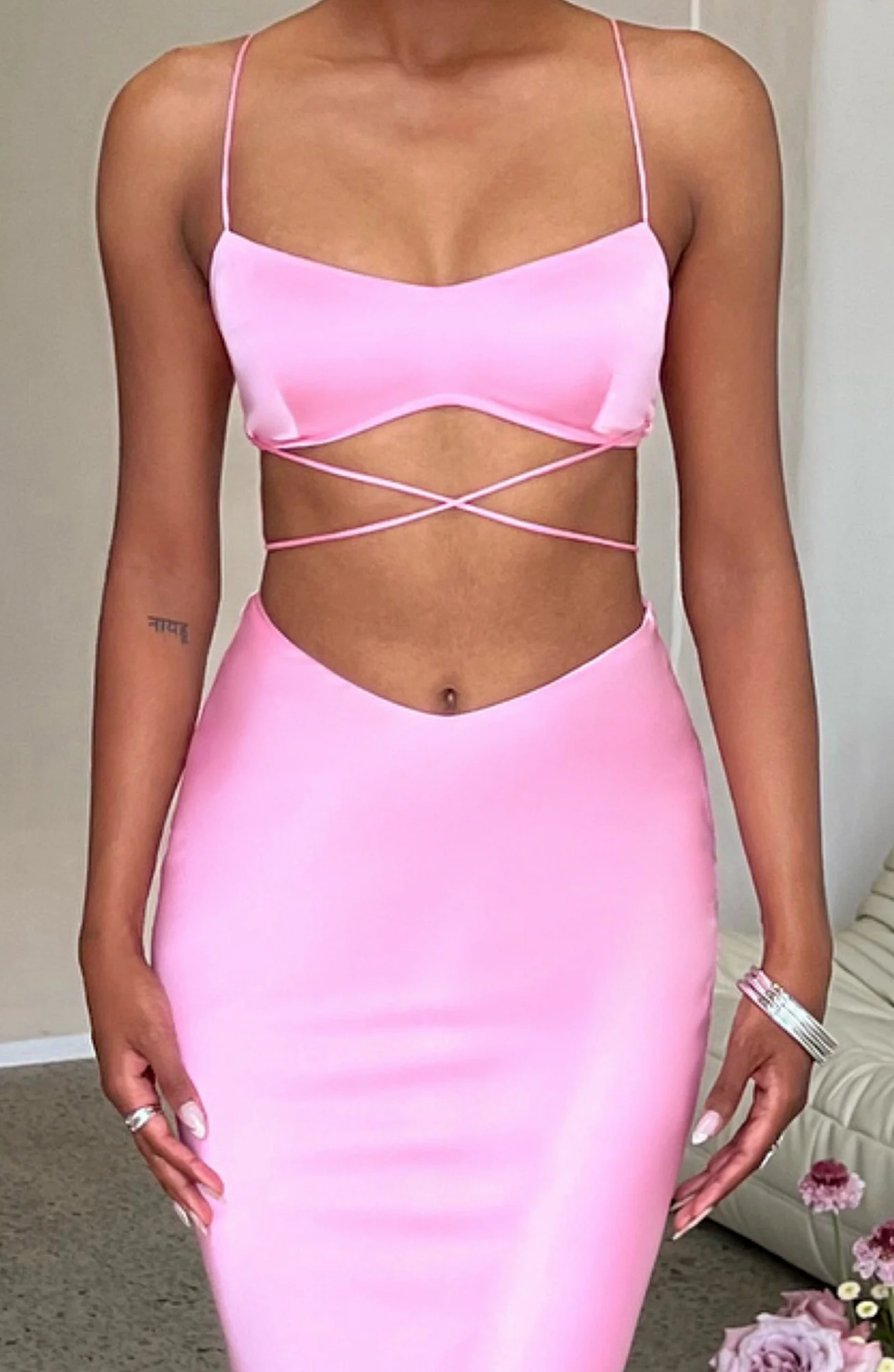 Elevate your style with Valeria, the must-have luxury satin crop top in stunning baby pink. Crafted for a perfect fit using premium stretch satin, featuring a chic tie waist detail and a trendy cut-out, strappy back design. Fully lined for comfort, this bias-cut crop top accentuates your figure flawlessly, making it a versatile piece for any occasion. Available in sizes XS to XXL. Bring sophistication and elegance to your wardrobe with Valeria.