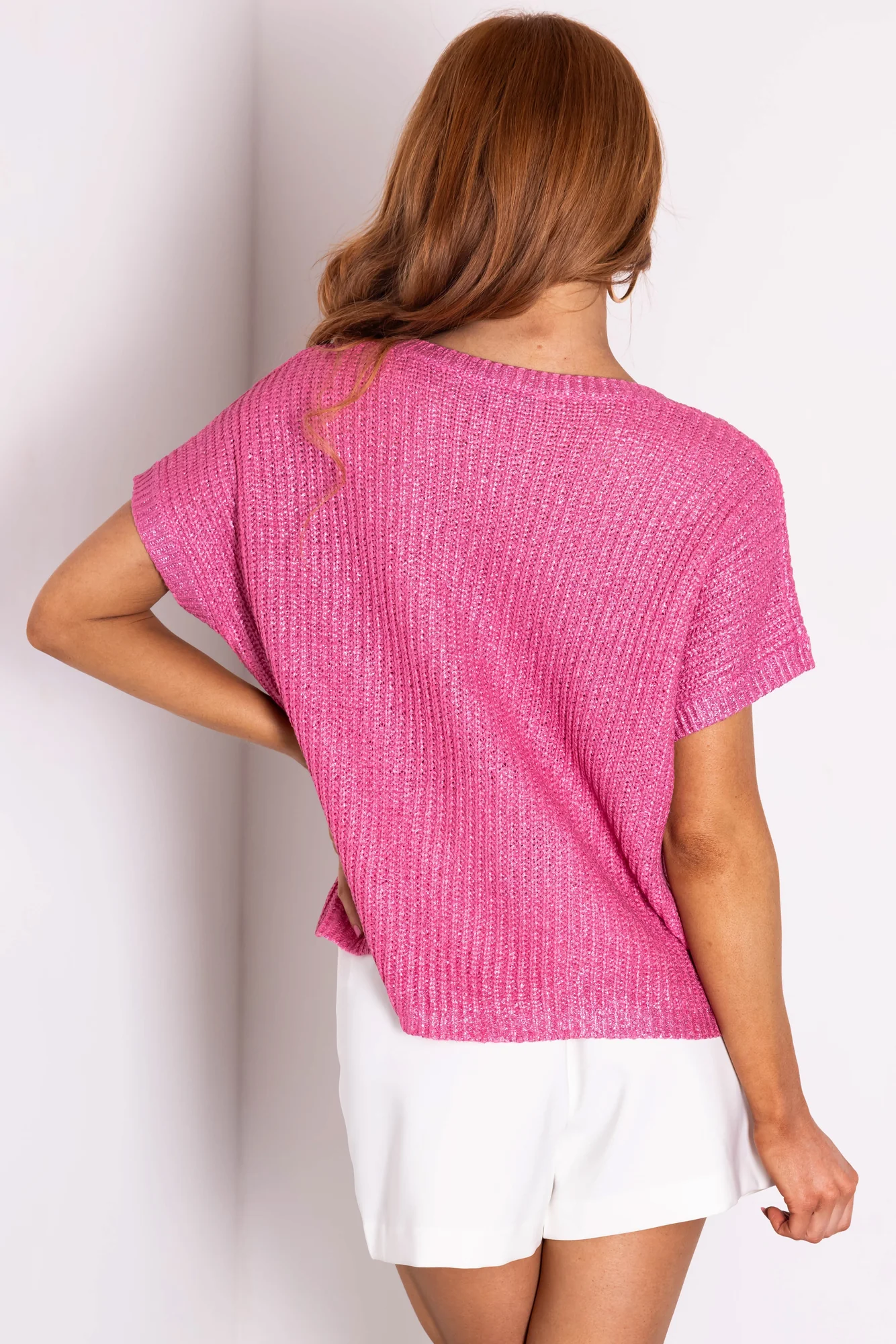 Tags: magenta top, Metallic Knit Top, She + Sky Top, short sleeve top, V-Neck Top