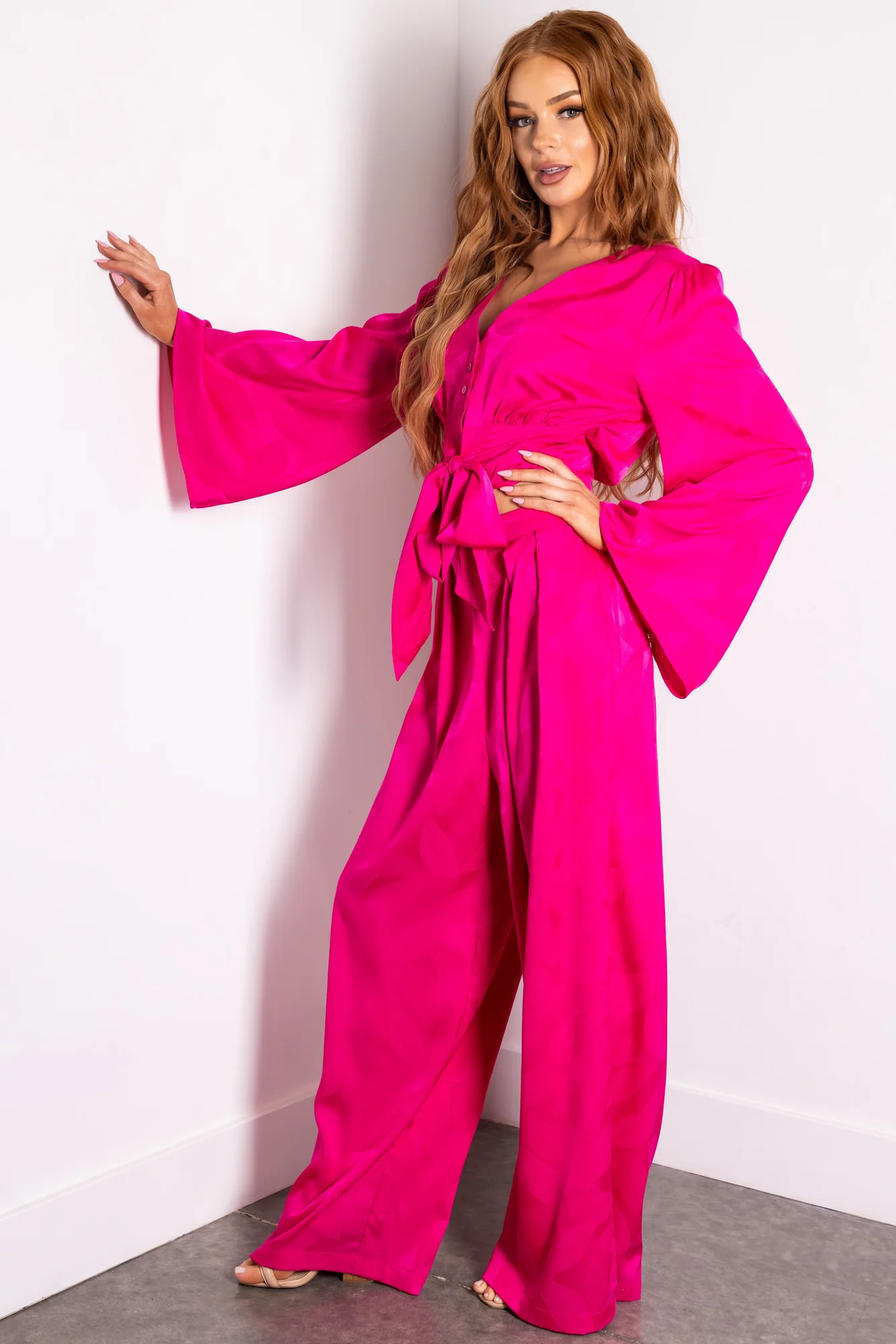 Indulge in the elegance of these Magenta Textured Wide Leg Satin Pants . Crafted from non-stretchy satin fabric, these pants feature a pleated front, high waist, and elastic back for comfort. Pair with the matching Bell Sleeve Top for a complete ensemble. This imported piece is perfect for date nights and evening outings. Care instructions: Hand wash cold, wash separately, do not bleach, lay flat to dry. Model is wearing size Small. Model’s Profile: Size 1, Height 55, Bust 31, Waist 24