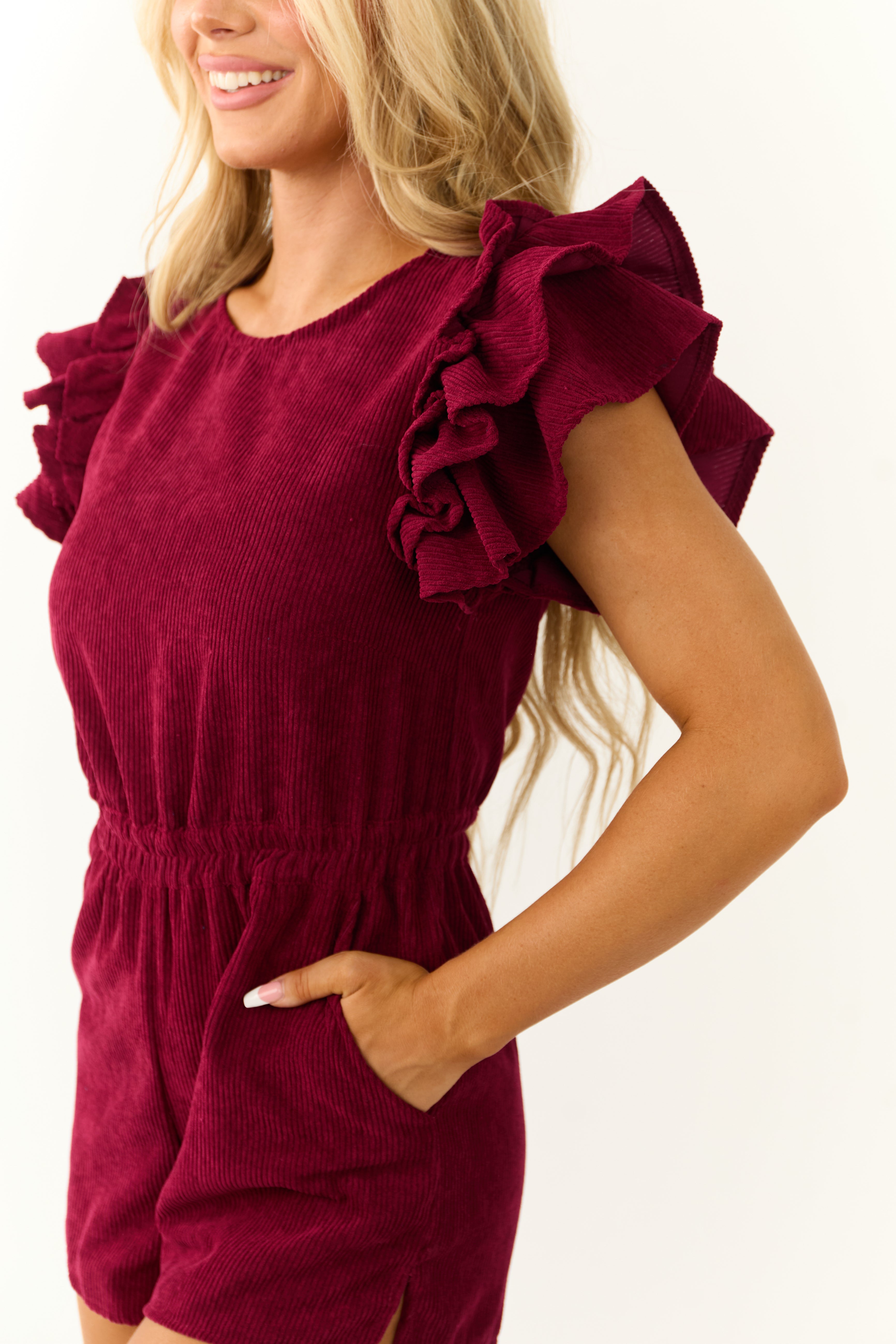 Indulge in charming elegance with our Maroon Corduroy Romper featuring delightful ruffle sleeves. Tailored for comfort and style, this romper boasts an elastic waistband, round neckline, and practical side pockets. Embrace sophistication effortlessly in this non-stretchy corduroy piece. Hand wash for lasting allure.