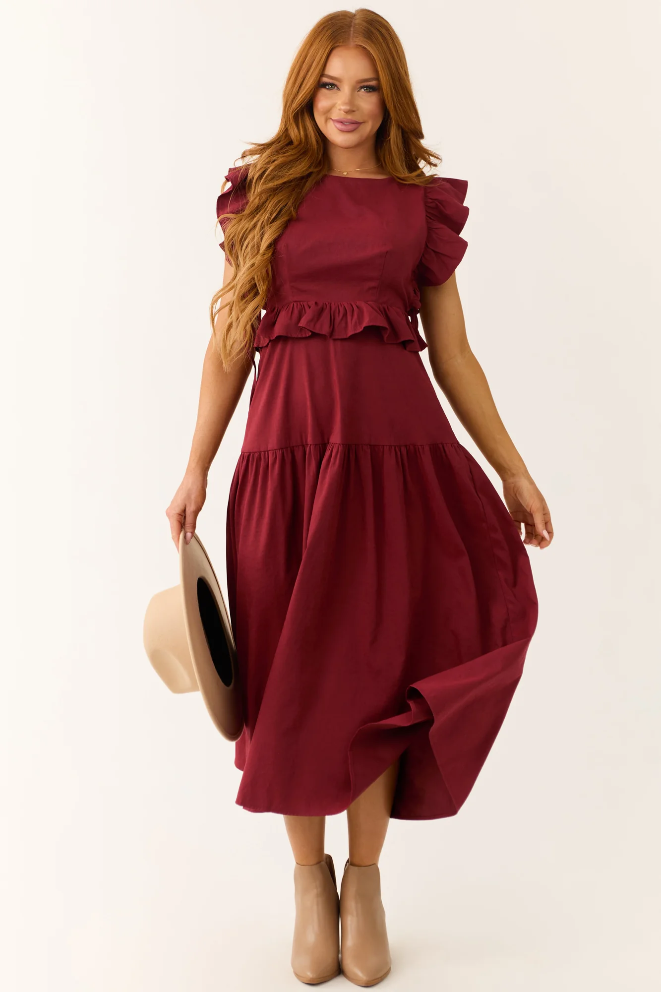 This stunning Maroon Ruffle Sleeve Midi Dress is a wardrobe essential for a stylish look. Crafted from 75% Polyester and 25% Nylon, it features a tiered skirt, ruffle waist detail, and an open back with a zigzag laced tie, adding a touch of elegance. The dress is fully lined with 100% Polyester for comfort. Perfect for date night or daytime events, this dress is non-stretchy and fits true to size. Hand wash cold, do not bleach, line dry. Available in sizes S, M, and L.