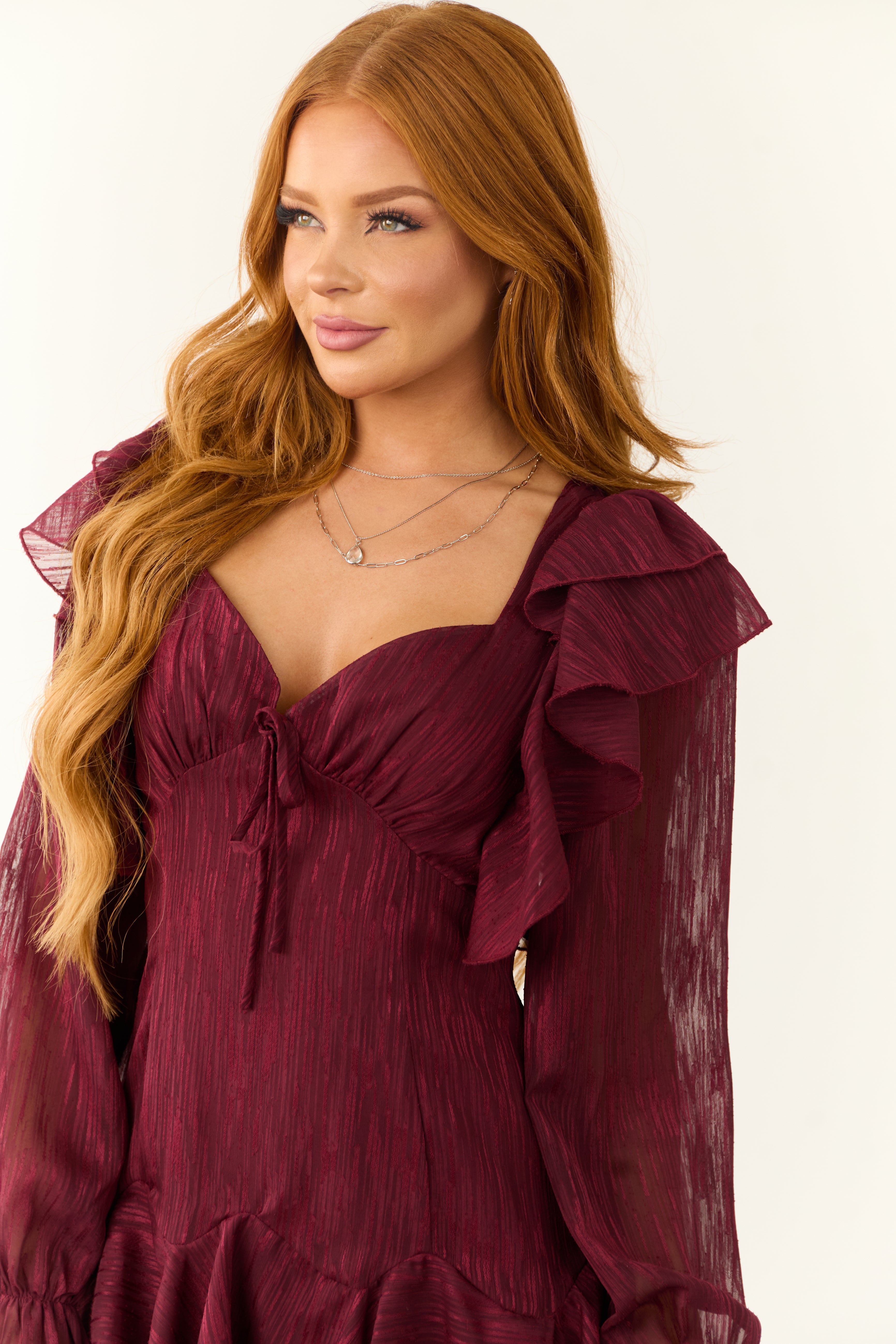 This Maroon Short Dress features a deep sweetheart neckline, long puff sleeves, drop waist, and ruffle hem for a chic and stylish look. Made of non-stretchy textured woven fabric, this dress is lined with a zippered back and open back with adjustable tie. Perfect for fall and winter seasons. Available in sizes S, M, L. Bust: 36-38″, Waist: 28-32″, Length: 33-34″. Hand wash cold, hang to dry. Sizing: Model #1 wears size Small – Height 58″, Model #2 wears size Small – Height 55″.