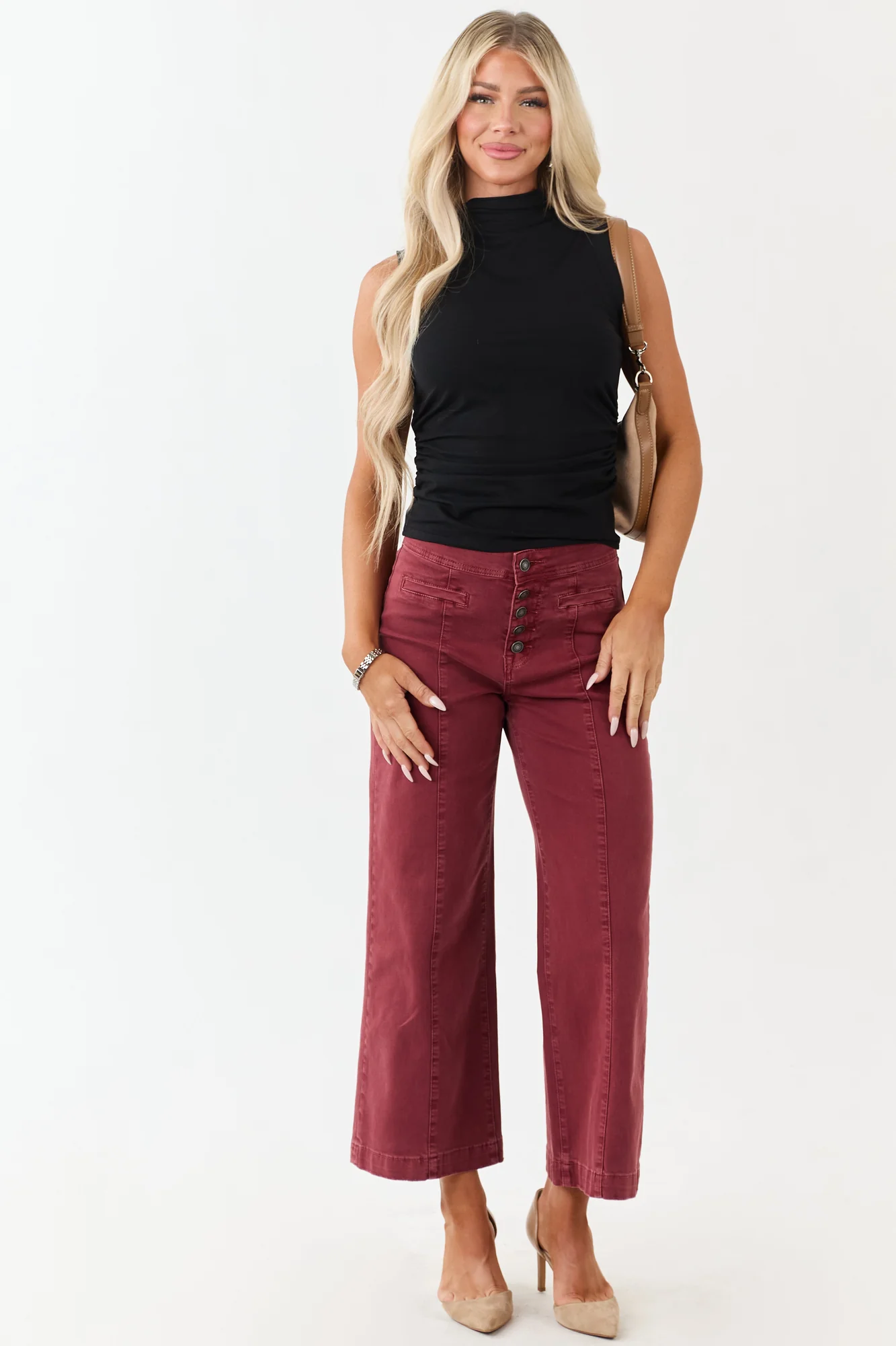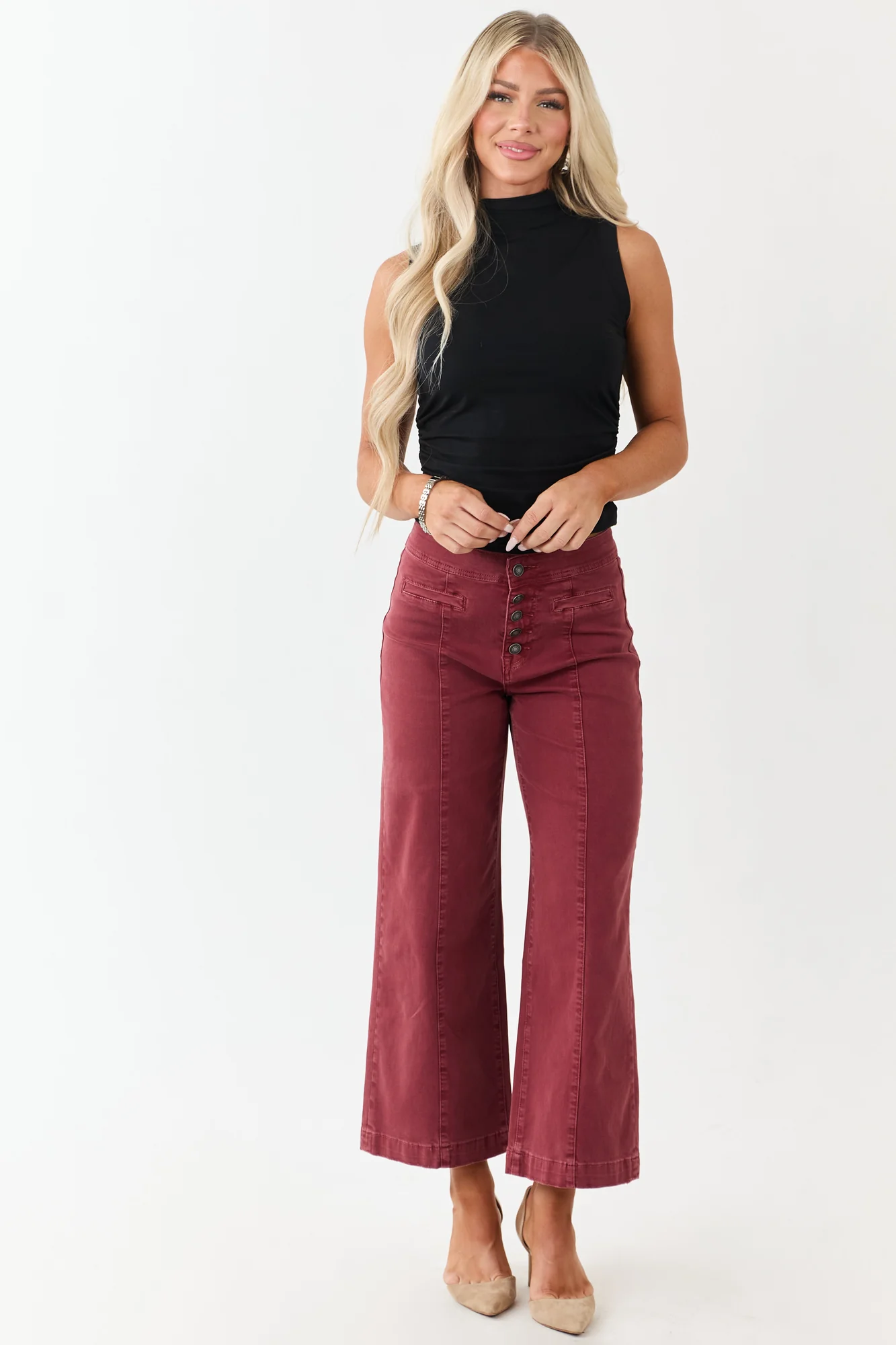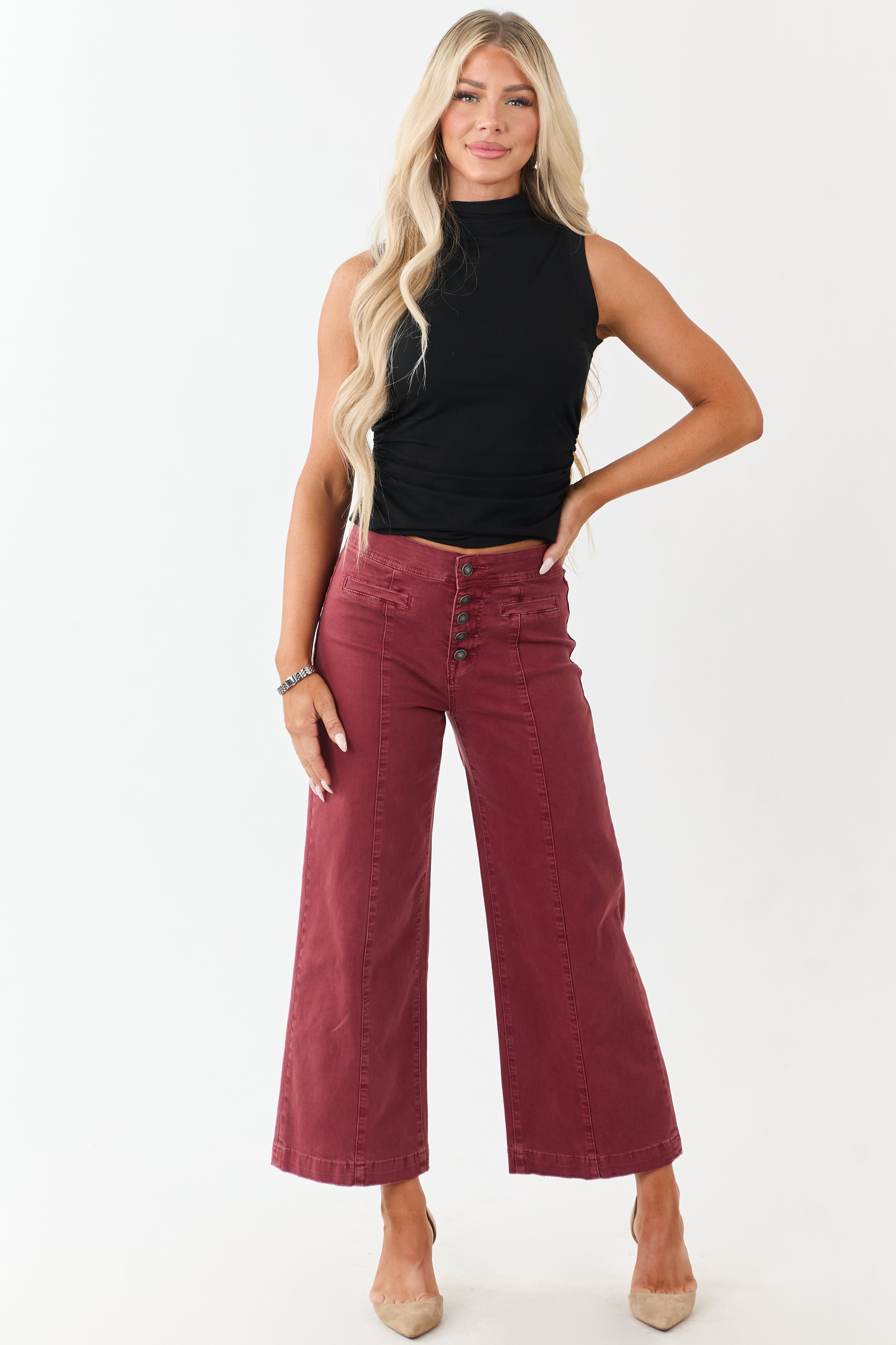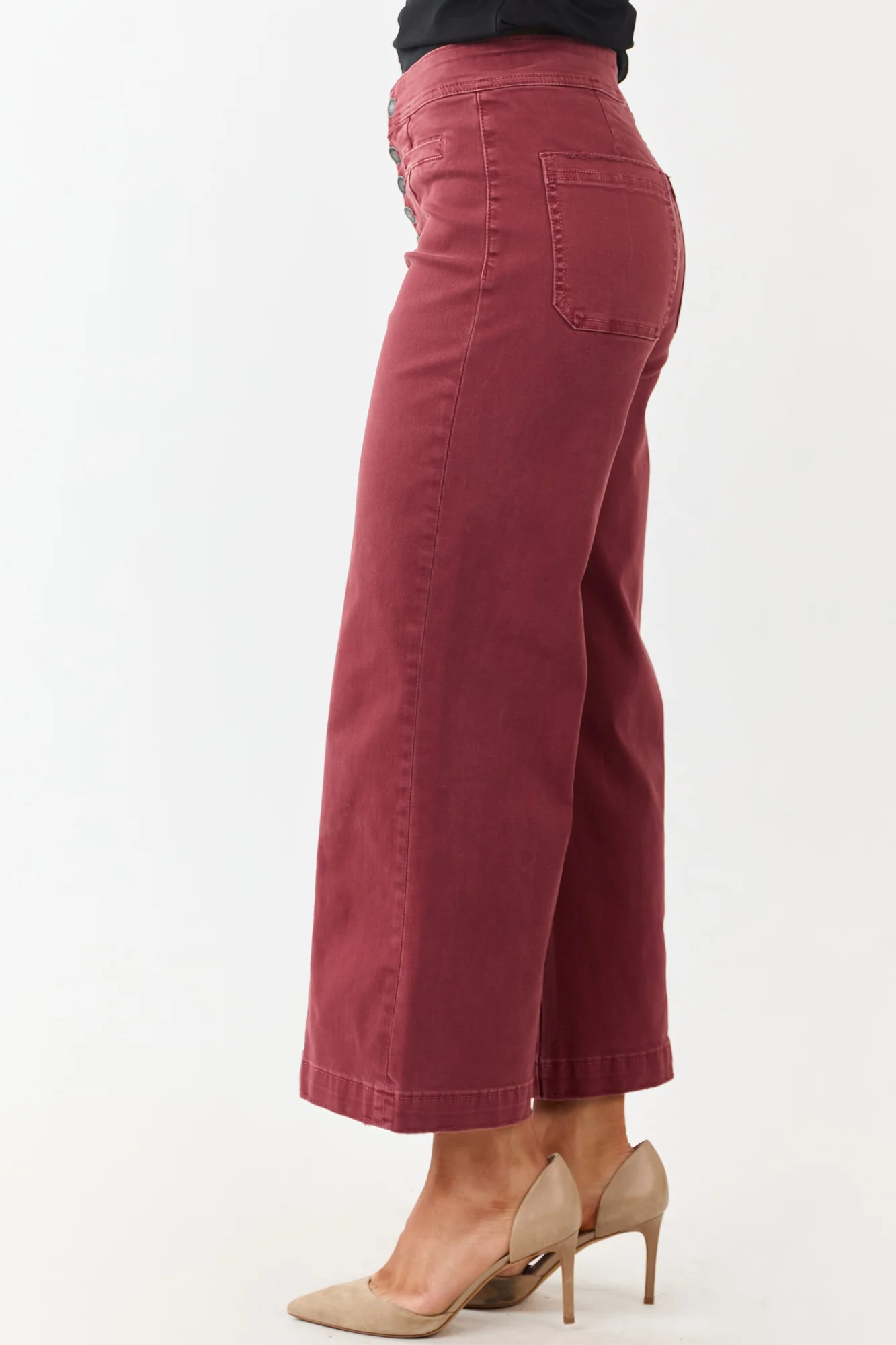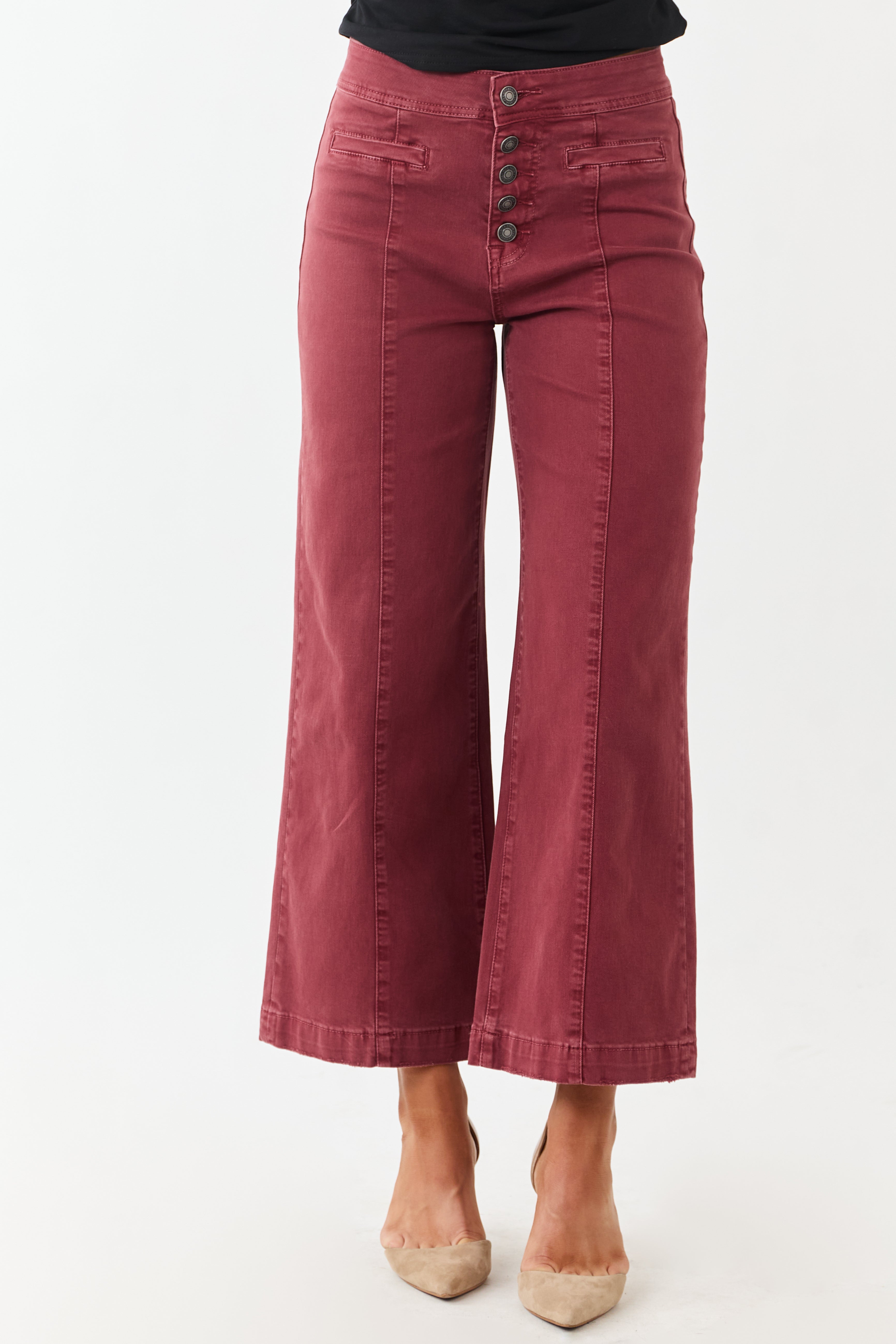 Stand out in style with these maroon wide leg crop jeans, featuring a vintage button fly and comfortable stretch fabric for a bold and everyday statement. These jeans are designed with a high rise, button fly, and faux front pockets. Made from 98% cotton and 2% spandex, these jeans are true to size and slightly forgiving in the waist. The inseam measures 26 inches. Imported. Model is wearing a size 26 and has a waist measurement of 26 inches. Perfect for a casual and trendy look.