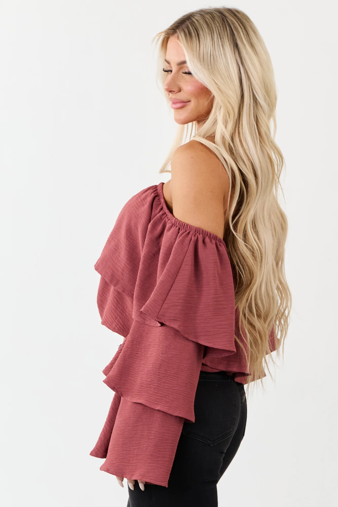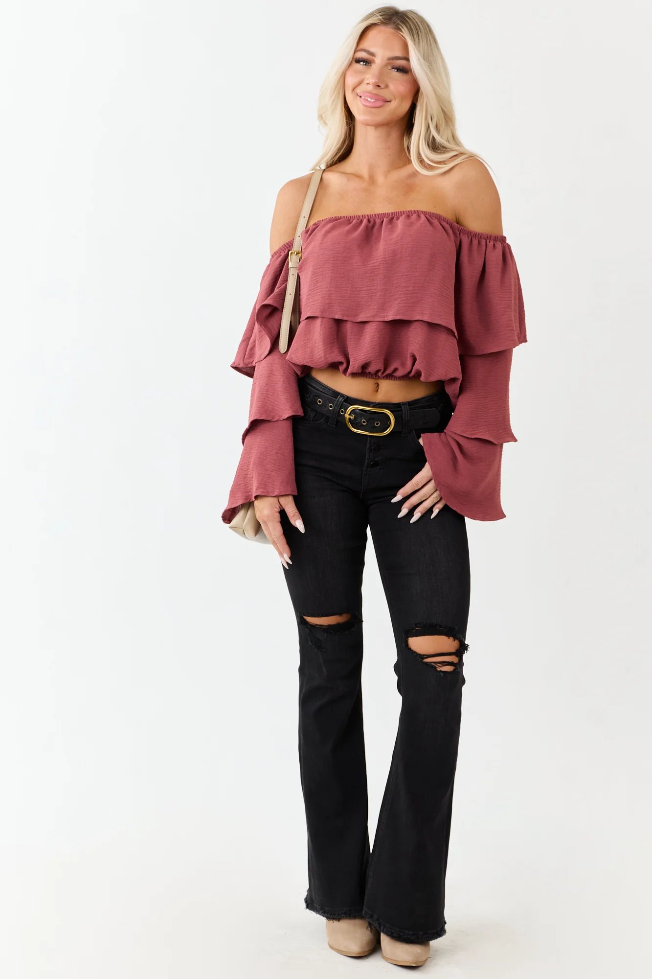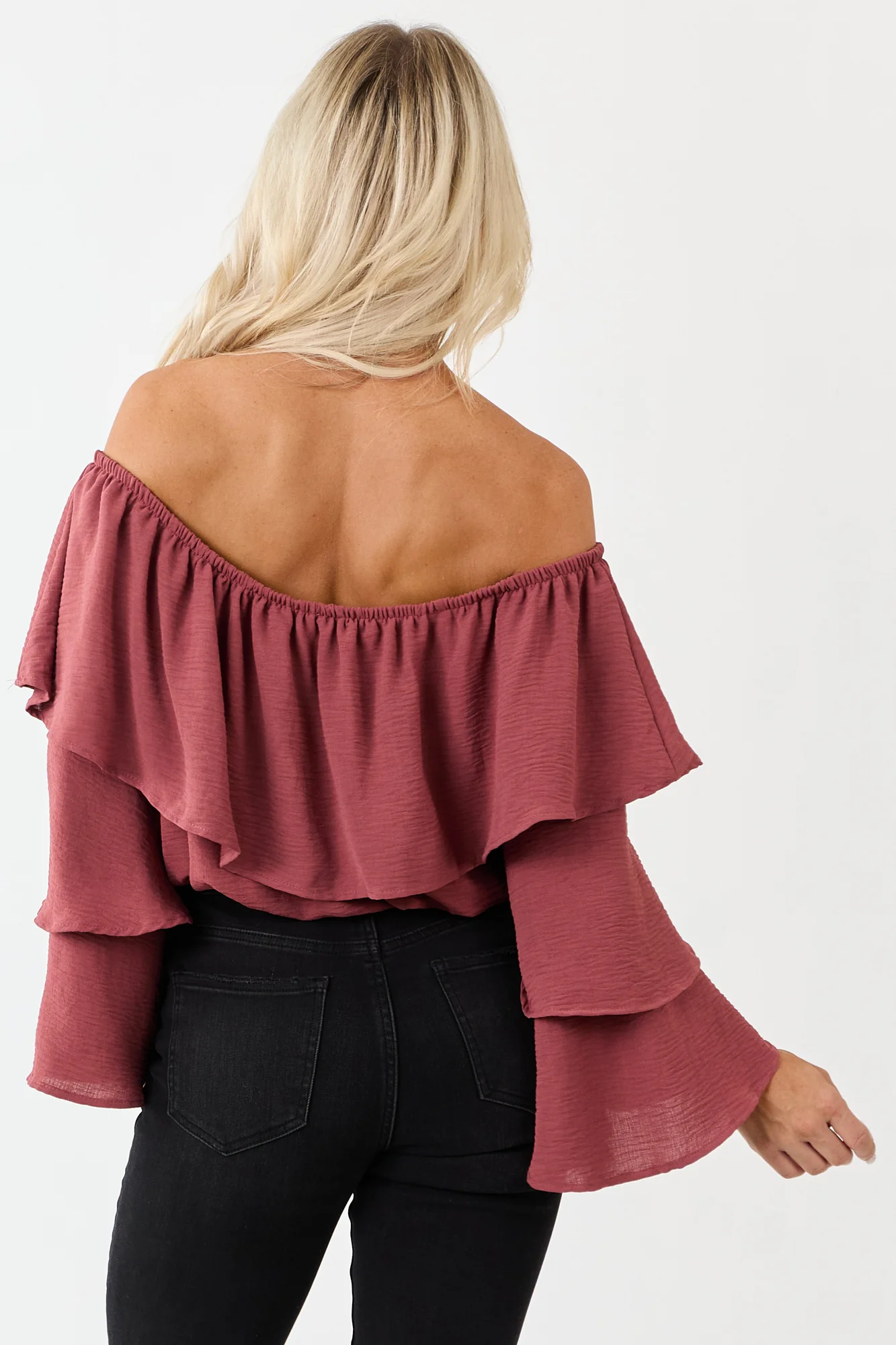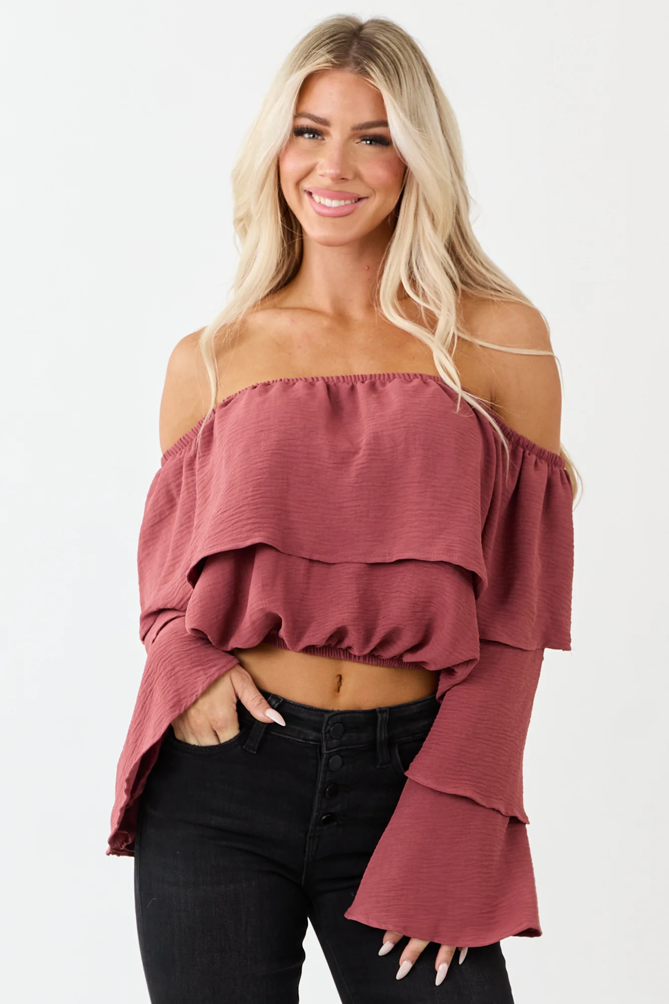 Experience a blend of sophistication and charm with our Marsala Off Shoulder Tiered Sleeve Blouse. The statement-making top features elastic neckline and hem, tiered flutter bell sleeves, bust overlay, and a cropped length for a trendy look. Crafted from 100% Polyester, this piece exudes elegance and style. Available in sizes S, M, and L. Add a touch of drama to your wardrobe with this chic blouse.