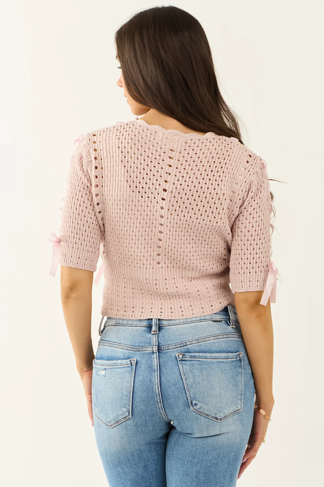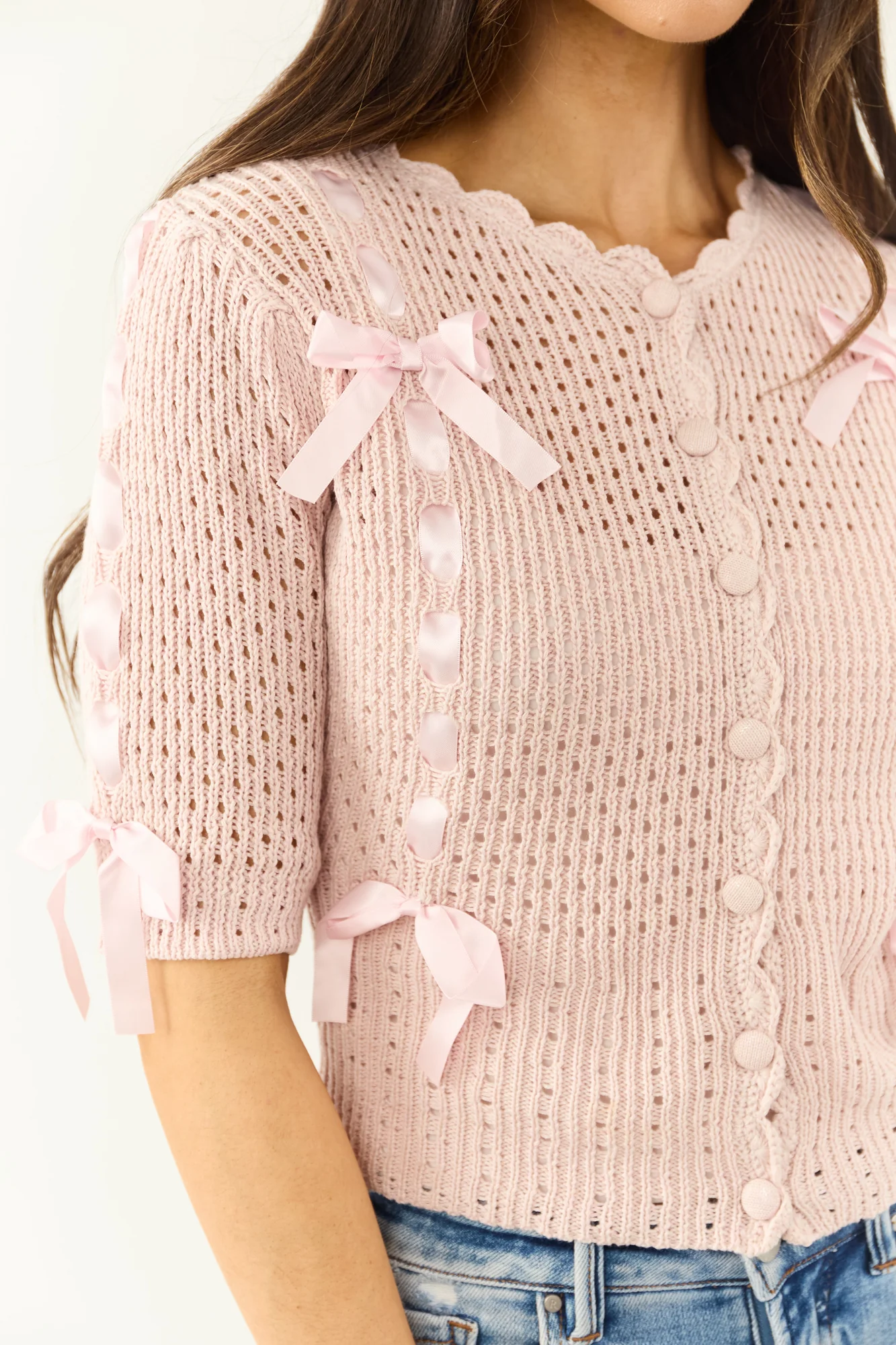 Wrap yourself in cozy charm with this open knit mauve cotton button-down cardigan featuring scalloped edge pointelle design and satin ribbon details. Perfect for a stylish and comfortable look. This half-sleeve cardigan with a scalloped neckline is unlined and made of 100% imported cotton. Available in sizes S, M, and L. Ideal for a fashionable summer wardrobe. Model is wearing a size Small and is 56″ tall.