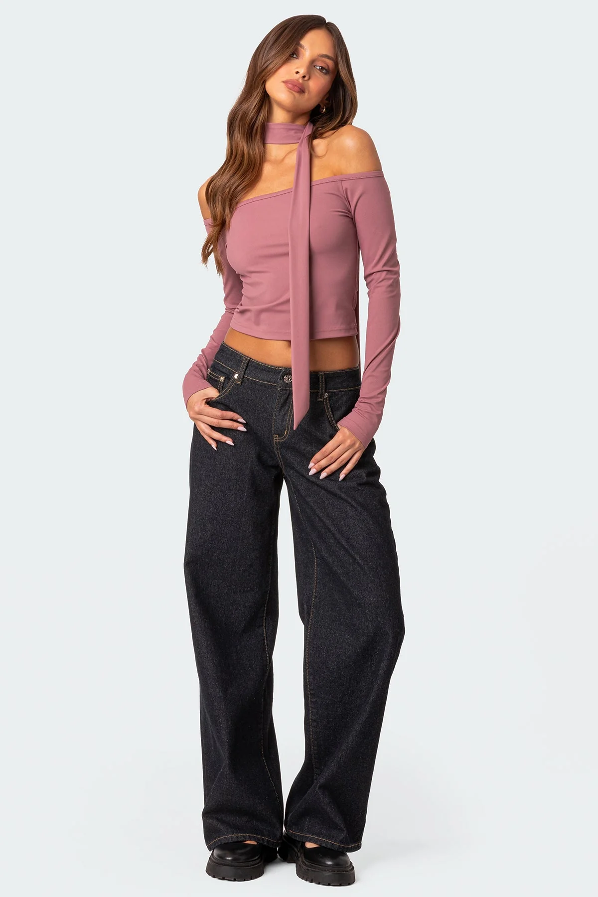 Stay stylish and cozy with our mauve off-shoulder top featuring a matching scarf. This two-piece set includes an off-shoulder neckline, long sleeves, and is made of polyester and spandex blend for a comfortable fit. Perfect for any occasion, pair it with your favorite bottoms for a chic look. Model wears size S. Model height is 59. Care instructions: Machine wash cold with like colors.