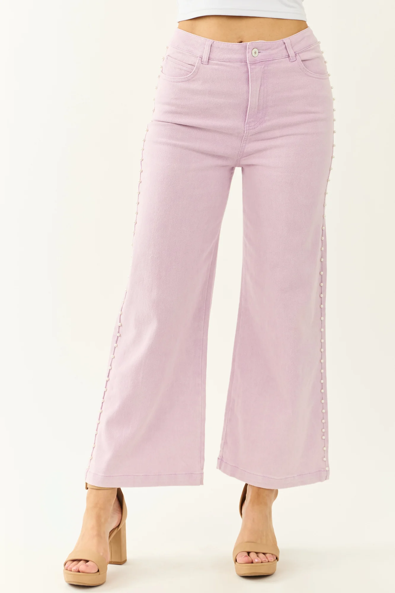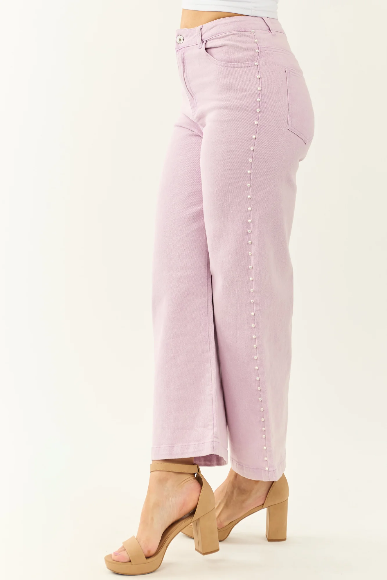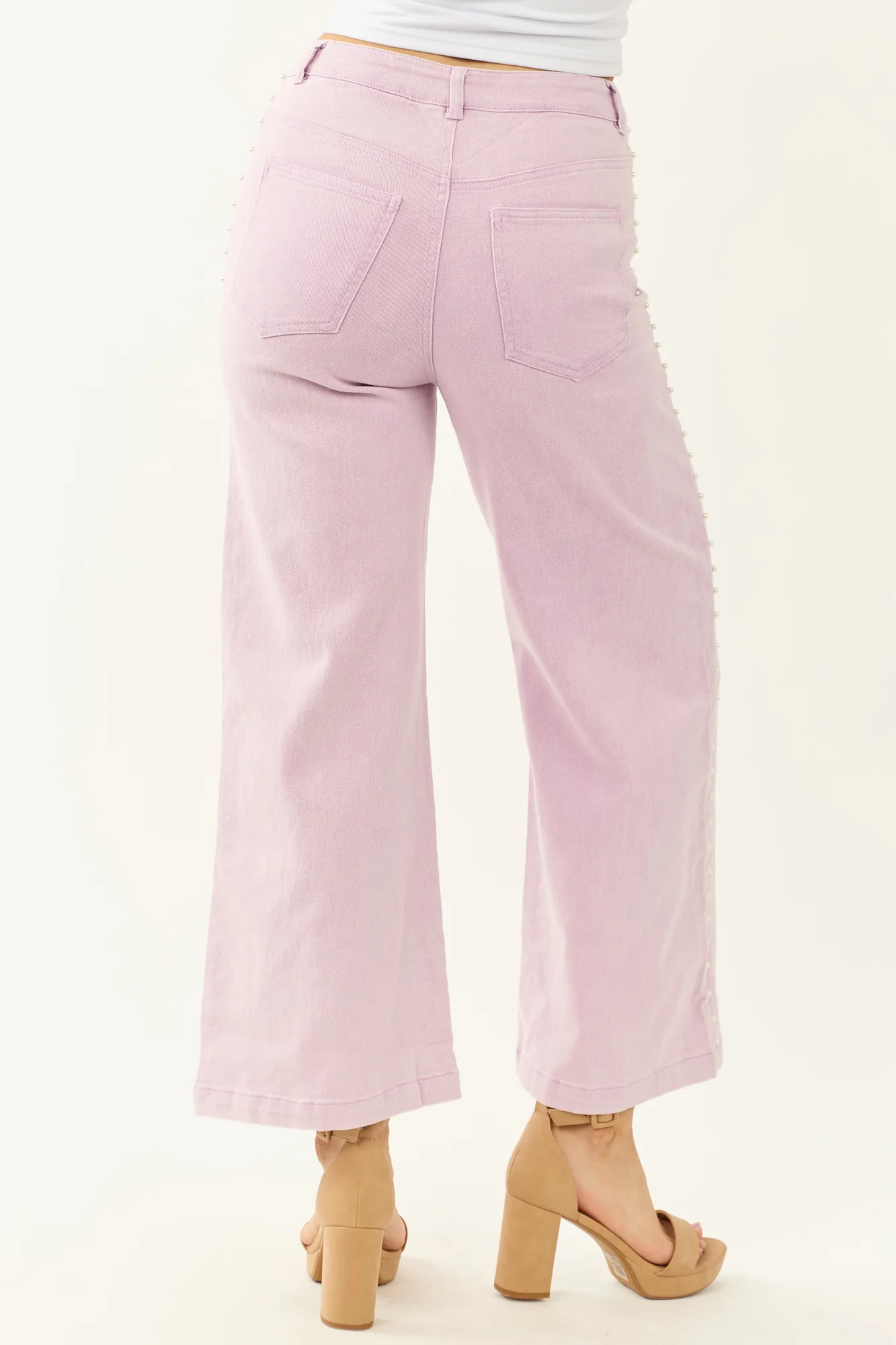 Float through your day in dreamy soft mauve wide leg jeans adorned with pearls for a touch of glam! These ankle-length jeans feature stretchy denim, 4 functional pockets, high rise waist, and a variety of inseam options. Made of 75% Cotton, 23% Polyester, and 2% Spandex. Imported.