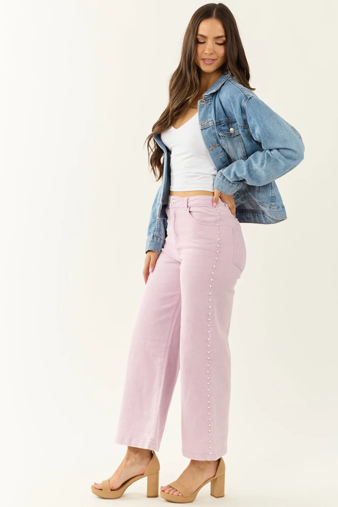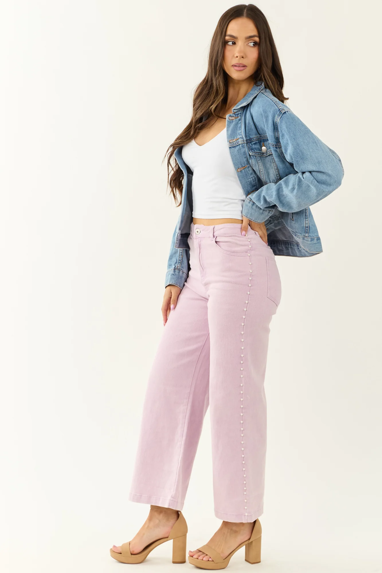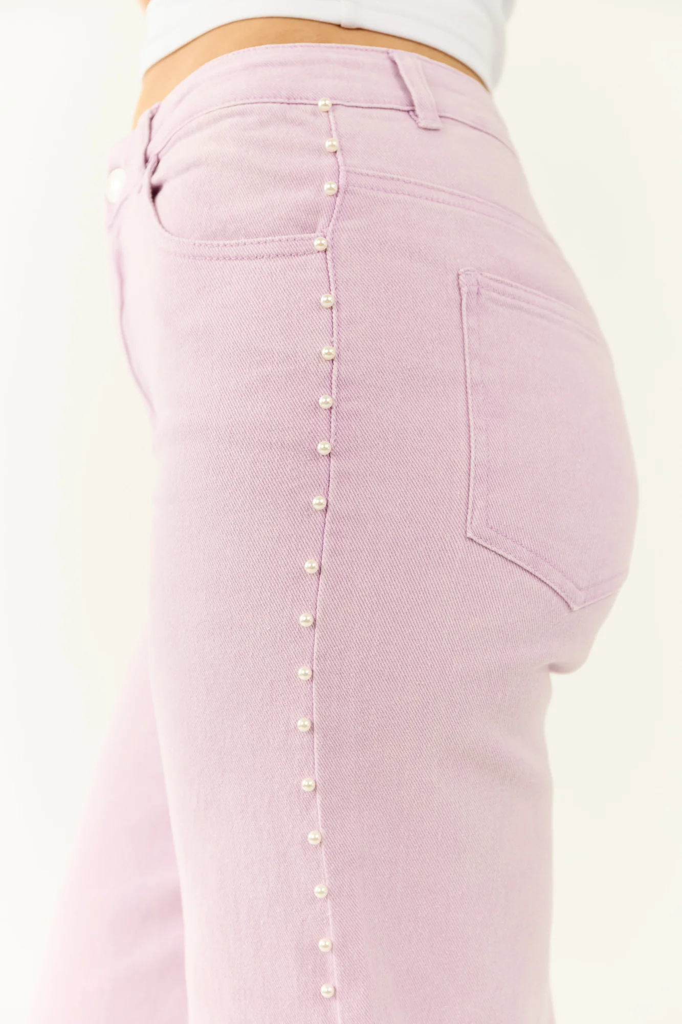 Float through your day in dreamy soft mauve wide leg jeans adorned with pearls for a touch of glam! These ankle-length jeans feature stretchy denim, 4 functional pockets, high rise waist, and a variety of inseam options. Made of 75% Cotton, 23% Polyester, and 2% Spandex. Imported.