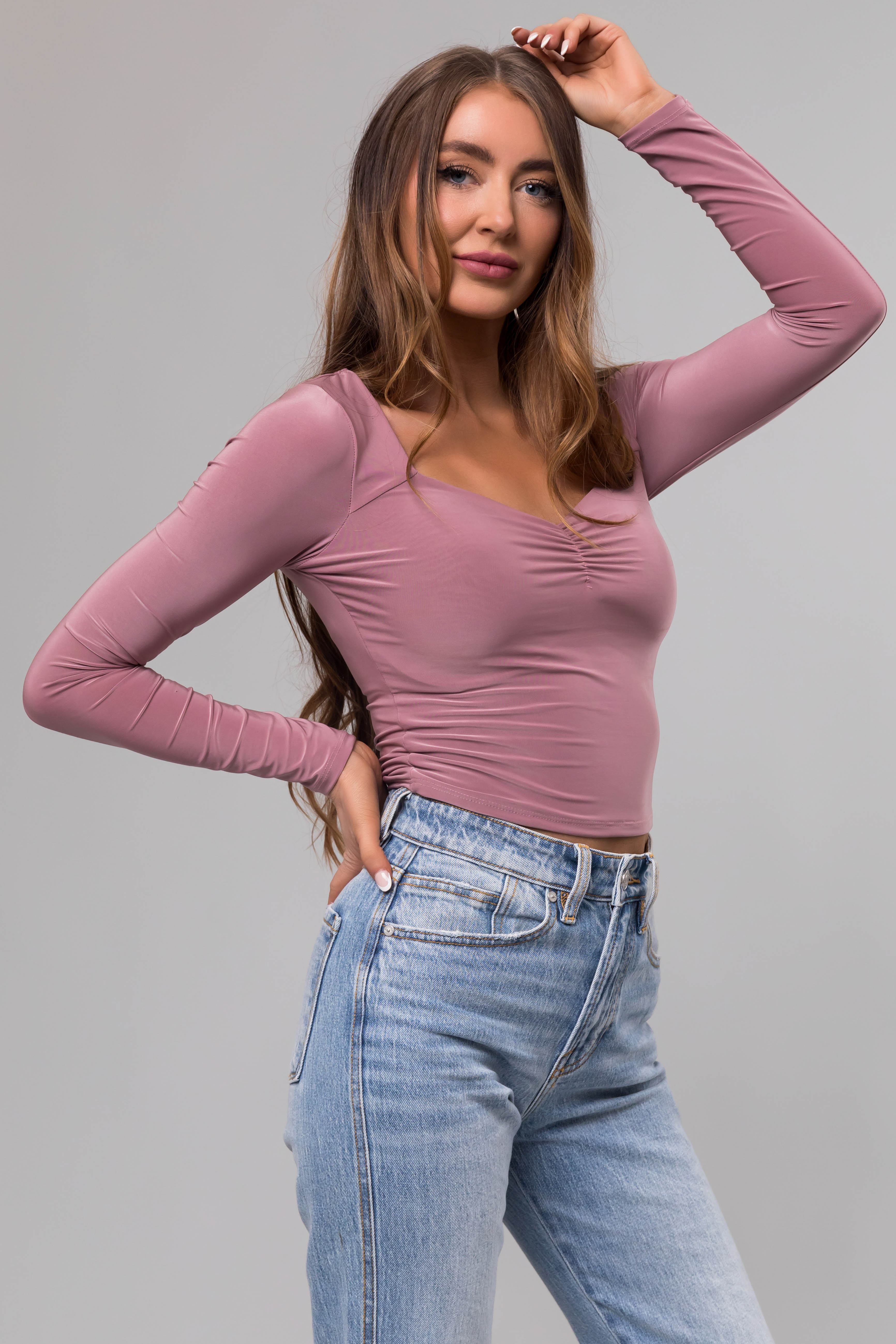 Elevate your style with our Mauve Sweetheart Neck Long Sleeve Crop Top. Available in sizes S, M, and L with exquisite details like a pinched neckline, fitted silhouette, and silky knit fabric. Crafted from 92% Polyester and 8% Spandex, this top offers a flattering fit and comfortable stretch. Perfect for daytime outings or casual events. Care instructions: Hand wash cold, hang to dry. Model is wearing a size Small.