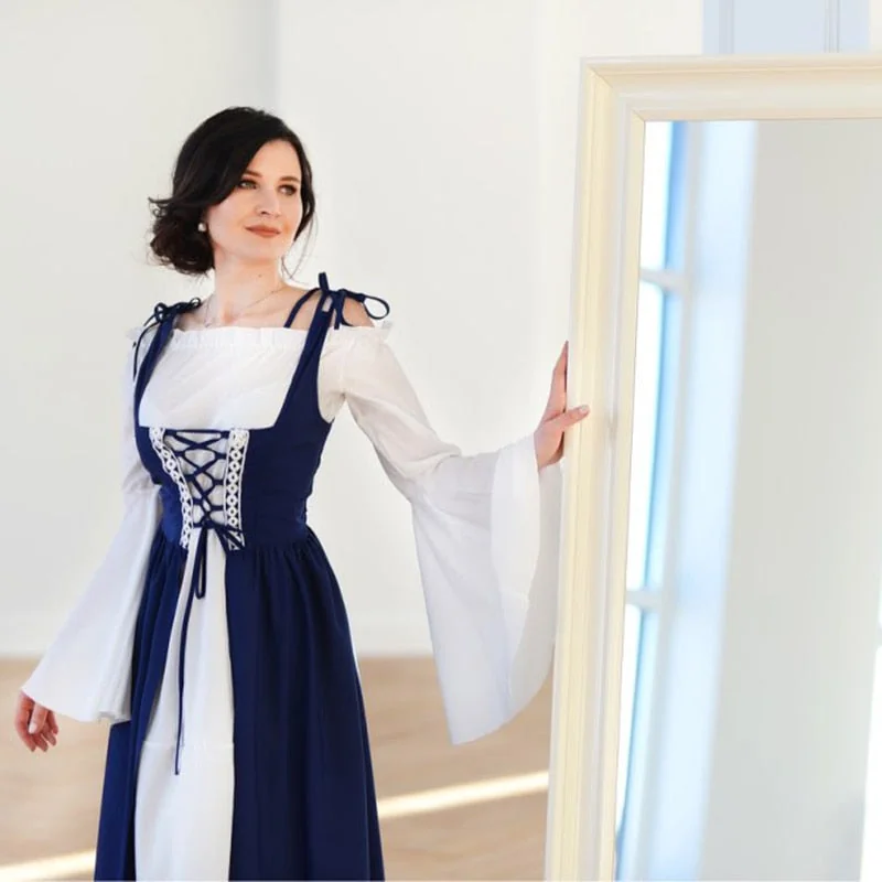 Discover the allure of the Medieval era with our exquisite Medieval Style Queen Gown. Perfect for Renaissance Fairs and Cosplay events, this gown features a white under-dress with a voluminous skirt, flared sleeves, and a colorful overlay. The lace-up corset front adds a touch of authenticity. Carefully crafted from a Cotton/Polyester Blend for comfort and durability. Refer to our size guide for accurate measurements. Make a grand entrance and command attention in this regal attire!