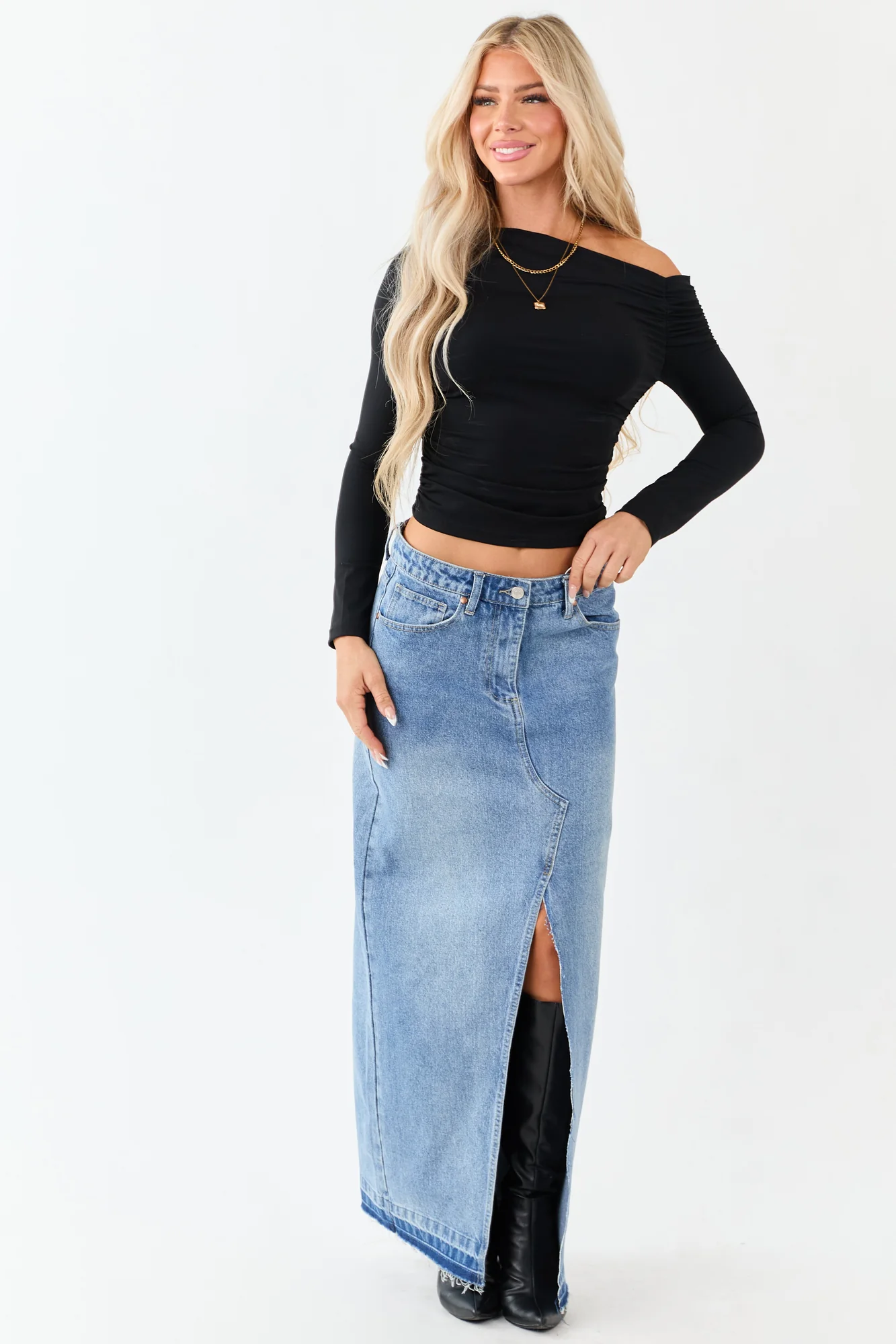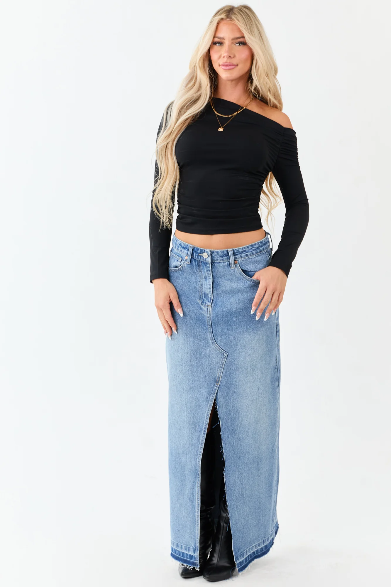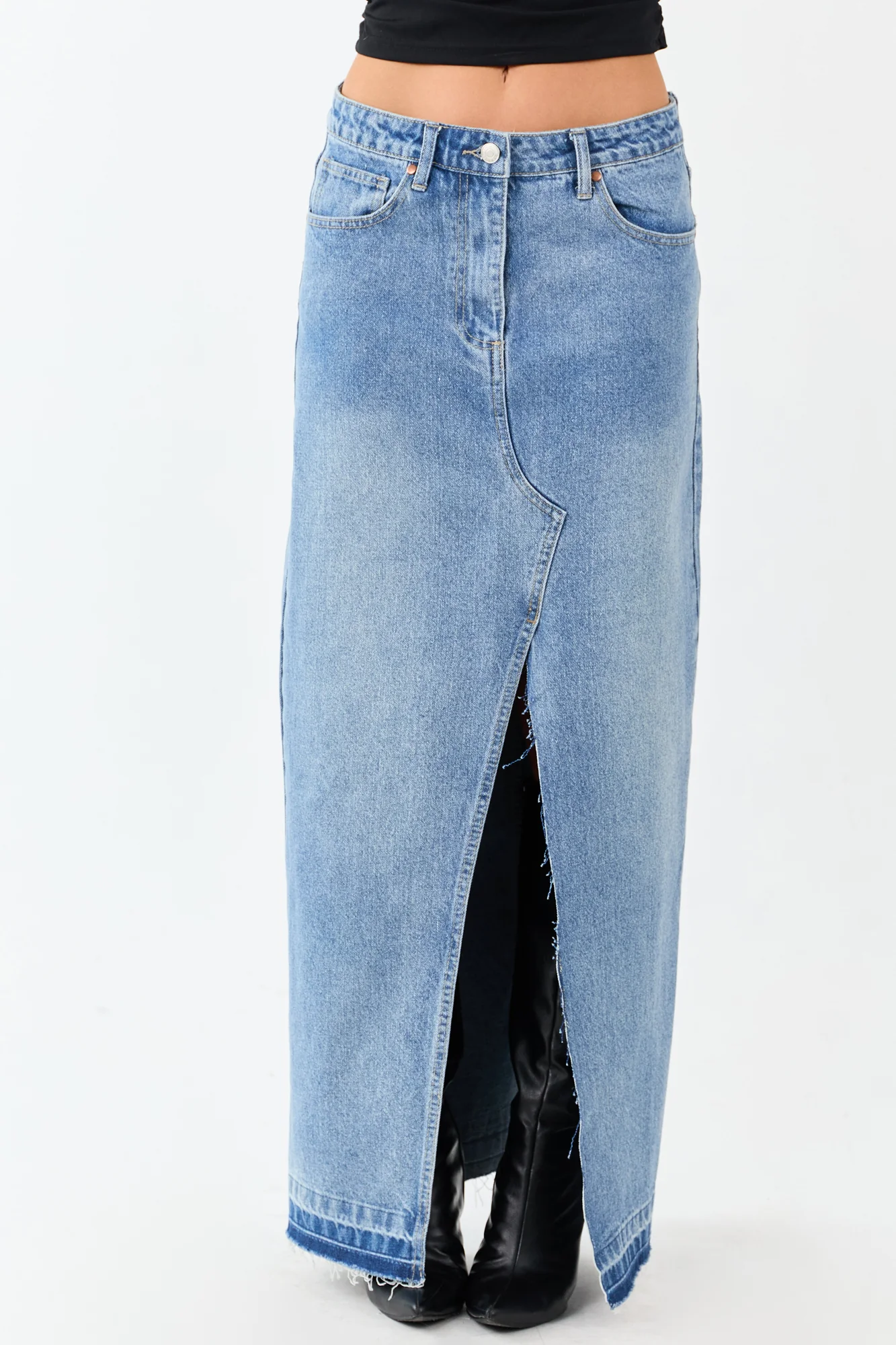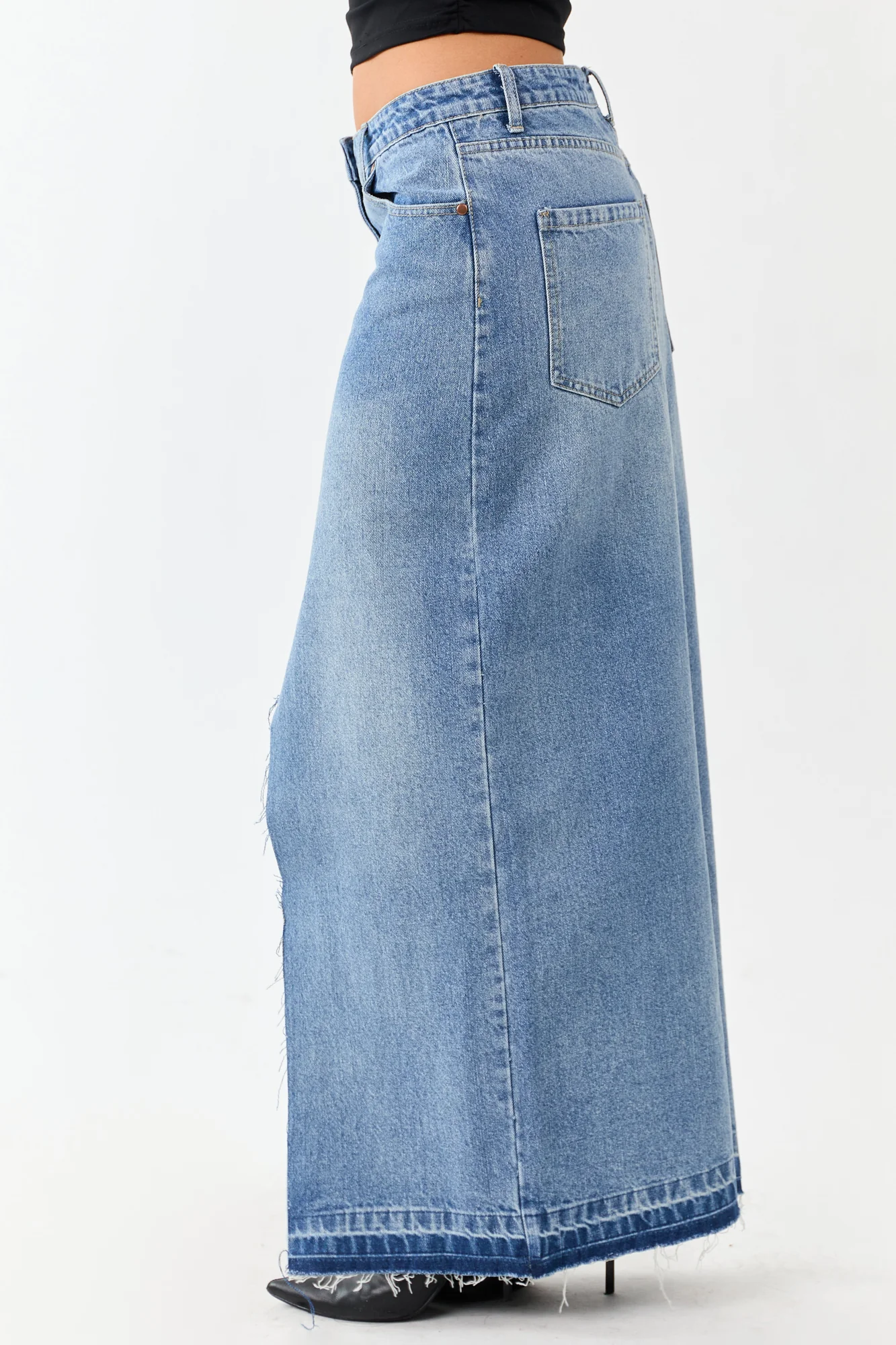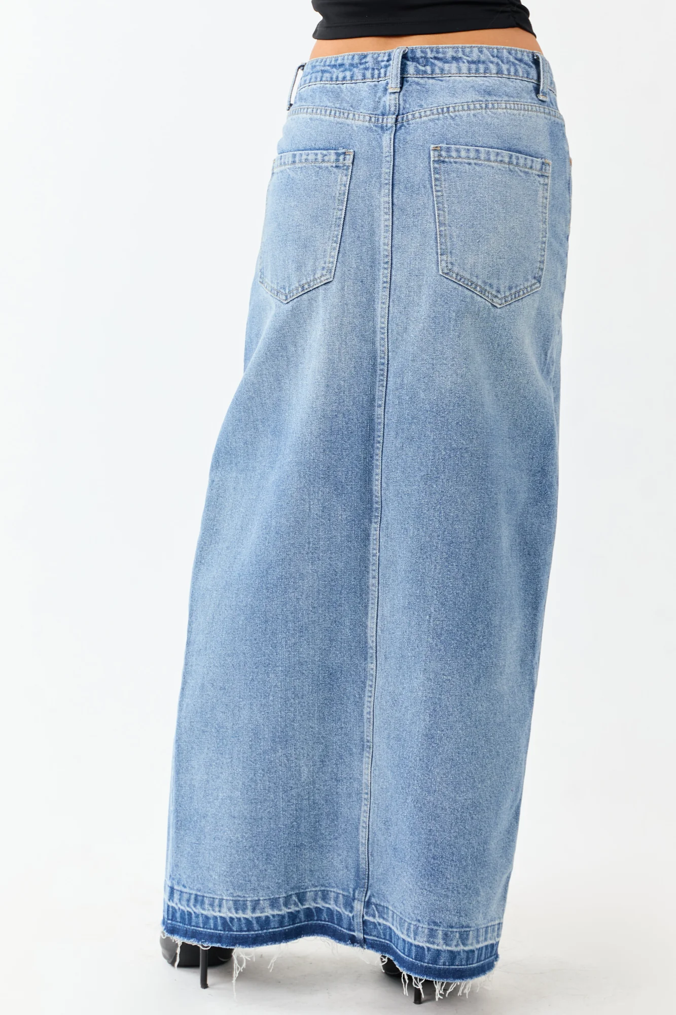 Enhance your wardrobe with the trendy Medium Blue Denim Maxi Skirt featuring a stylish released hem. Crafted from durable 100% cotton denim, this non-stretchy skirt offers both style and comfort. Detailed with a front slit, 5 pockets, and a zippered fly with button closure. Perfect for casual outings or dress it up for a night out. Available in size Small (Waist: 30″, Hip: 36″, Length: 40.5″). Model is wearing a size Small.