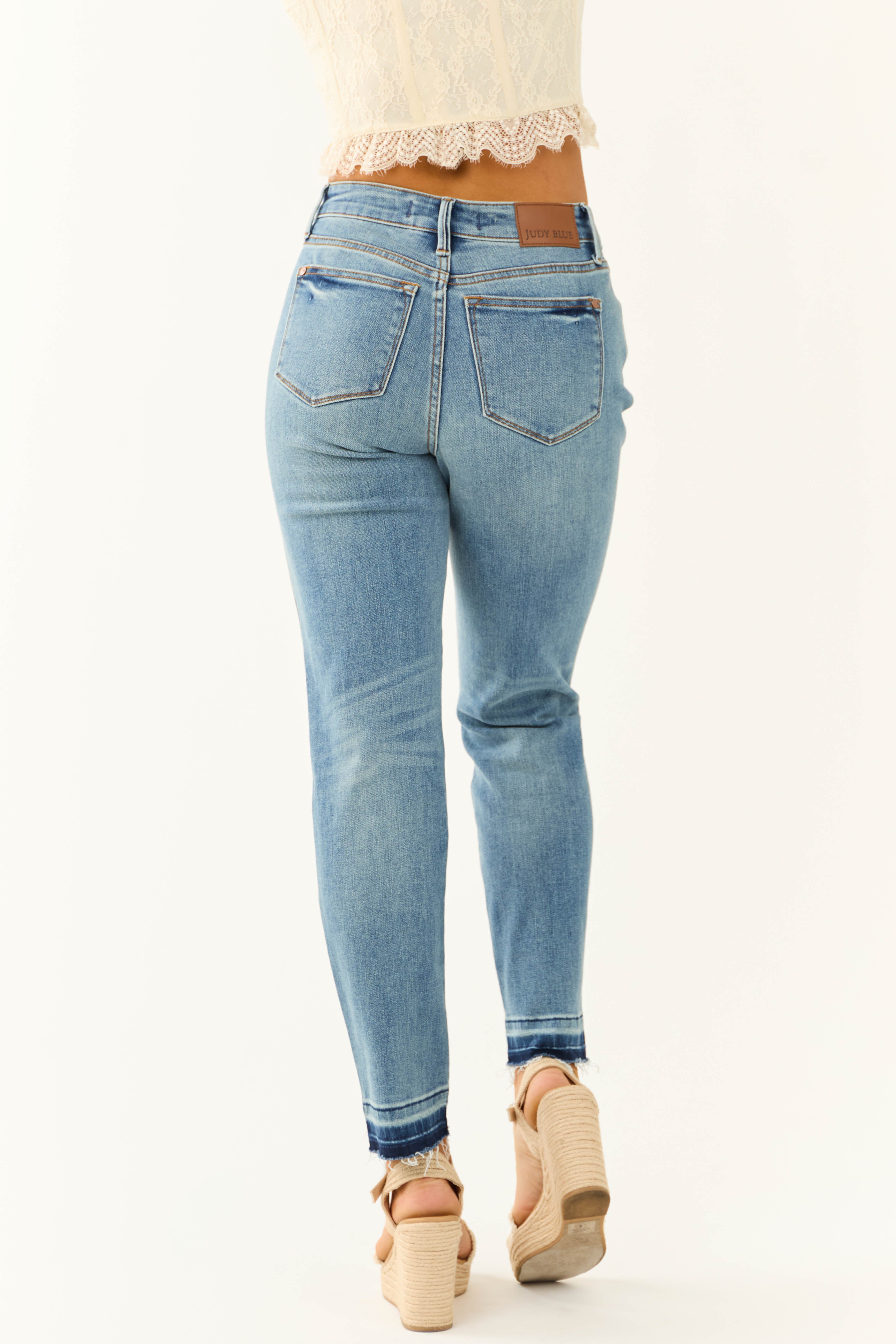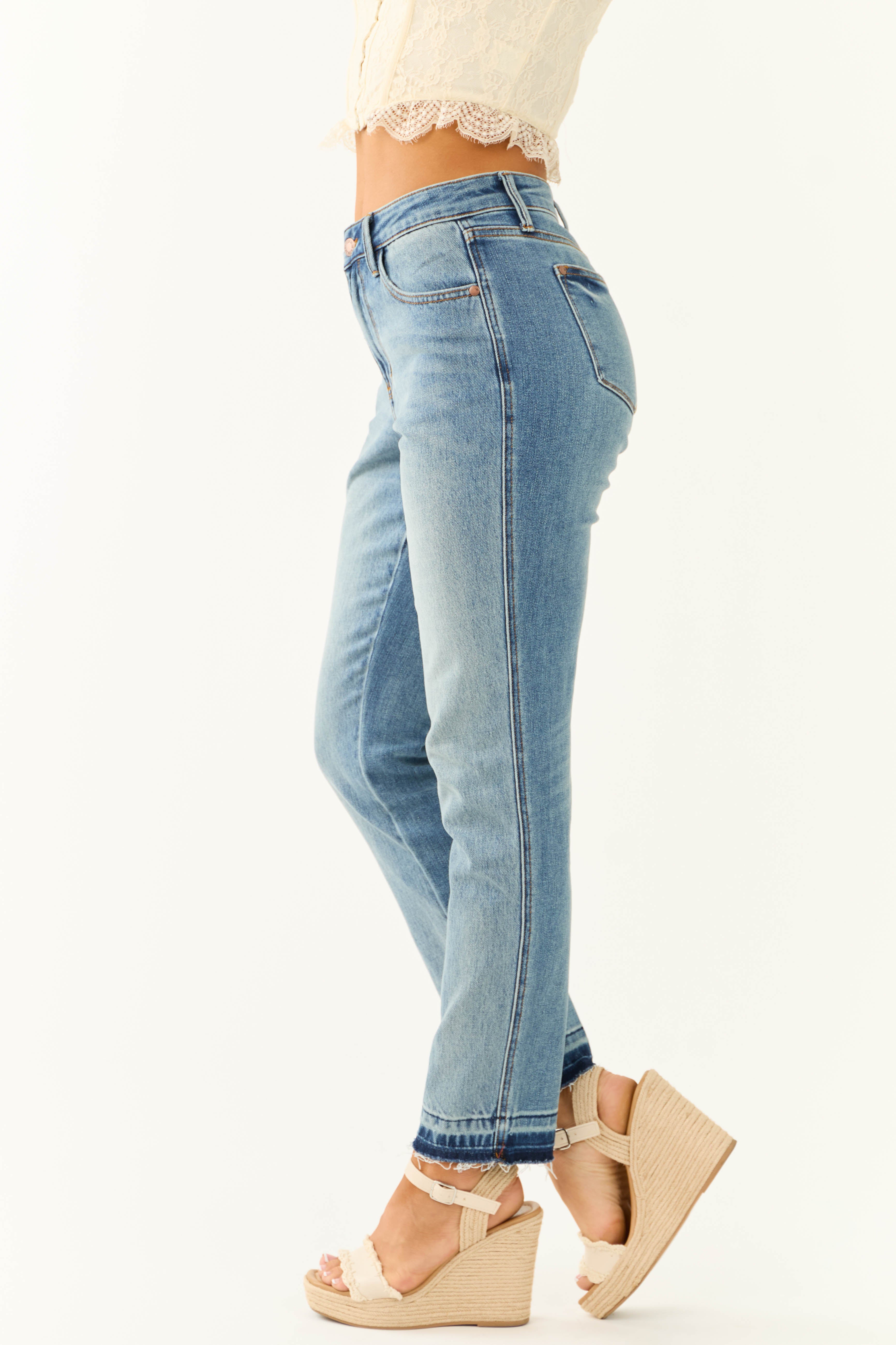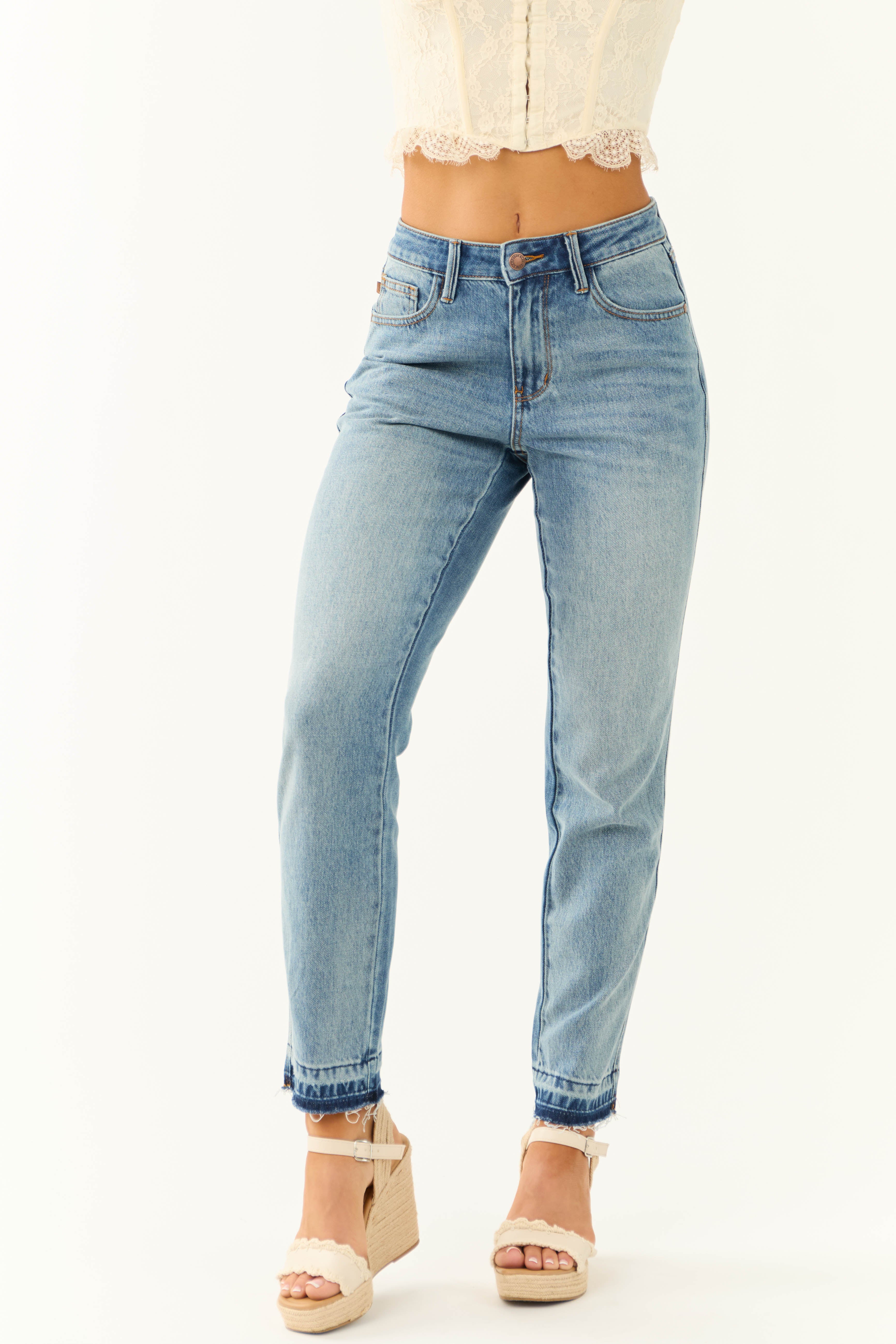 Upgrade your wardrobe with these stylish Medium Blue Straight Leg Denim Jeans. Offering a magical blend of comfort and style, these jeans feature a stretchy front and a non-stretchy back. With a mid-rise design and distressed hem, these jeans ensure a flattering fit for all-day wear. The 5-pocket styling, zipper fly with button closure, and belt loops add practicality to the fashion-forward design. Hand wash cold and lay flat to dry for easy care. Available in multiple sizes for the perfect fit.
