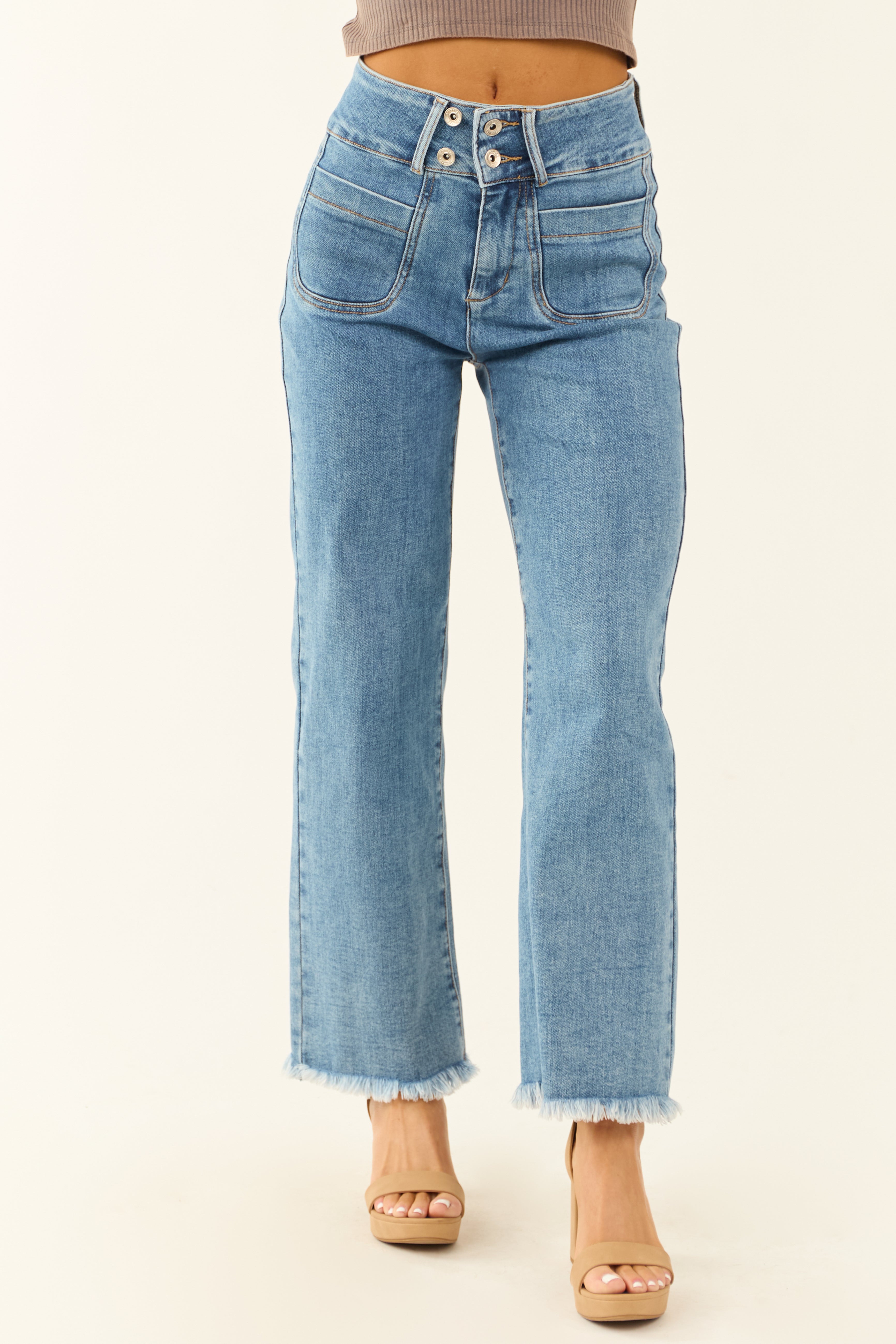 Upgrade your denim collection with these stylish Medium Wash Bootcut Ankle Jeans . These high-rise jeans feature stretchy denim for a comfortable fit, two functional pockets, belt loops, and a zipper fly with double button closure. The frayed hem adds a trendy touch. Made of 93% Cotton, 5% Polyester, and 2% Spandex, these jeans are perfect for casual outings and everyday wear. Available in sizes 1 to 15 with inseam options. Model is 55″ tall, wearing size 1.