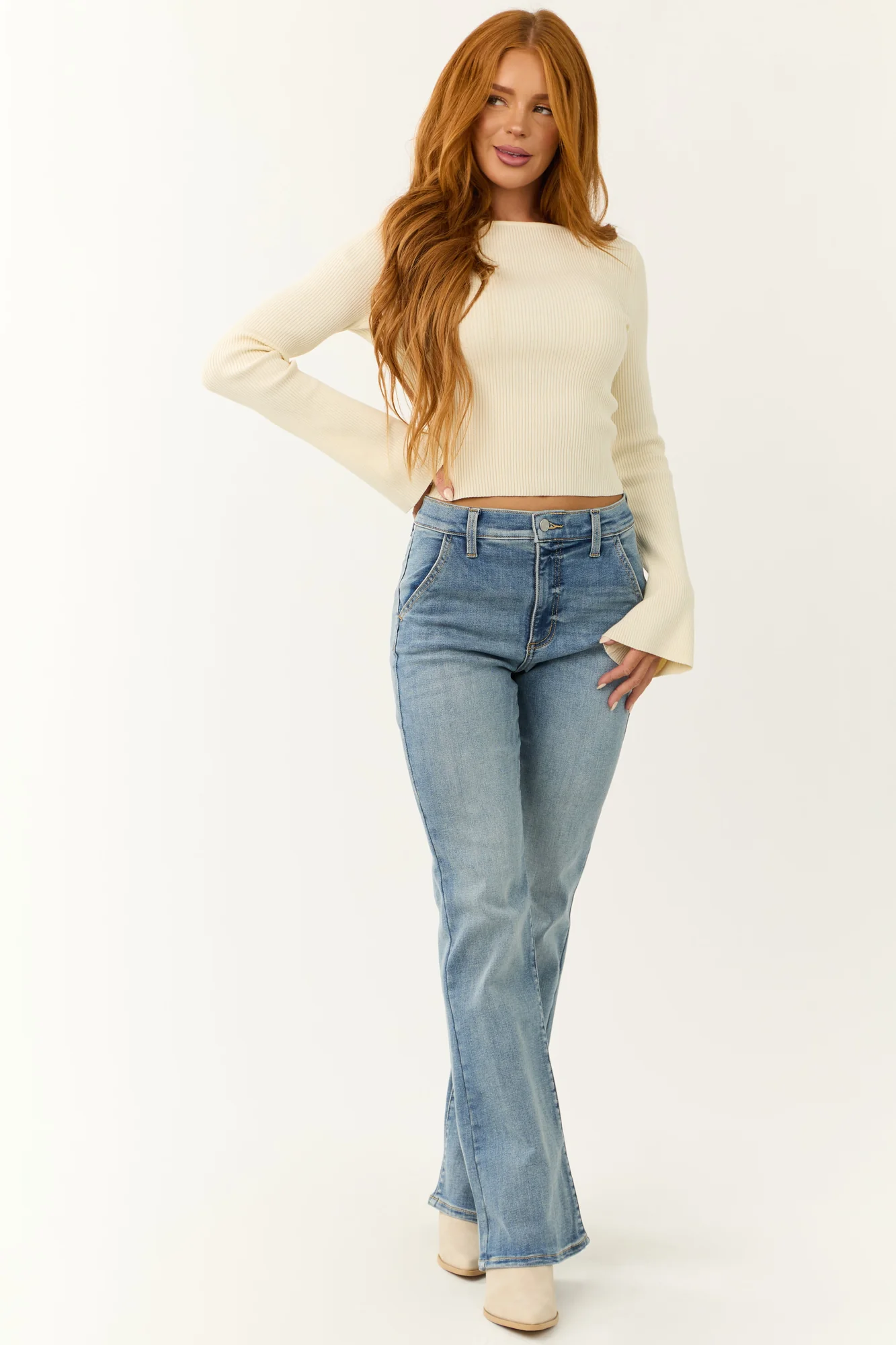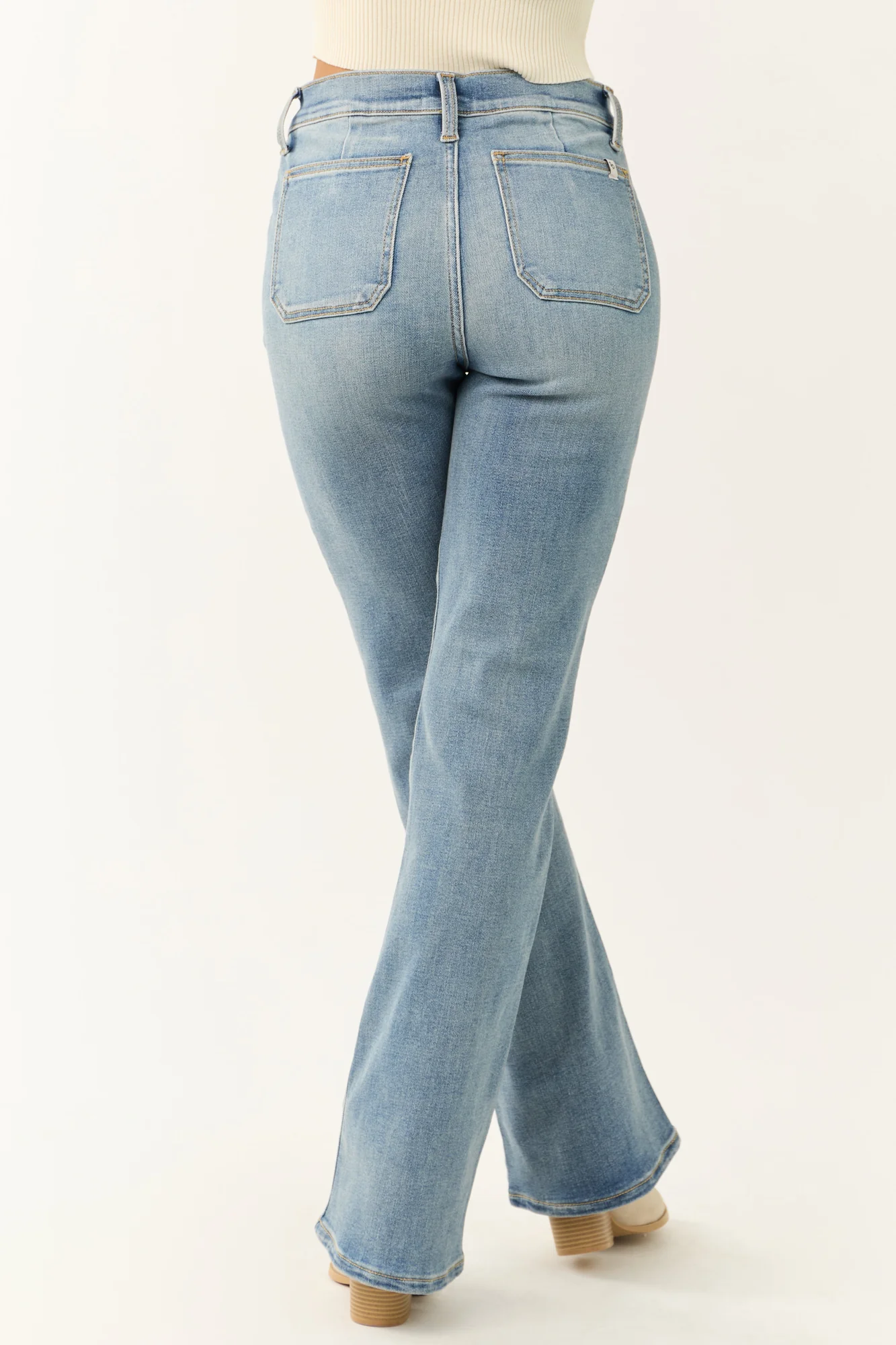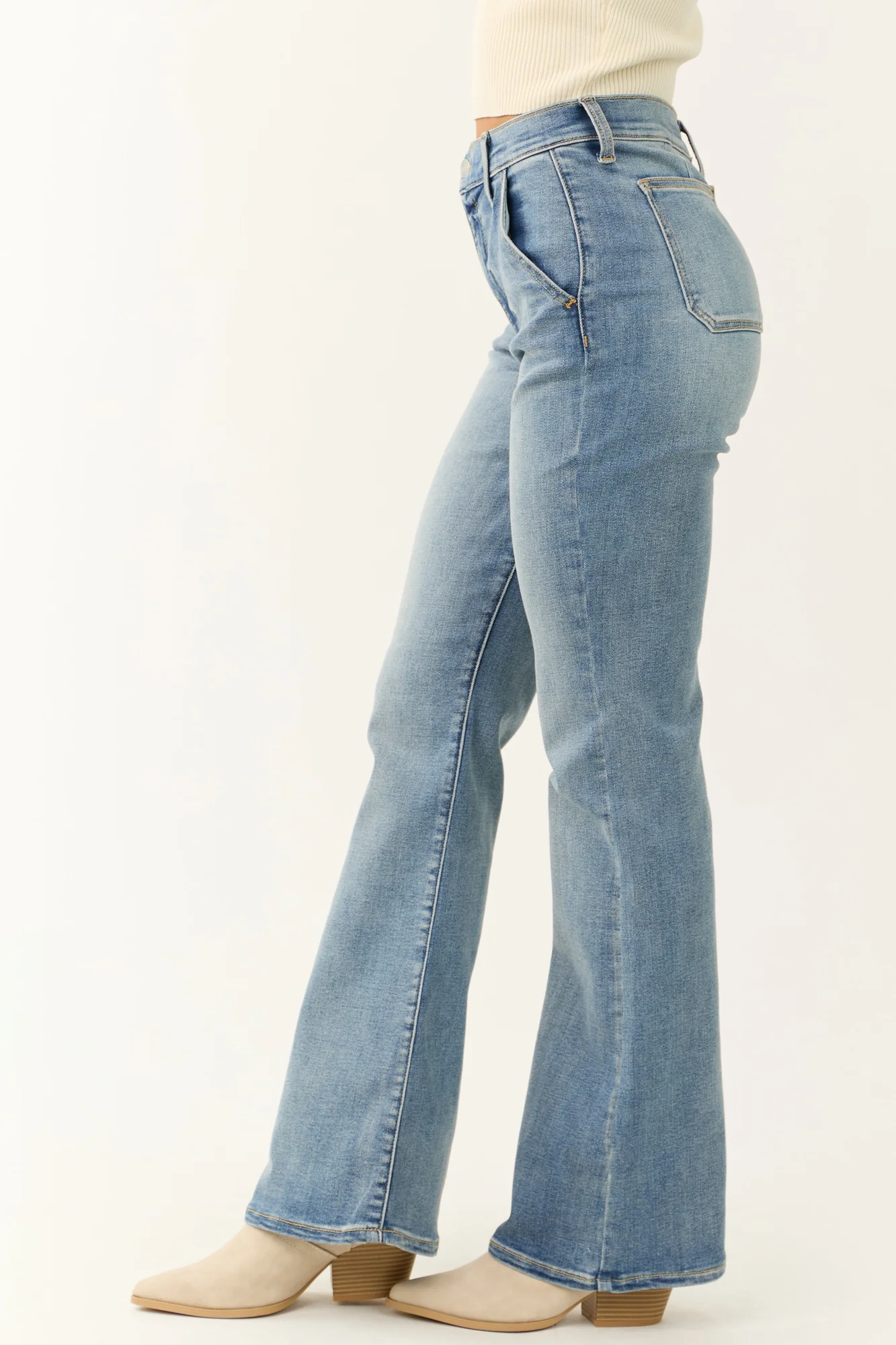 Elevate your denim game with our Medium Wash Bootcut Jeans. Crafted from a stretchy blend of 69% Cotton, 16% Polyester, 9% Rayon, and 1% Spandex, these jeans provide comfort and style. Featuring a high rise fit, zippered fly with button closure, and belt loops, these non-distressed jeans offer a classic look. The 4-pocket design and 30.5″ inseam make them perfect for daily wear. The waistband fits slightly loose and has a flexible range of 1-3″. Machine wash cold for best care. Model is 55″ wearing a size 25.