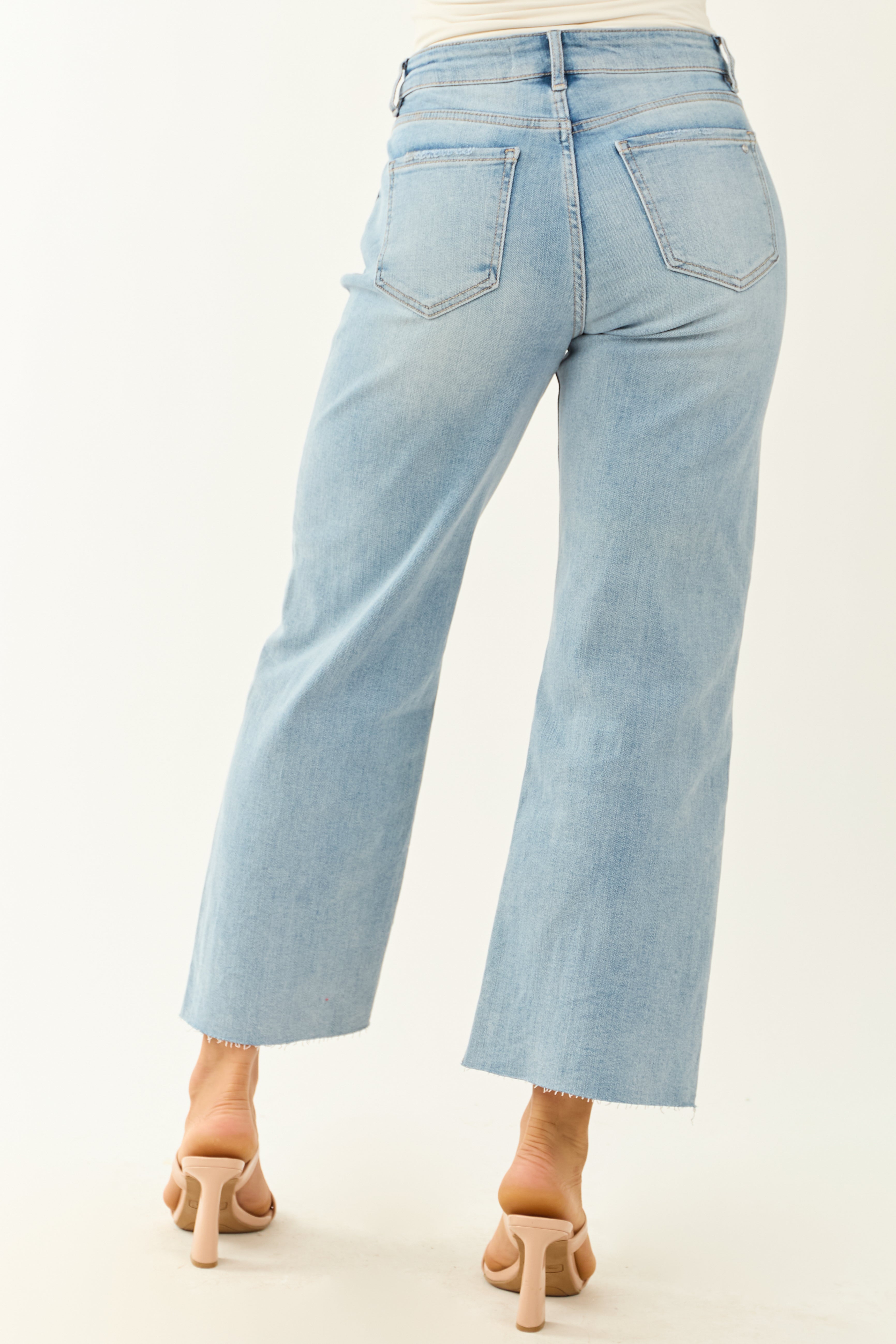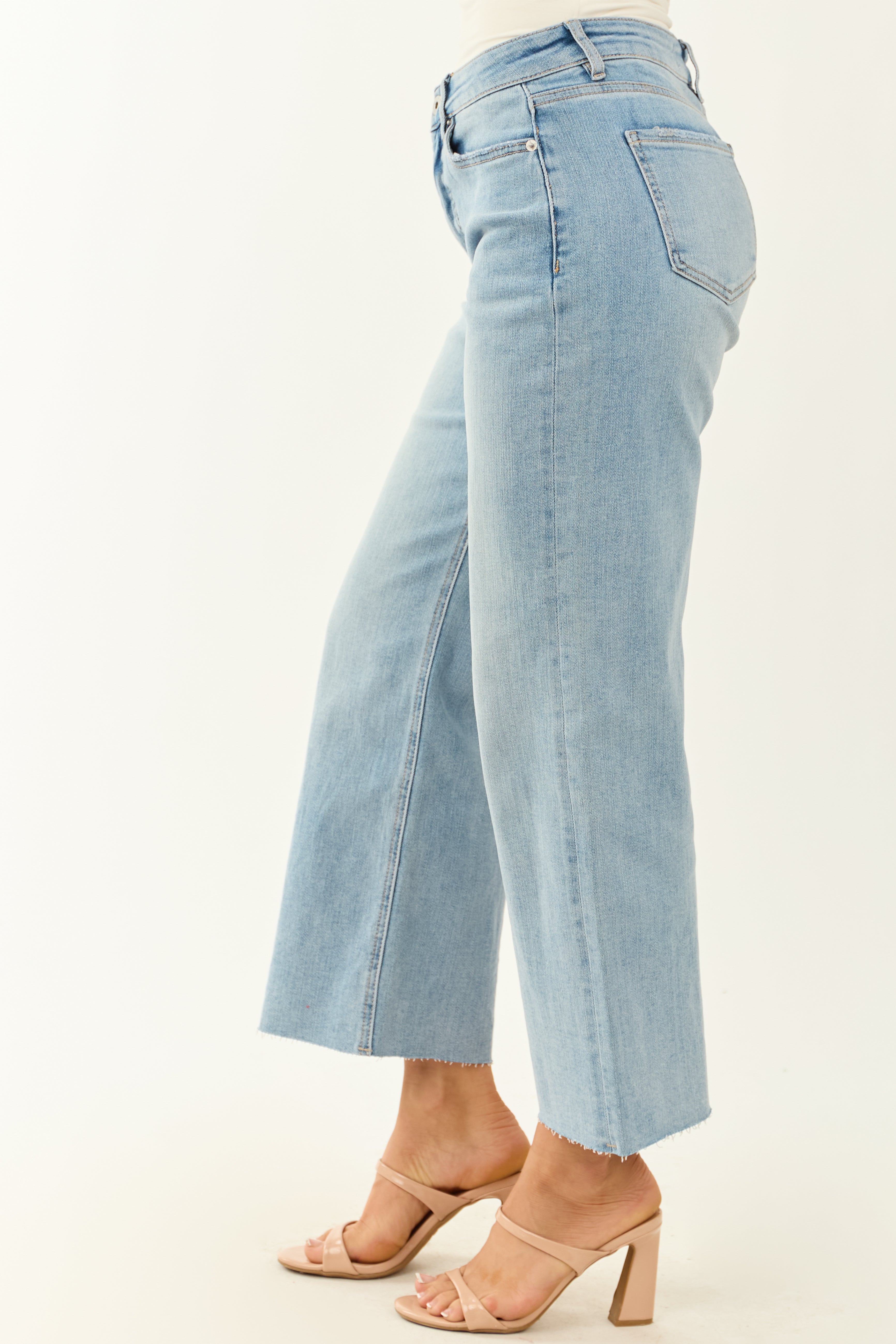 Achieve effortless, off-duty model style with these trendy wide leg jeans in medium wash denim. The cropped length showcases your statement sneakers or heels while offering extra comfort with stretchy fabric. These high-rise jeans feature a raw hem, five functional pockets, and a zipper fly for a versatile and chic look. Available in multiple sizes to fit various body types. Easy to care for, these jeans are a wardrobe essential for a fashionable everyday wear. Machine wash cold, tumble dry low.