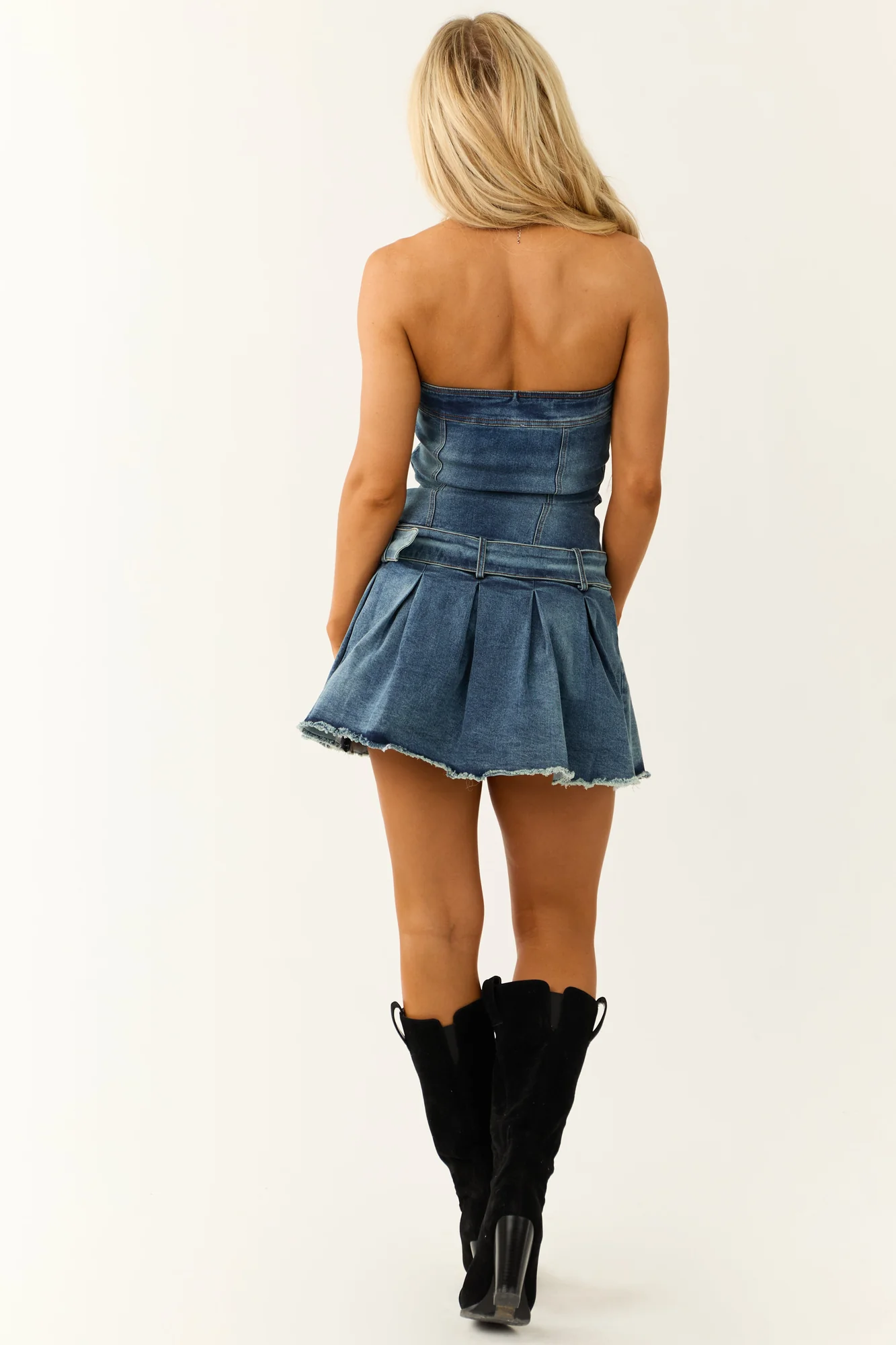 Stay stylish and trendy with our Medium Wash Denim Drop Waist Mini Dress . This strapless dress features a grip strip at the bust for no-slip confidence, pleated bottom, raw hem, and a chunky detachable belt for a personalized look. Crafted with 98% polyester and 2% spandex, it offers a stretchy and comfortable fit true to size. Imported design with no lining, ideal for date nights or daytime outings. Ensure longevity by dry cleaning only. Model is 57″ tall, size Small, 34″ bust, and 26″ waist.