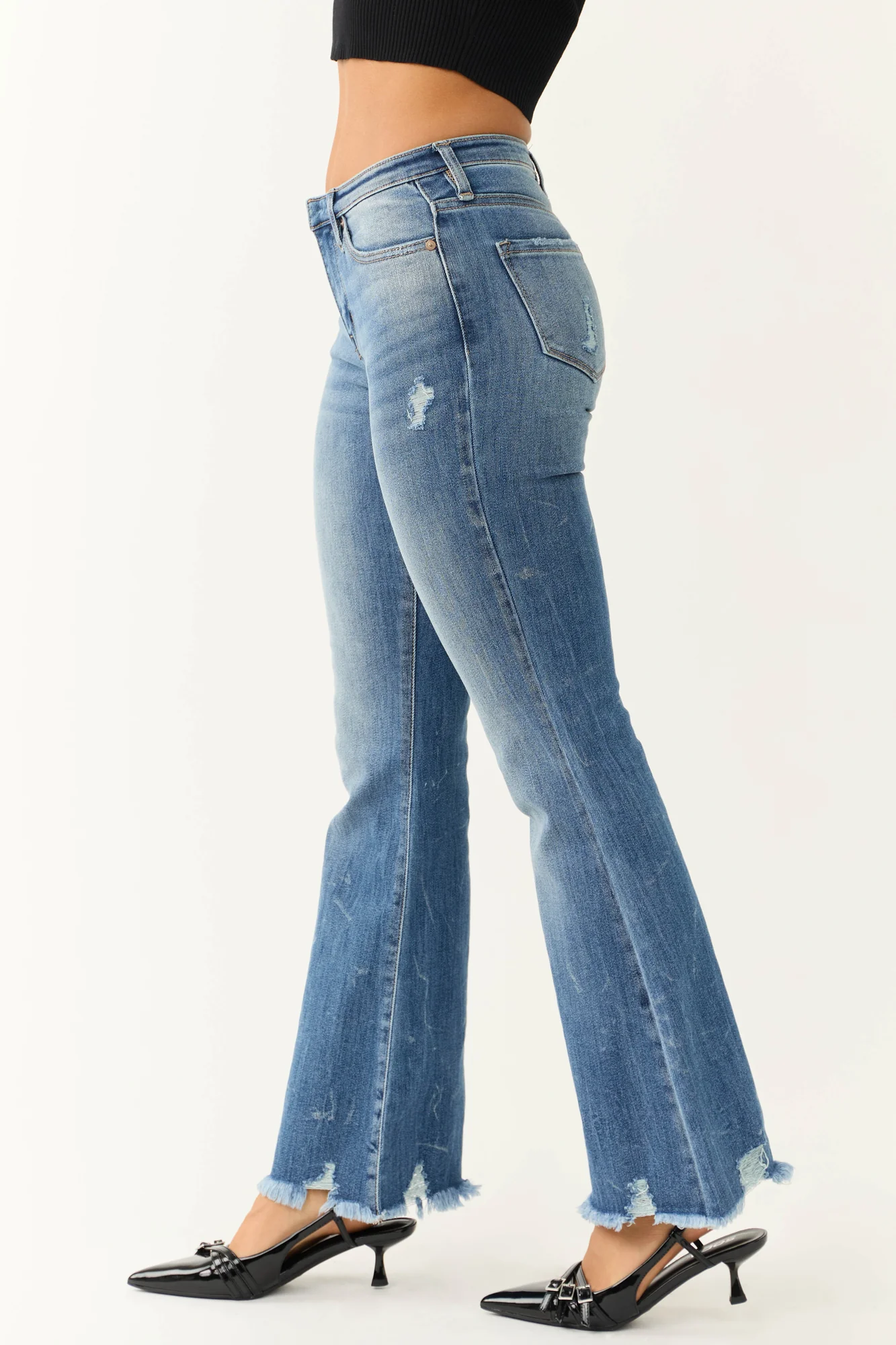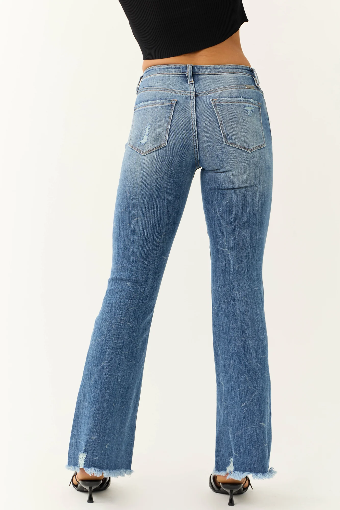 Upgrade your wardrobe with our fashionable Medium Wash Distressed Flare Leg Jeans for women . These jeans feature a mid-rise design with a front rise of 9 inches and a back rise of 12 inches, ensuring a comfortable fit. Crafted from a blend of 65.4% cotton, 30.3% polyester, 3% rayon, and 1.3% spandex, these jeans offer both style and stretch. The zipper fly with a double hook closure, five pockets, belt loops, and distressed hem add a trendy touch. Available in sizes 1 to 15 with inseam lengths of 30.5 inches. Care Instructions: Machine wash inside out in cold water, tumble dry low, and low iron if needed.